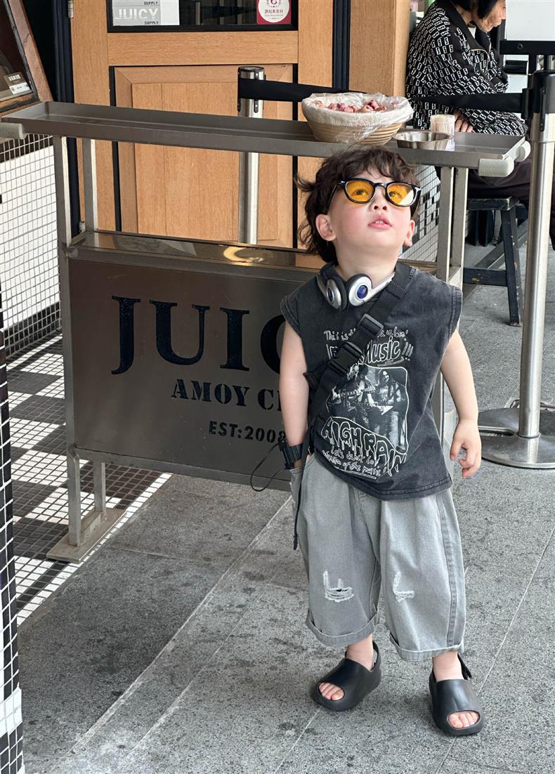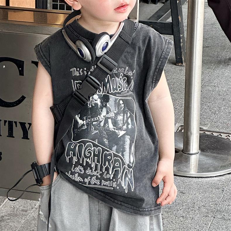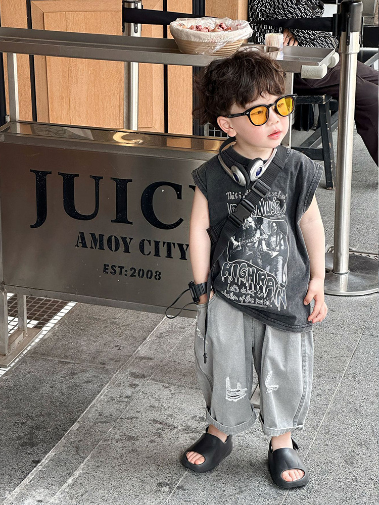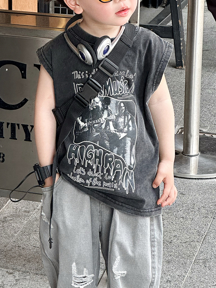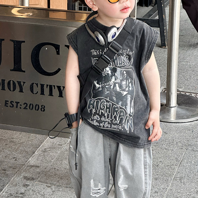 소년 여름 조끼 한국 스타일 어린이 만화 유행 잘 생긴 어린 소년 민소매 티셔츠 순수 코튼 탑스토어 가기