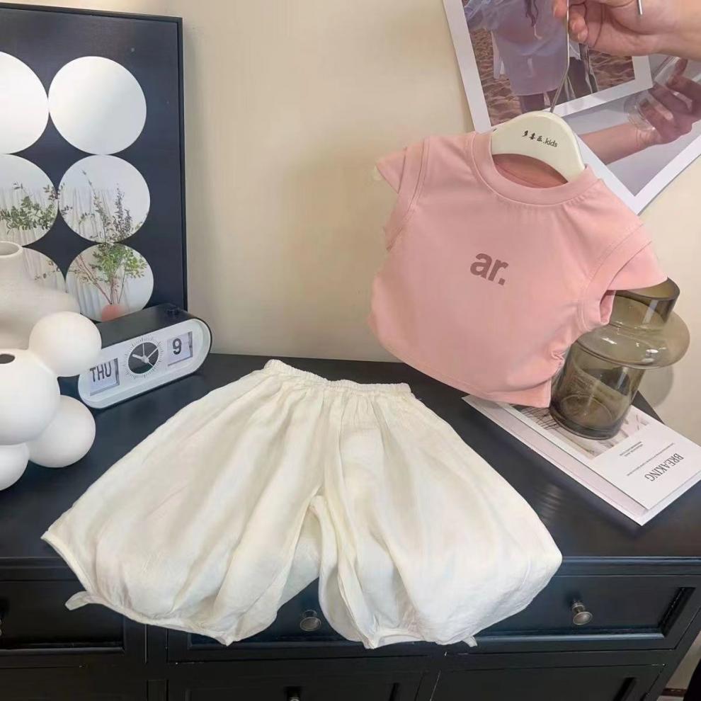 슈퍼 요정 소녀 여름 세트 2024 새로운 여성 아기 서양식 티셔츠 어린이 모기 방지 바지 바지 투피스 세트