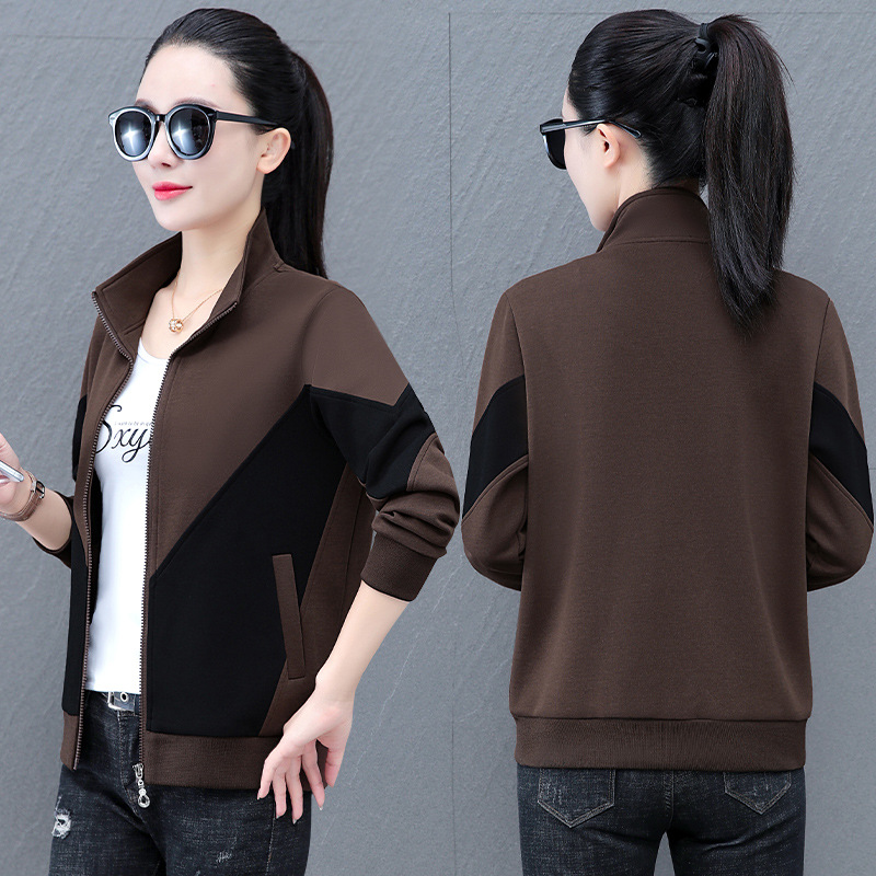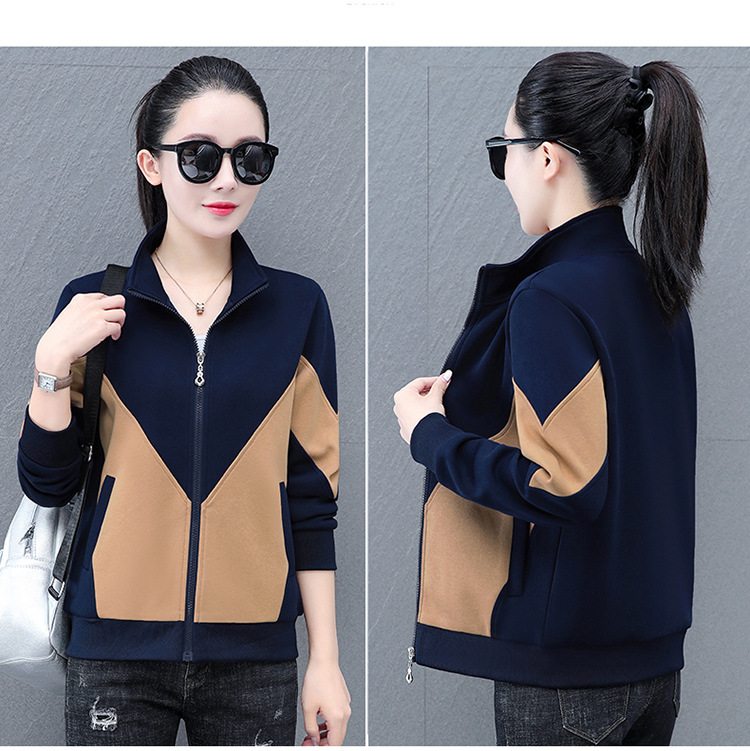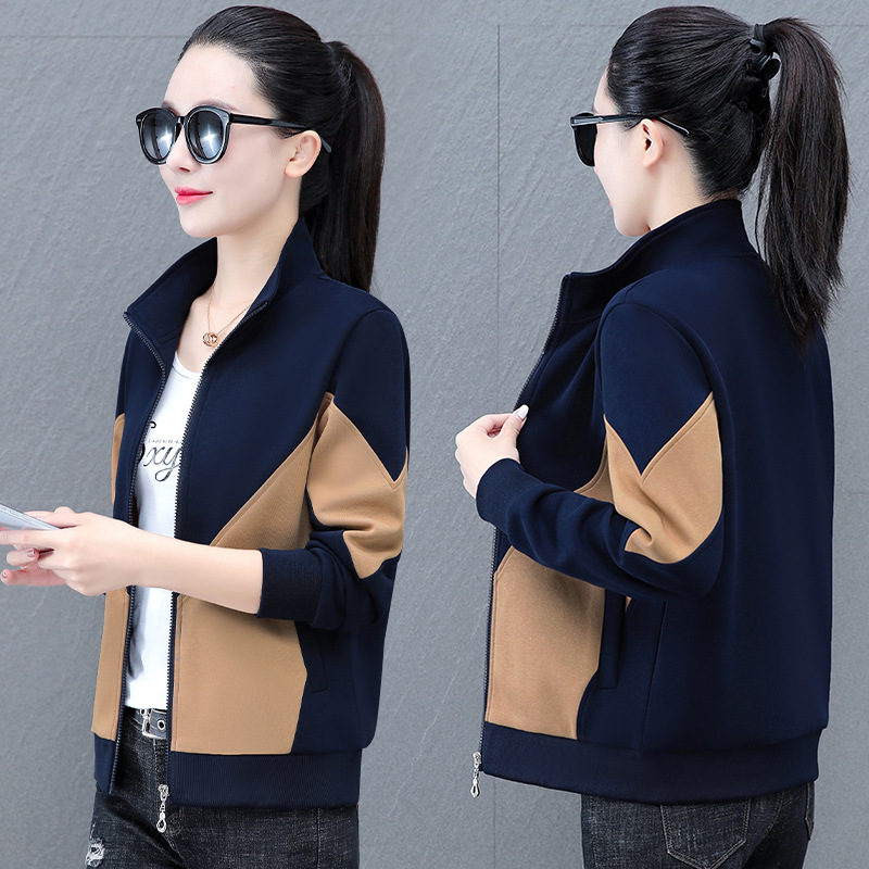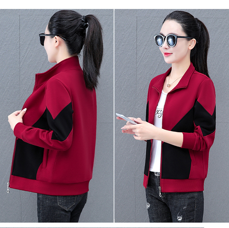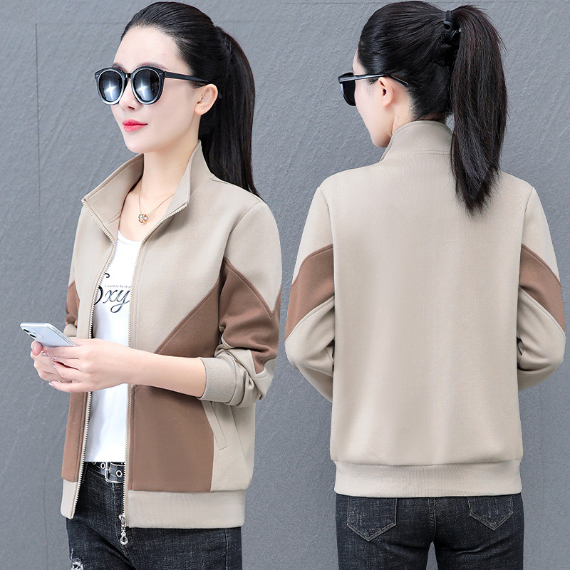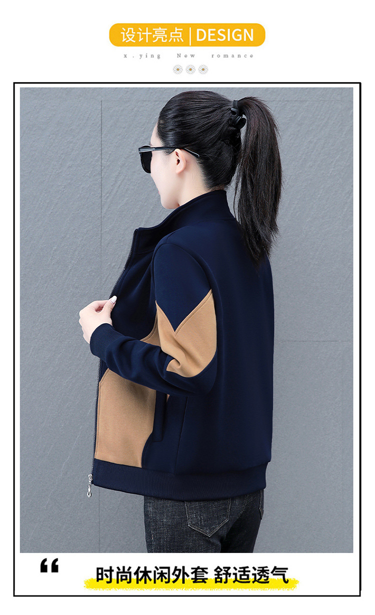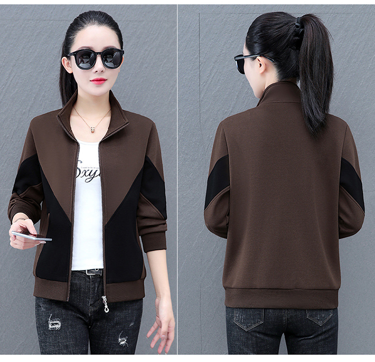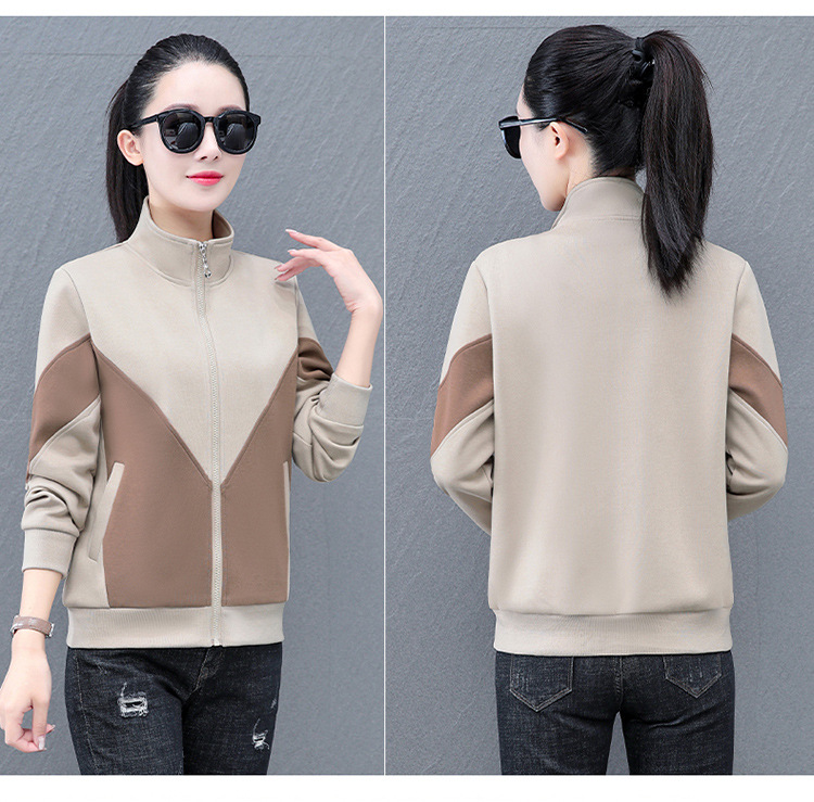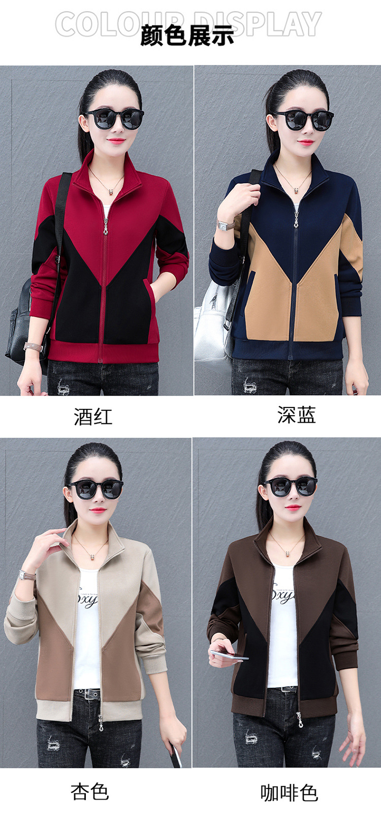 하이 코튼 대비 컬러 스탠드 칼라 패션 캐주얼 재킷 짧은 코트 여성 봄, 가을 새로운 중년 어머니 지퍼 카디건 스웨트 셔츠