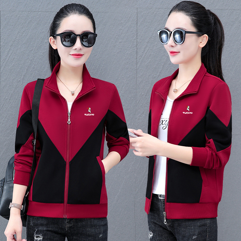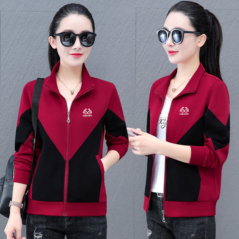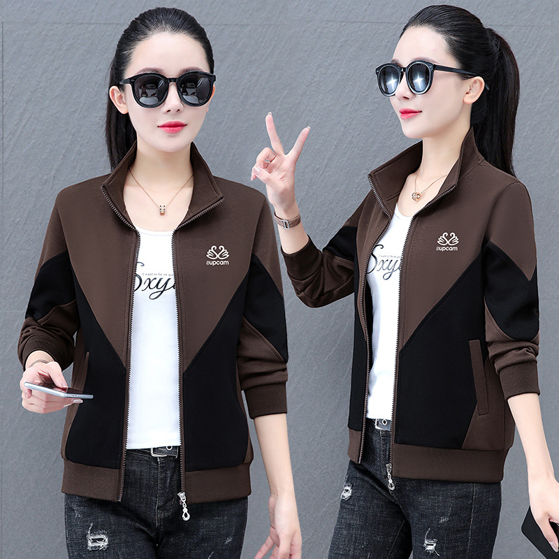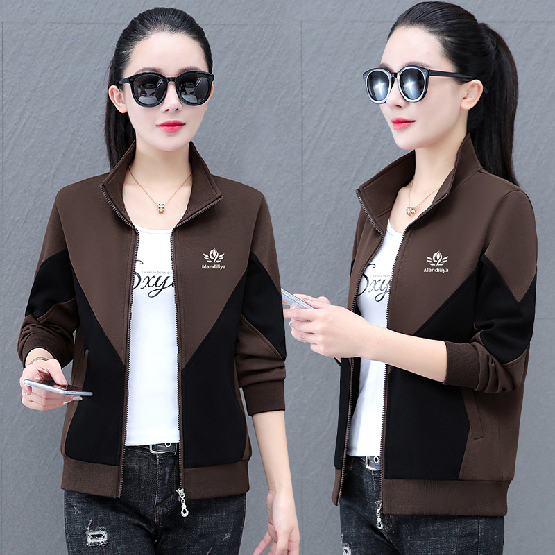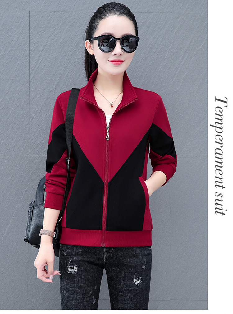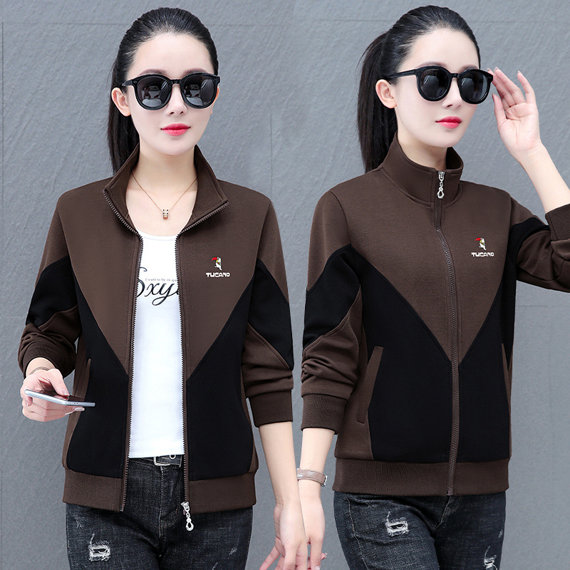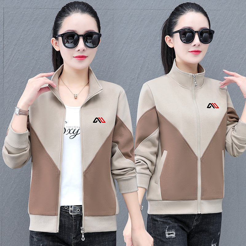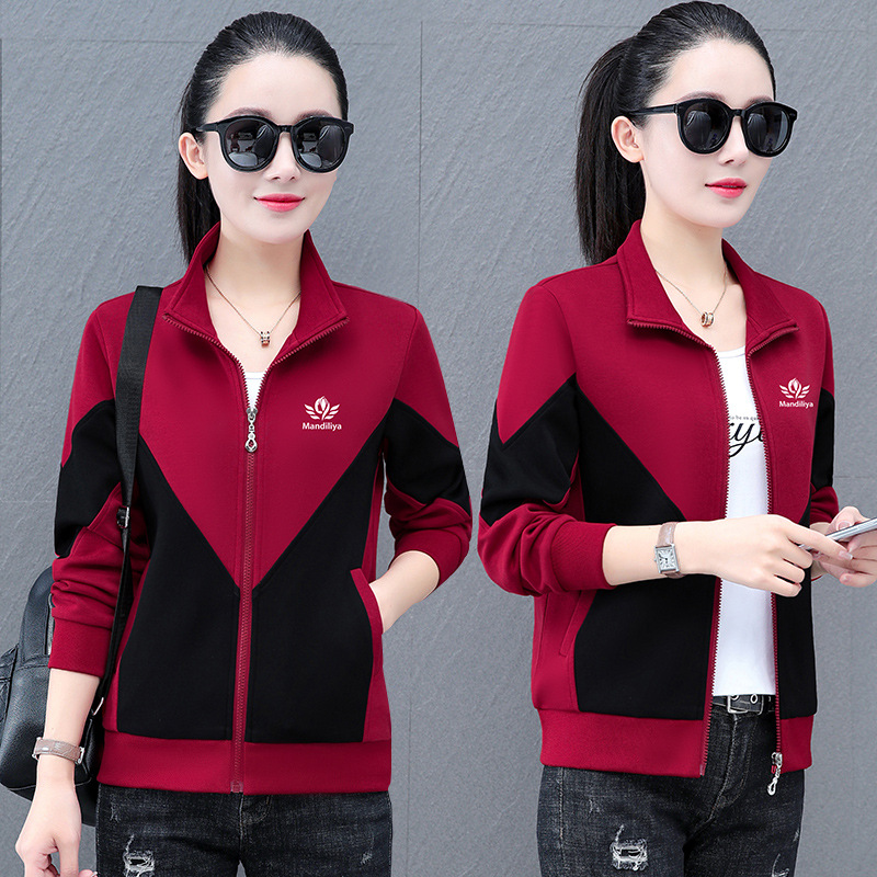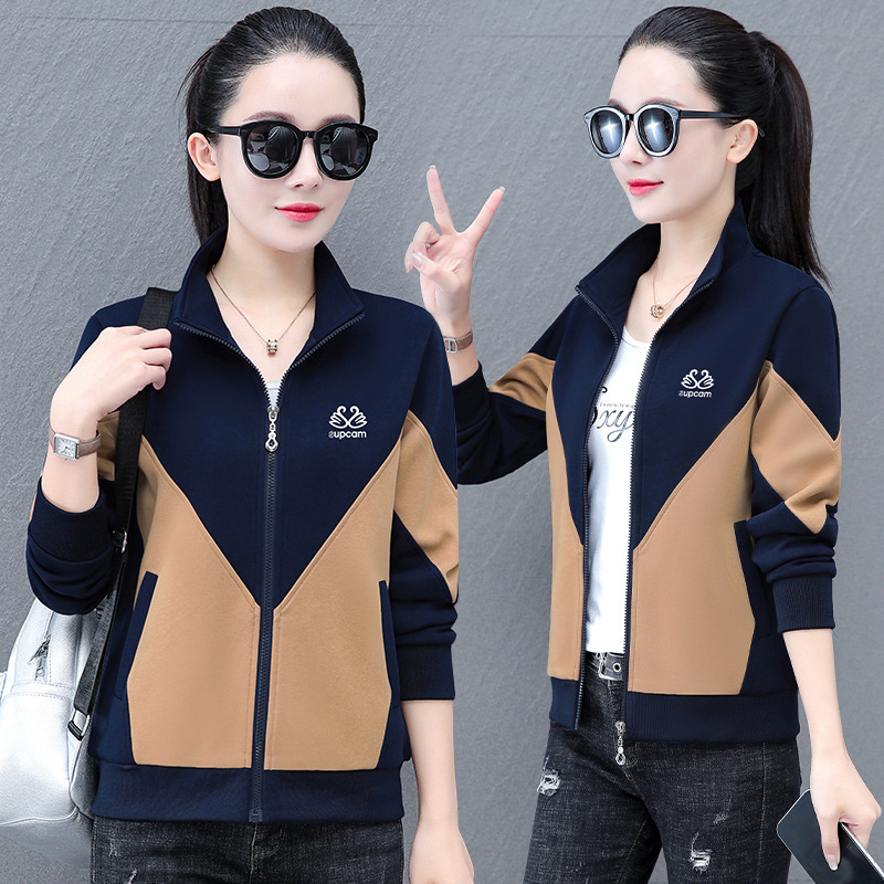 하이 코튼 대비 컬러 스탠드 칼라 패션 캐주얼 재킷 짧은 코트 여성 봄, 가을 새로운 중년 어머니 지퍼 카디건 스웨트 셔츠