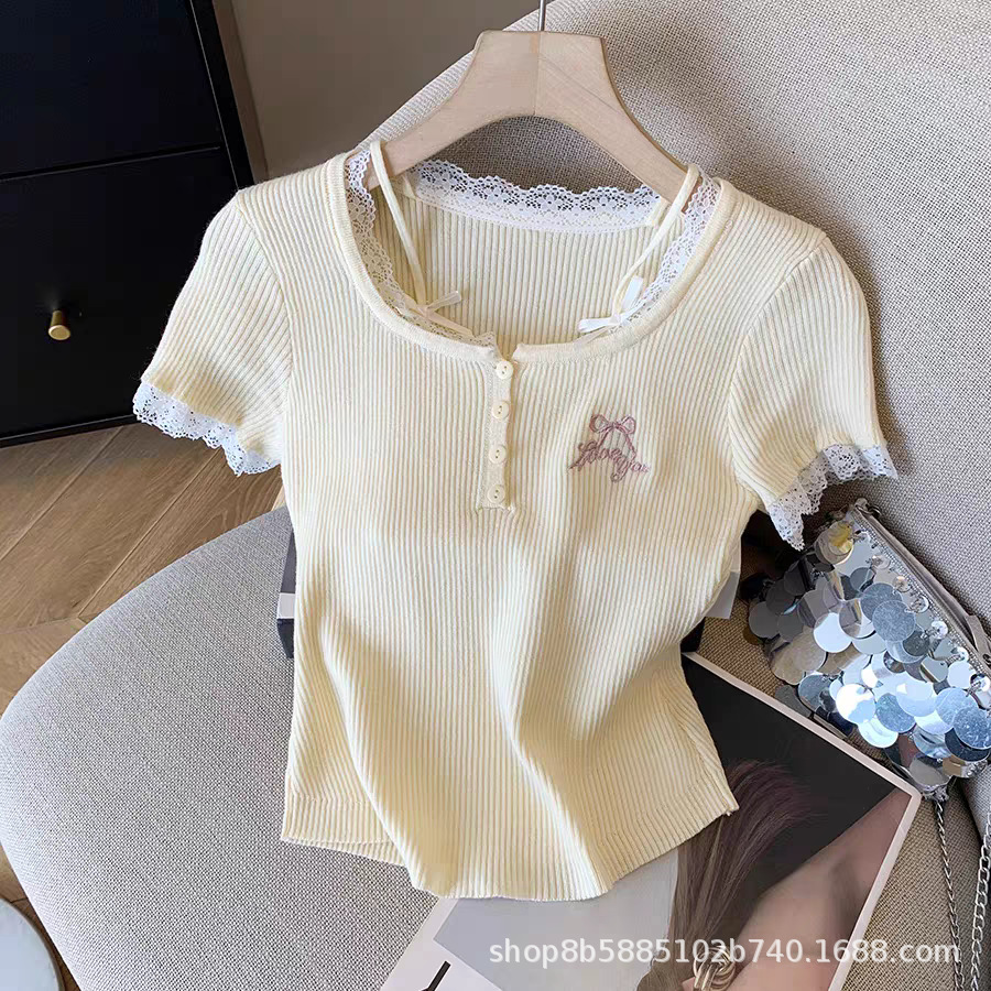 여자 반팔 티셔츠 여자 여름 2025 새로운 도착 자수 짧은 슬림 핏 슬리밍 레이스 자수 서양식 트렌디