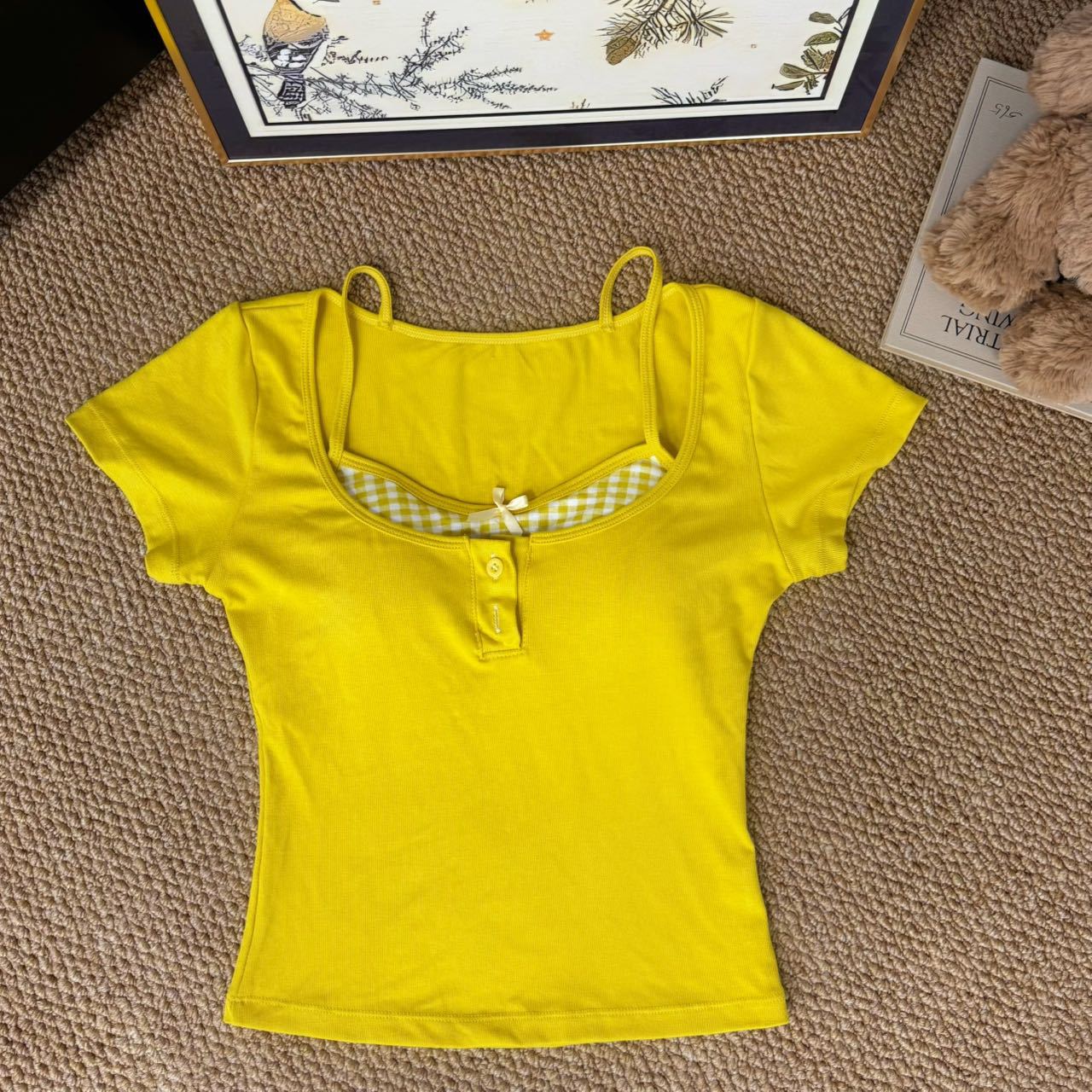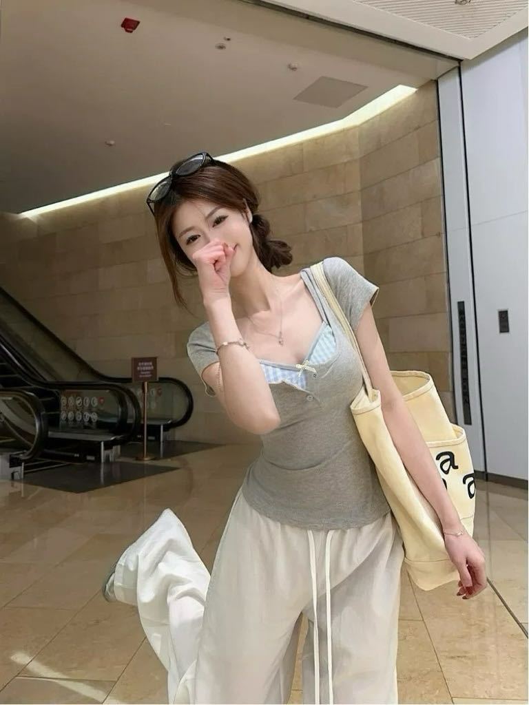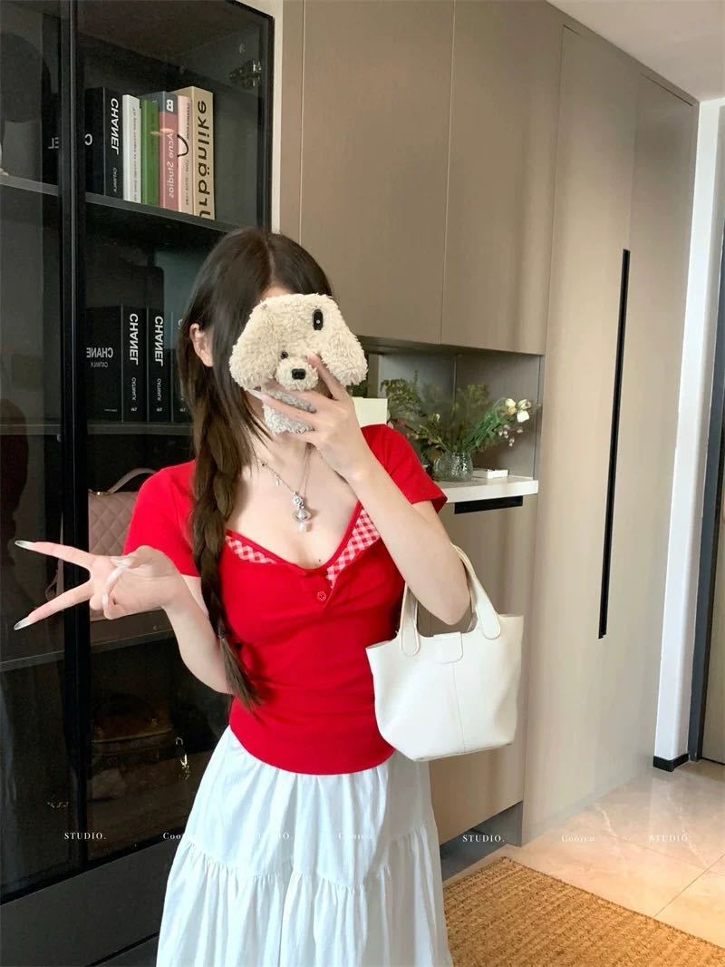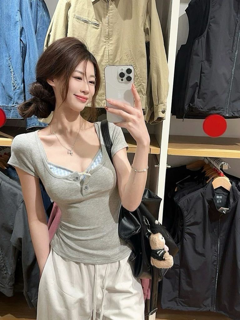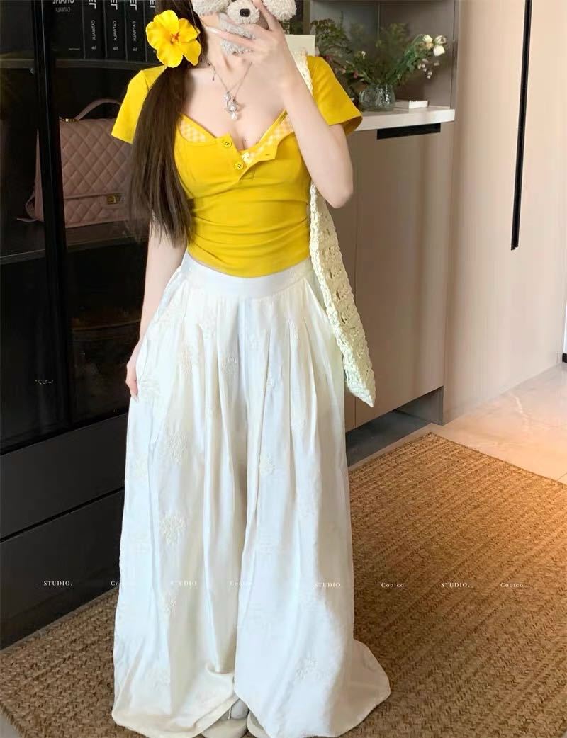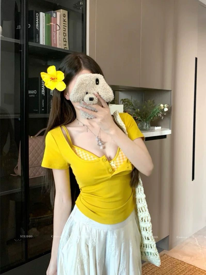 도파민 노란색 반 오픈 칼라 어깨 반팔 티셔츠 여성용 여름 디자인 센스 플리츠 슬림 핏 핫 걸 쇼트탑스토어 가기
