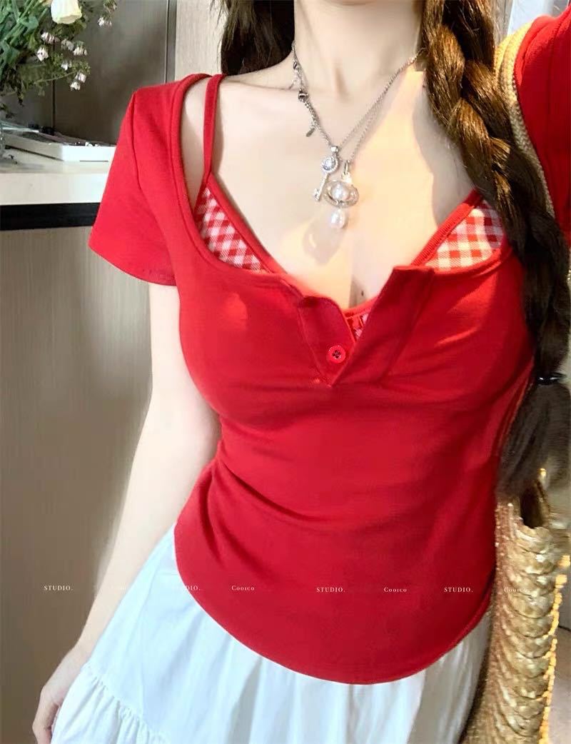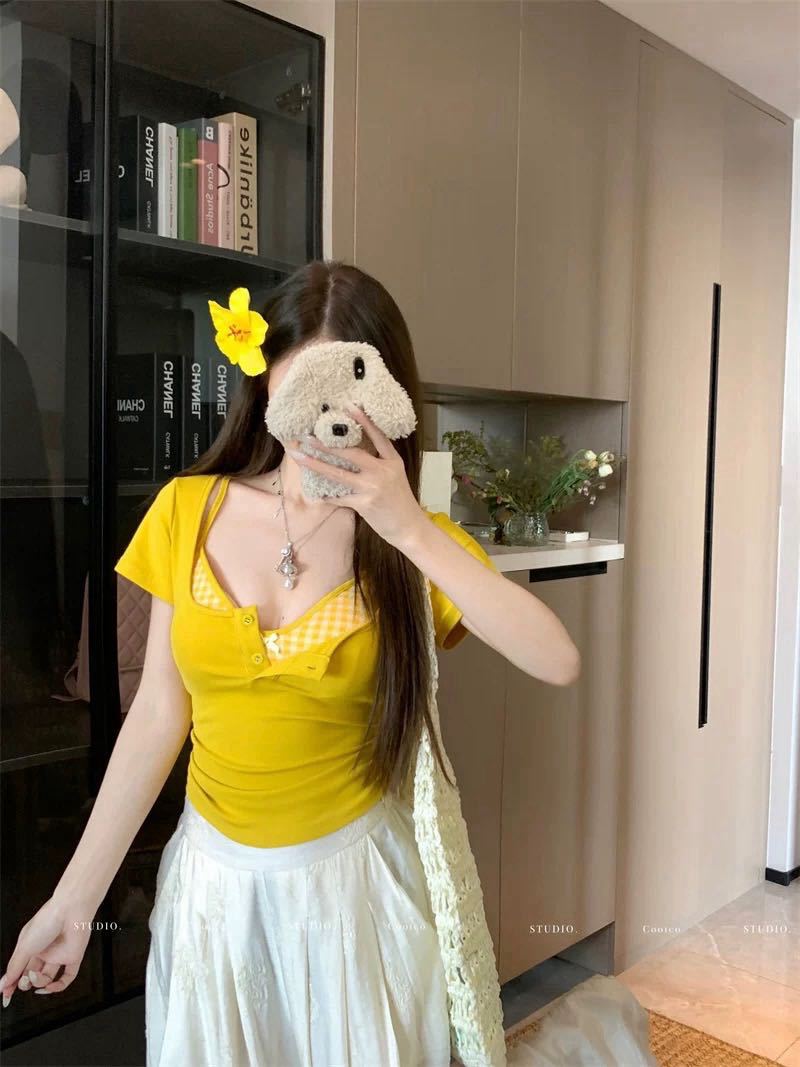 도파민 노란색 반 오픈 칼라 어깨 반팔 티셔츠 여성용 여름 디자인 센스 플리츠 슬림 핏 핫 걸 쇼트탑