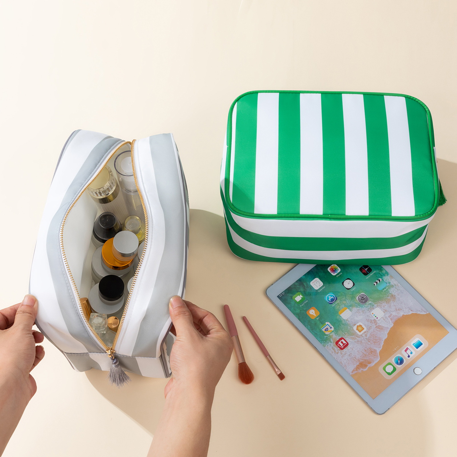 국경 간 여성 화장품 가방 스트라이프 휴대용 지퍼 워시 가방 방수 및 환경 친화적 인 나일론 여행용 수납 가방 도매스토어 가기