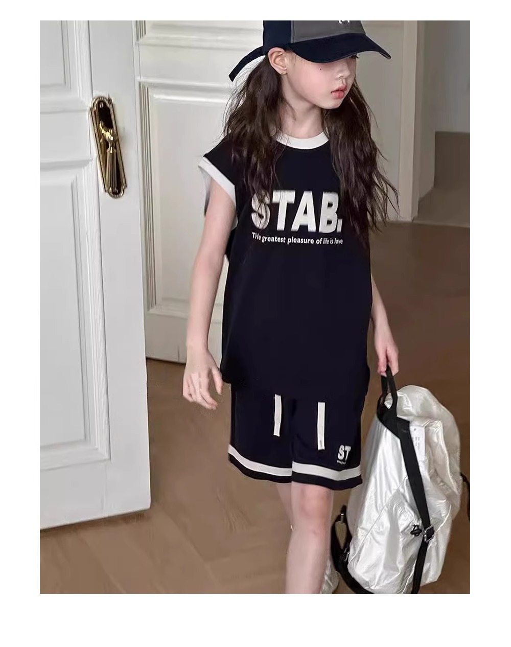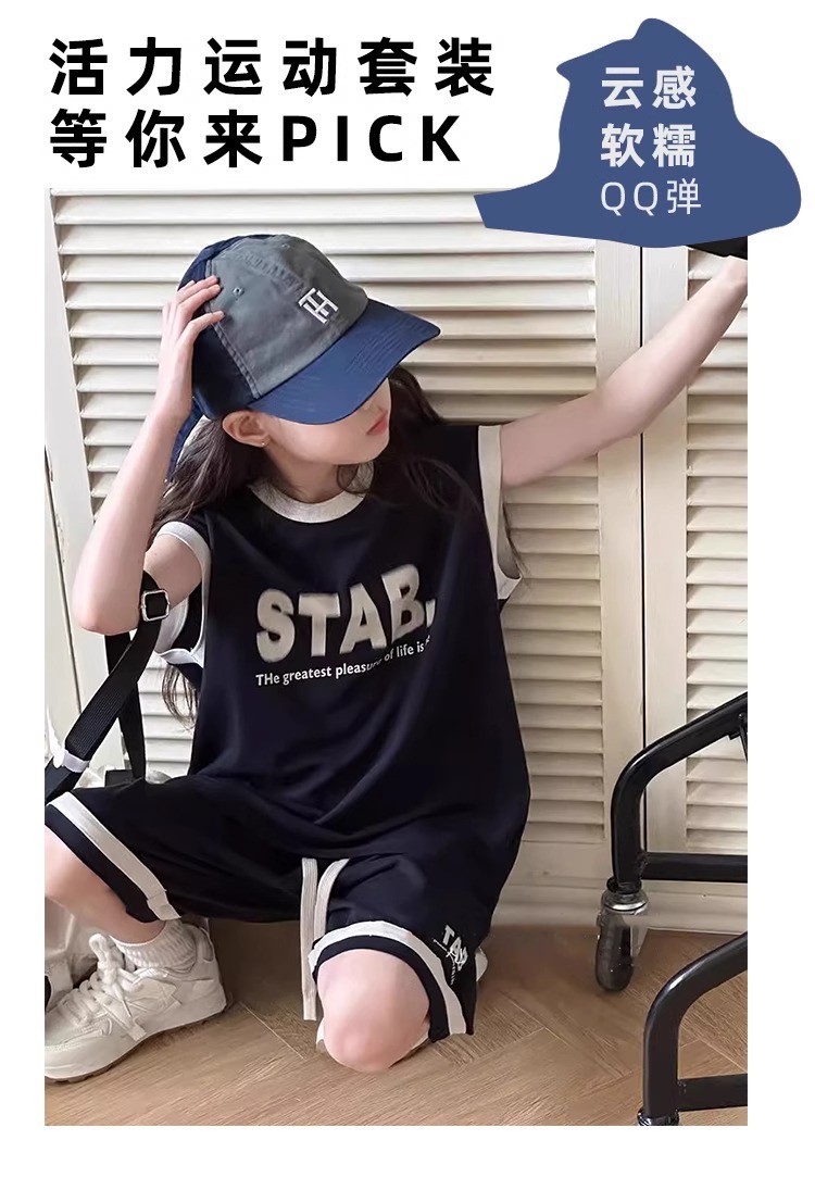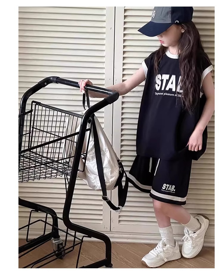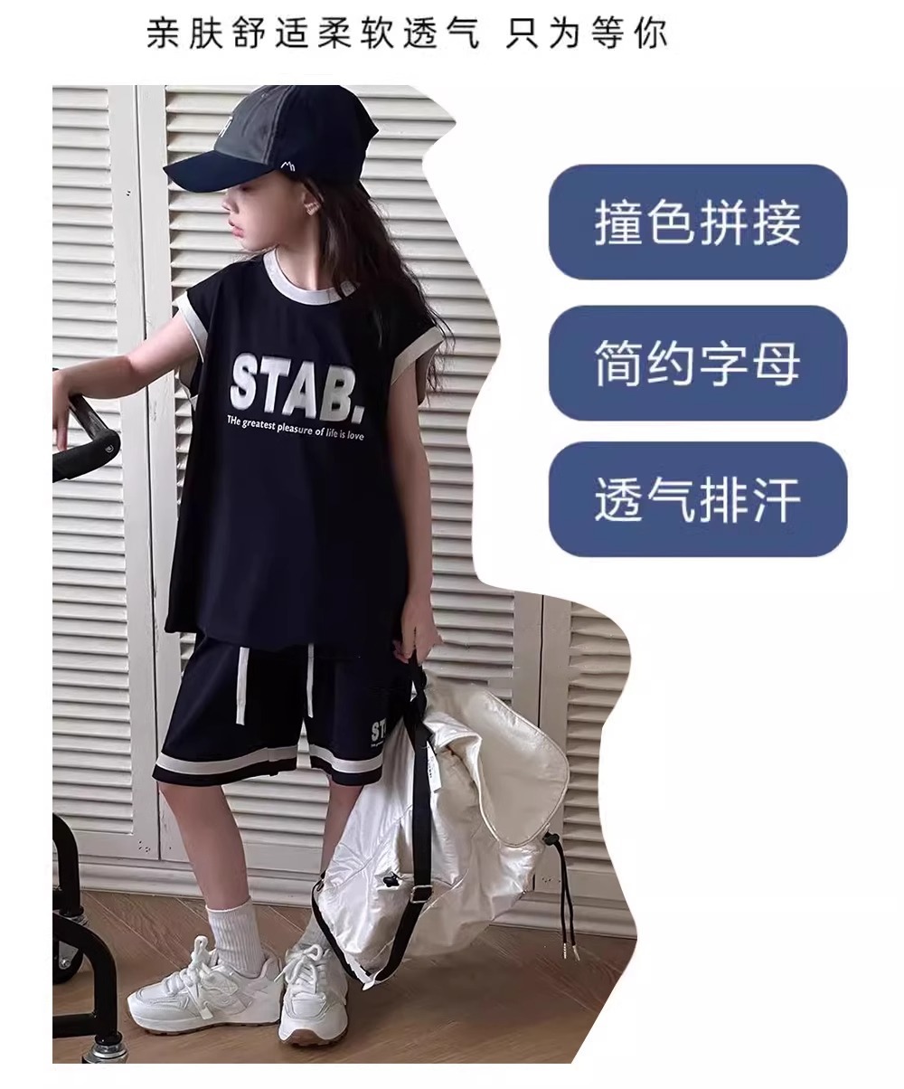 여아 운동복, 여름 아동 스타일 조끼, 캐주얼 반바지, 중대형 아동용 투피스 세트, 트렌디한 남아 농구복스토어 가기