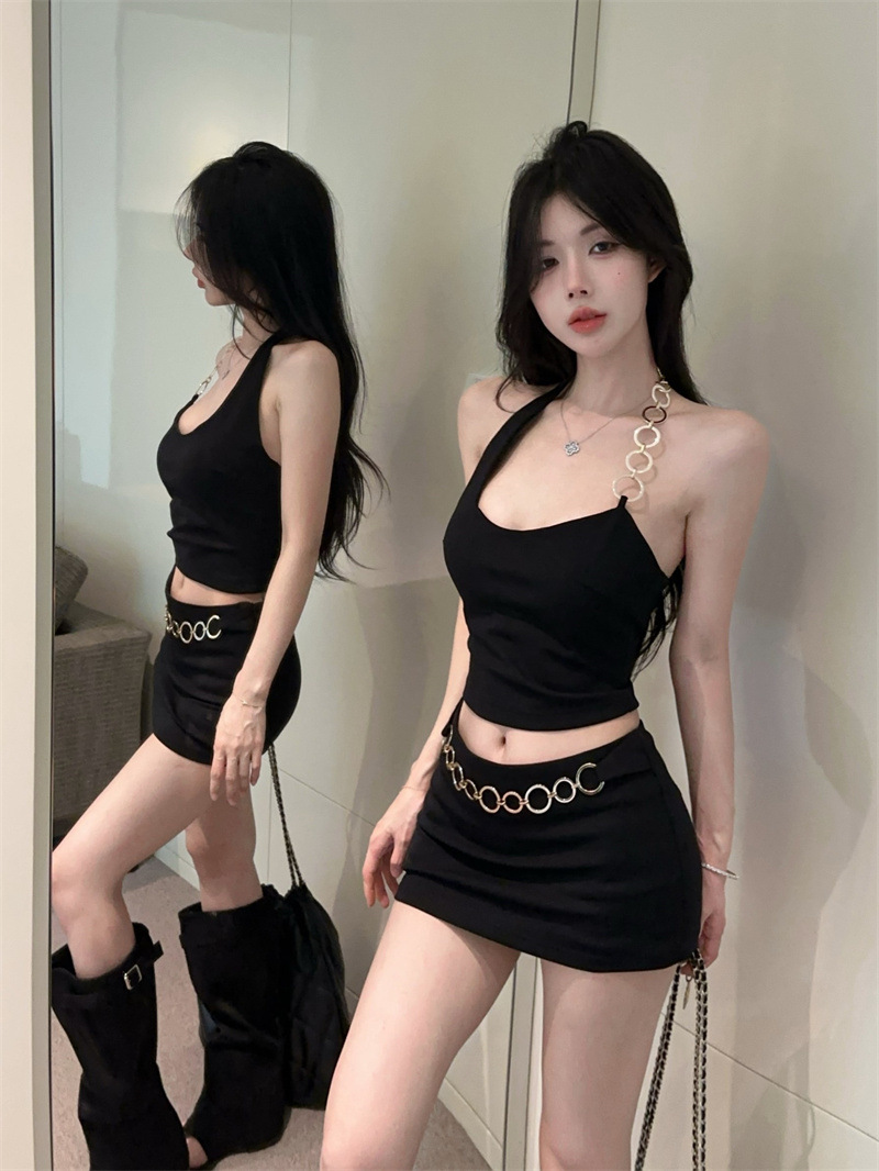 아메리칸 시크 메탈 링 비대칭 캐미솔 섹시한 백리스 슬리밍 힙 스커트 여성용 여름 슈트