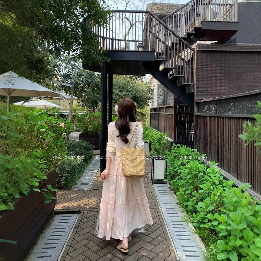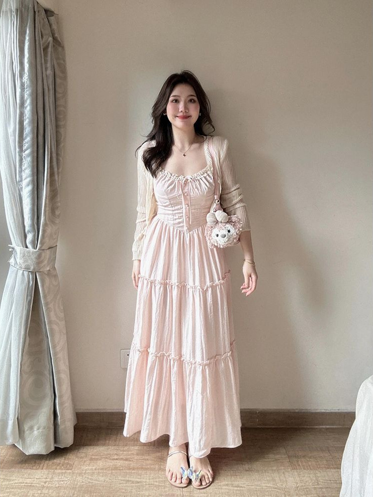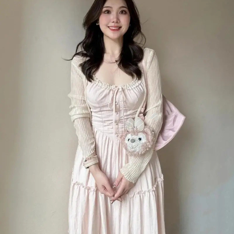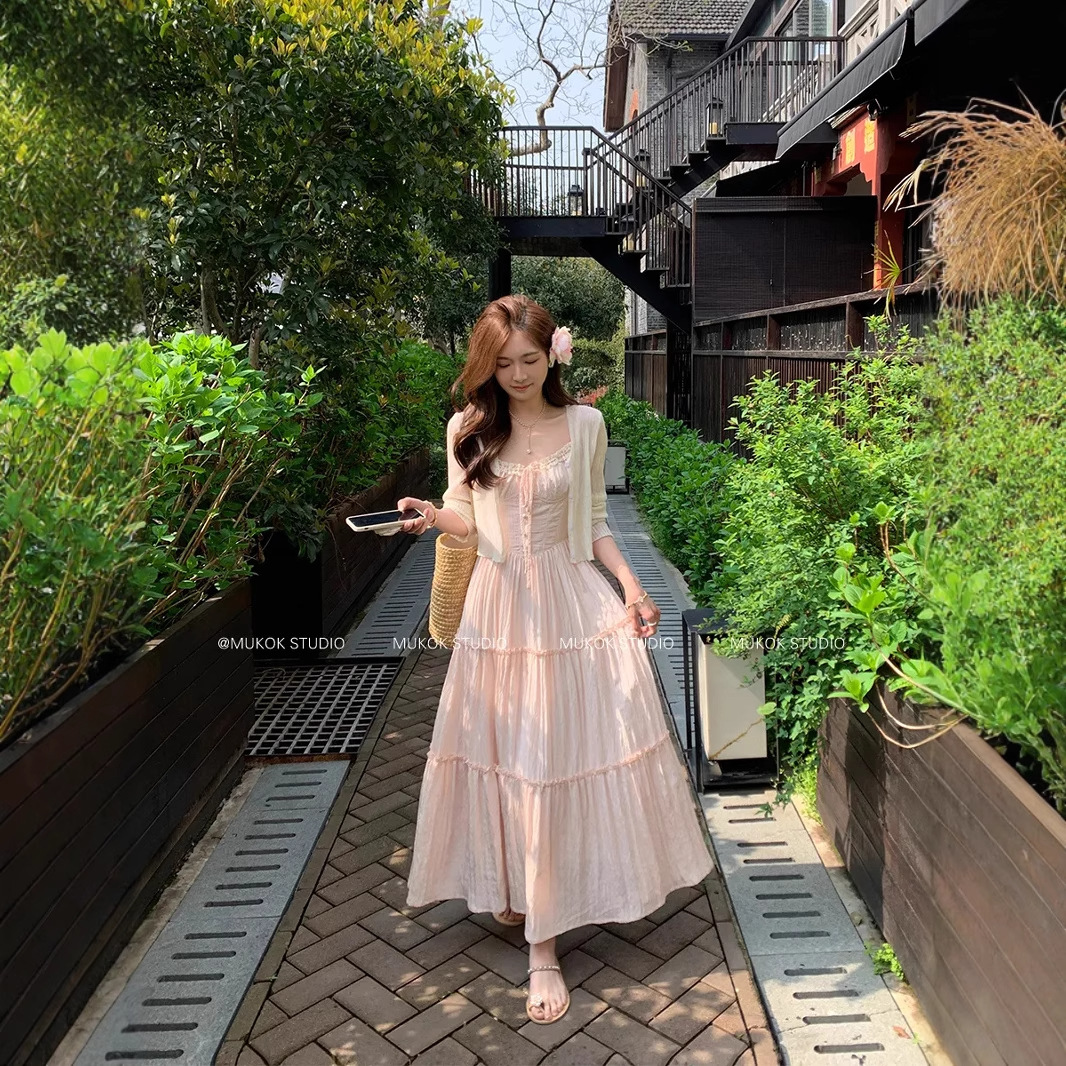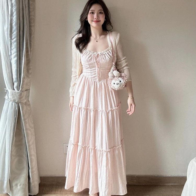 여성을위한 프렌치 스위트 슈트 핑크 서스펜더 드레스 홀리데이 스타일 허리 슬리밍 요정 스커트 카디건 투피스 세트스토어 가기