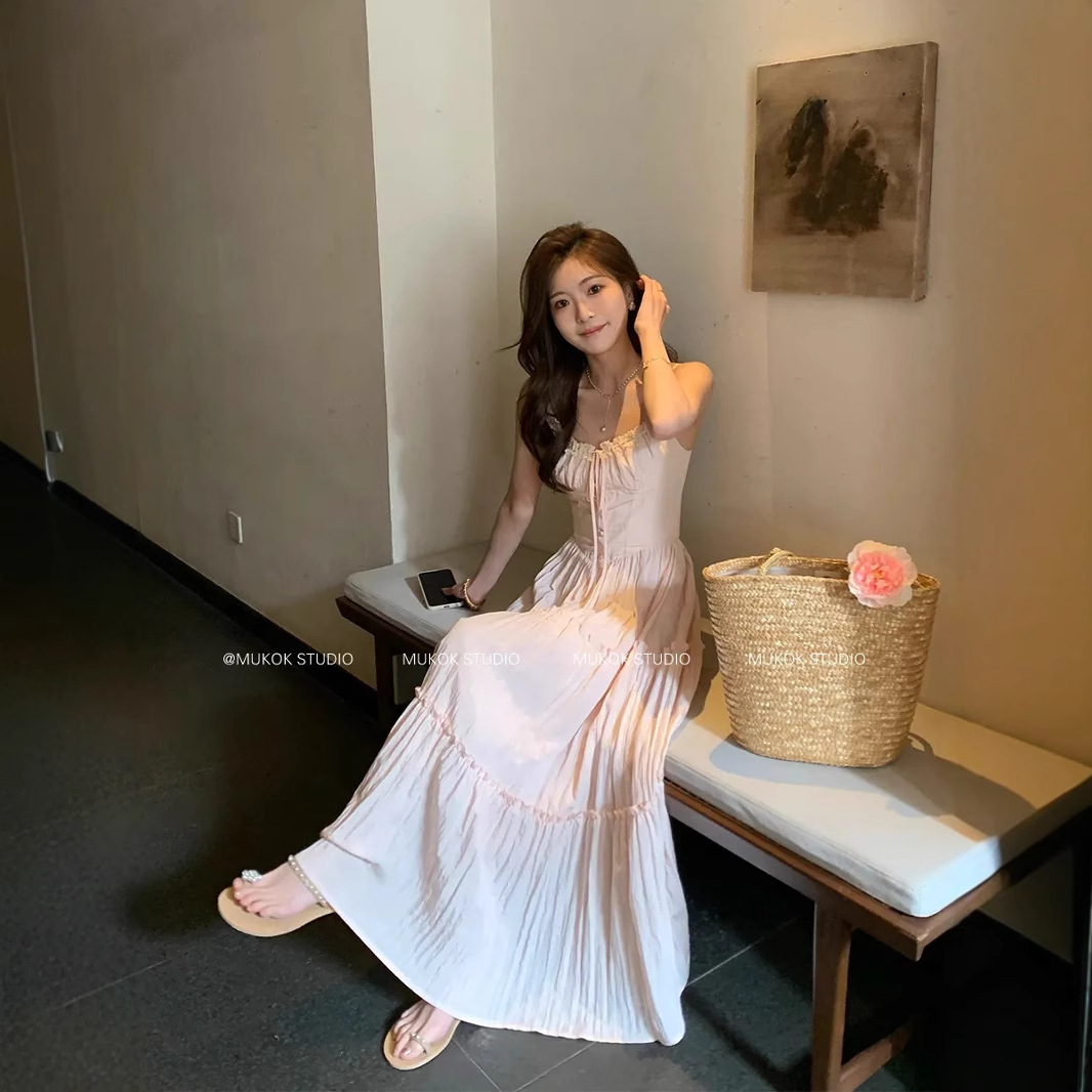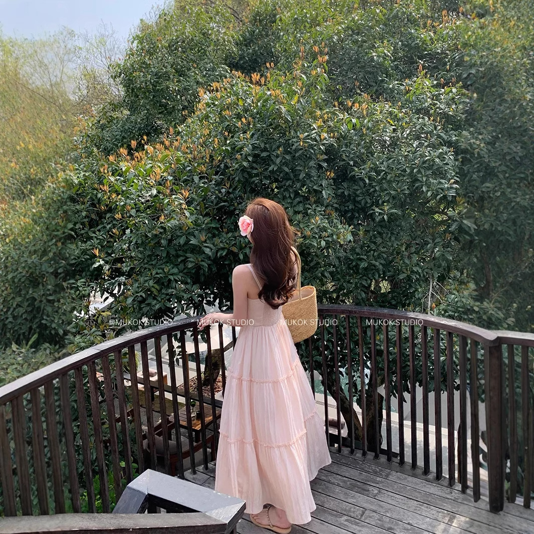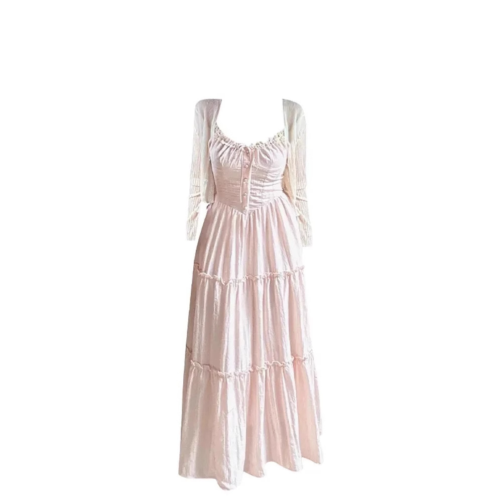 여성을위한 프렌치 스위트 슈트 핑크 서스펜더 드레스 홀리데이 스타일 허리 슬리밍 요정 스커트 카디건 투피스 세트스토어 가기