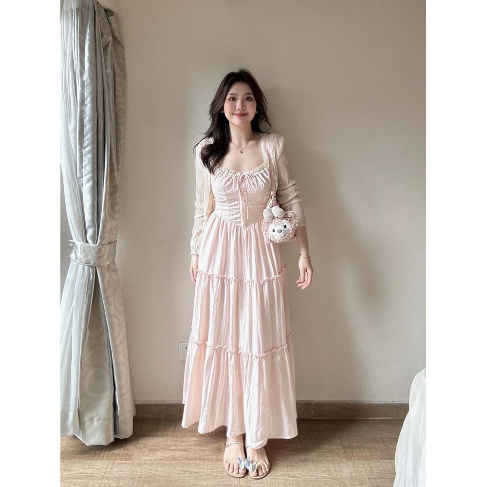 여성을위한 프렌치 스위트 슈트 핑크 서스펜더 드레스 홀리데이 스타일 허리 슬리밍 요정 스커트 카디건 투피스 세트