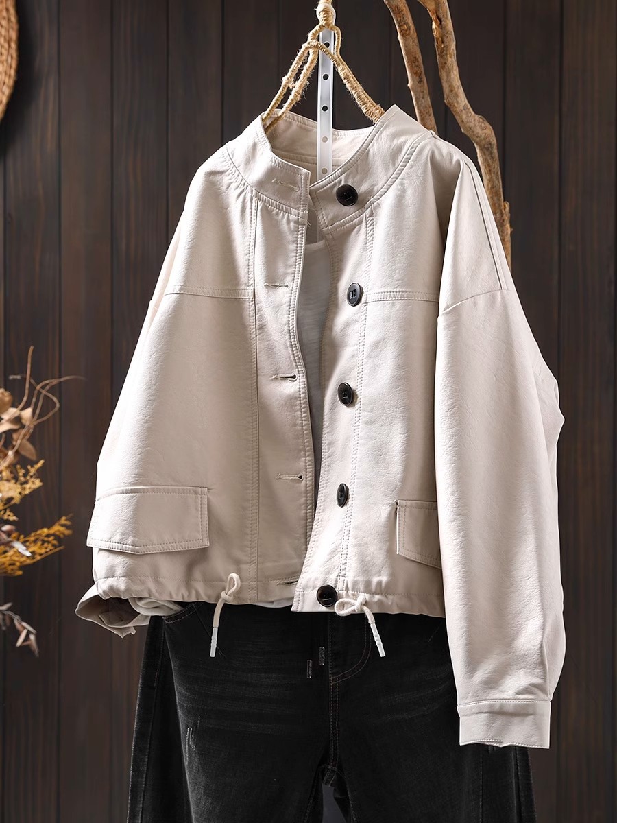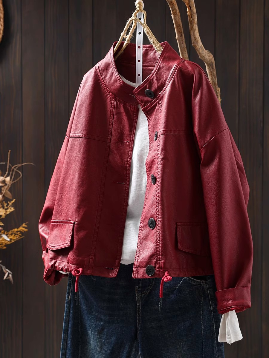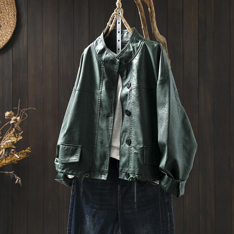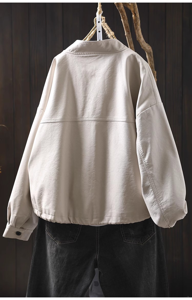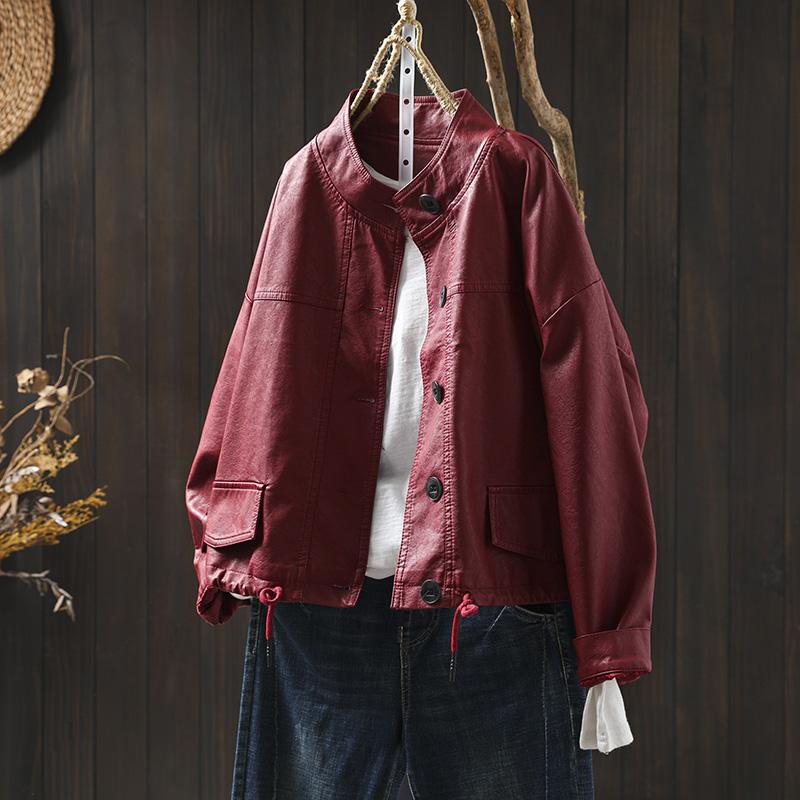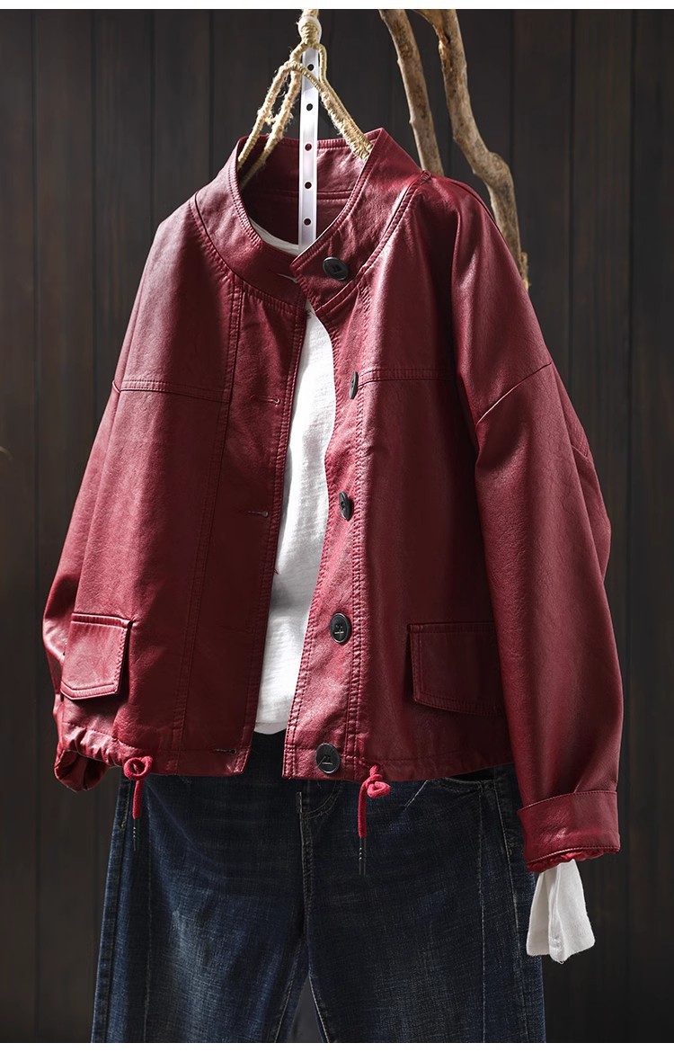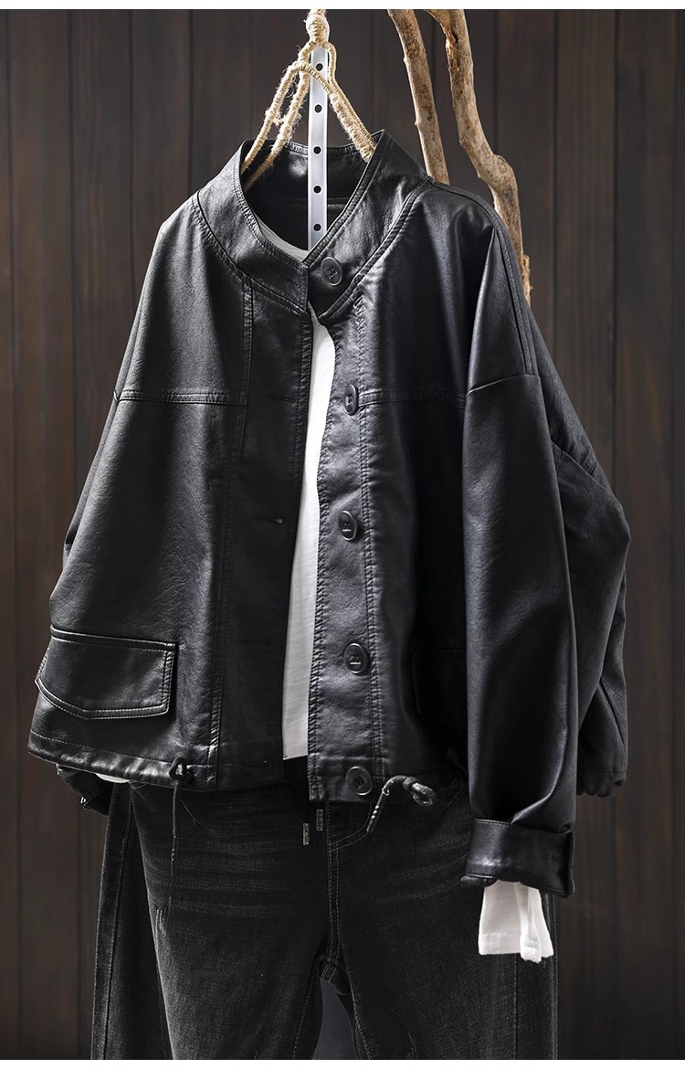 여성용 밑단 드로스트링 스탠드 칼라 PU 가죽 자켓, 짧고 루즈한 디자인, 봄, 가을 캐주얼하고 멋진 오토바이 자켓