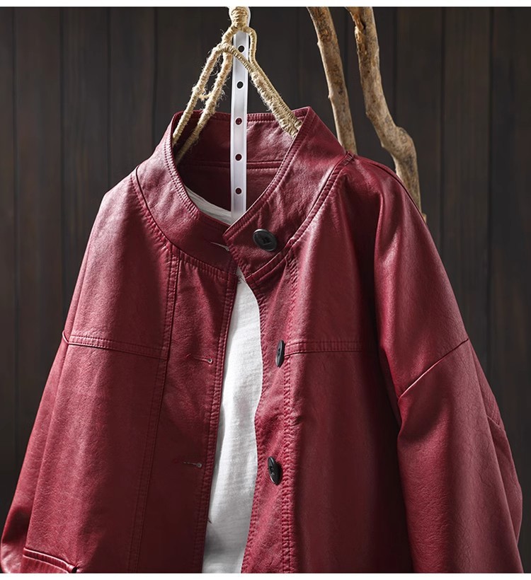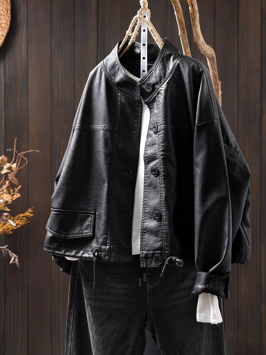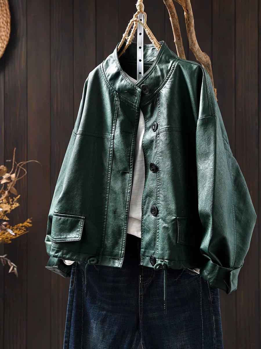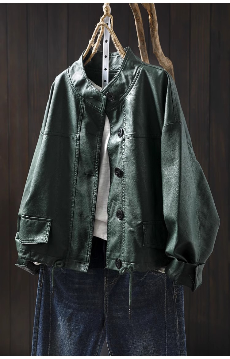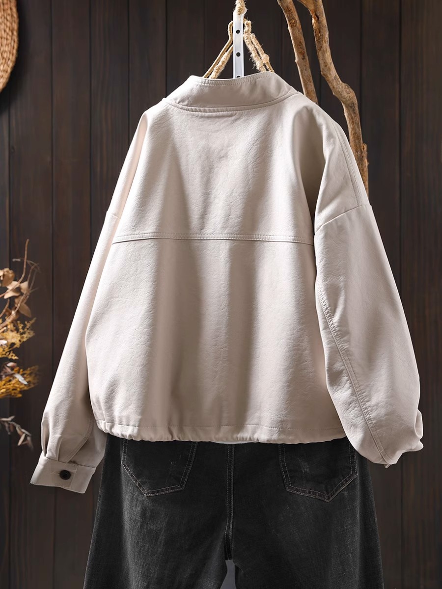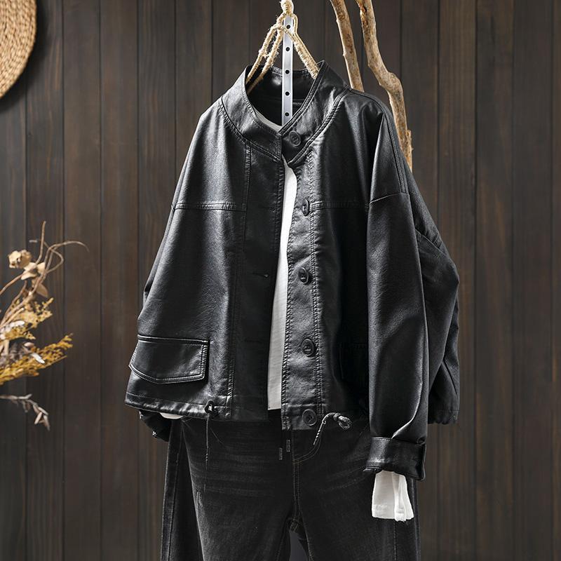 여성용 밑단 드로스트링 스탠드 칼라 PU 가죽 자켓, 짧고 루즈한 디자인, 봄, 가을 캐주얼하고 멋진 오토바이 자켓
