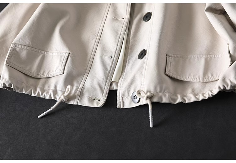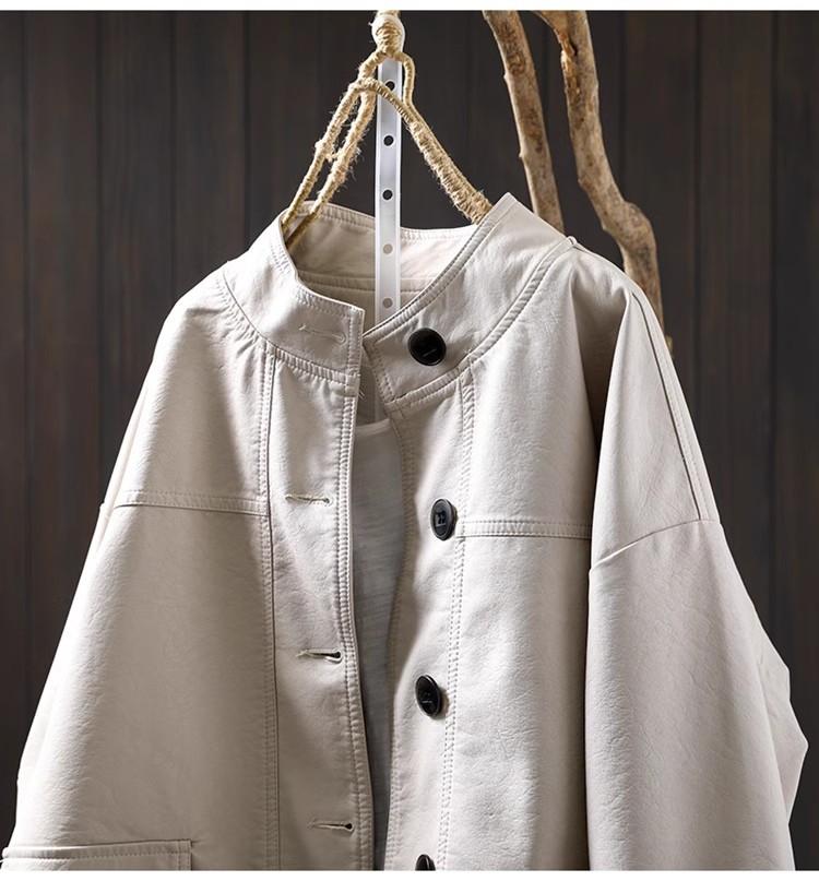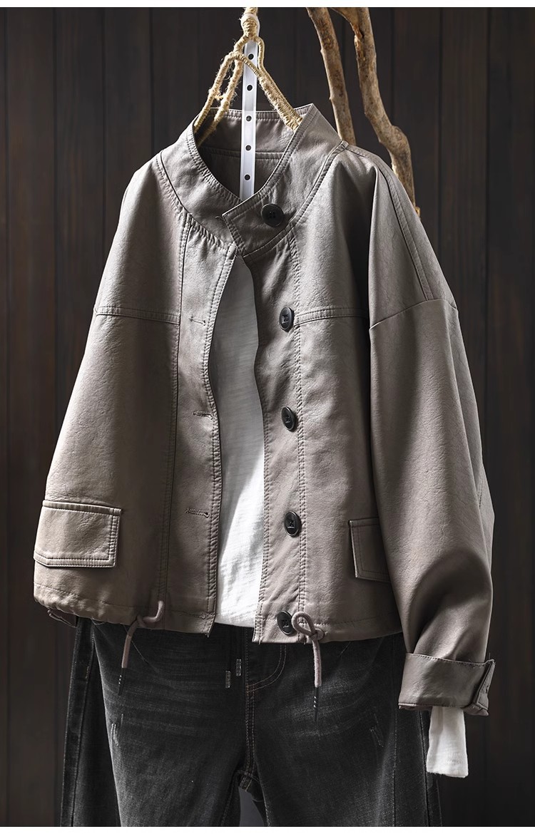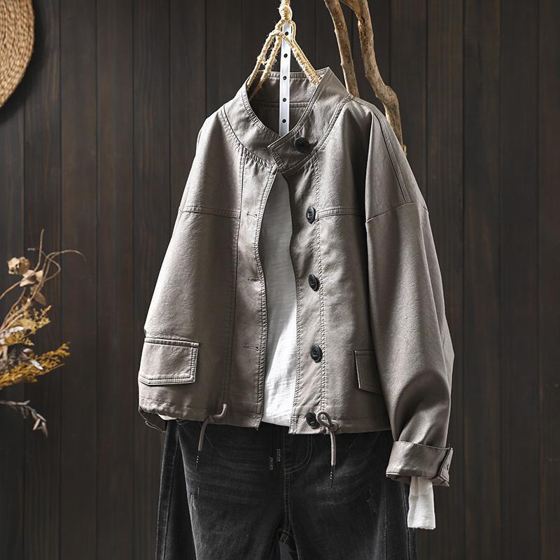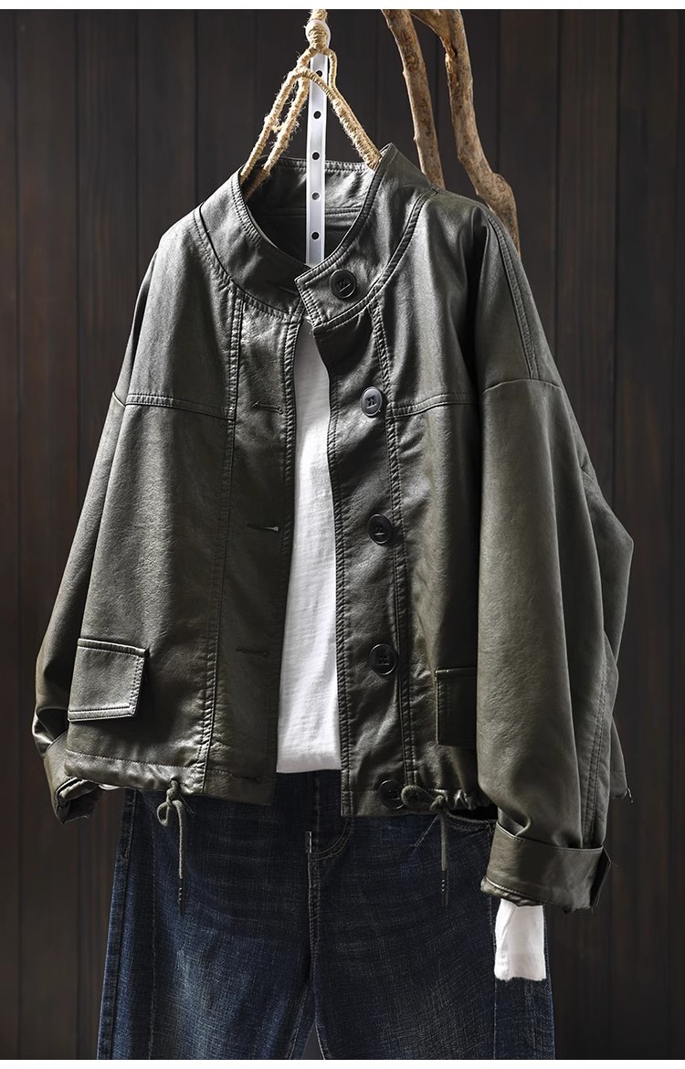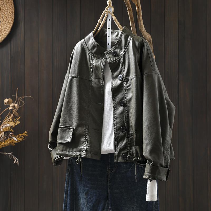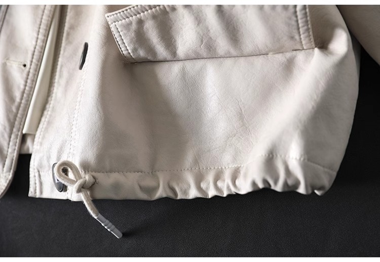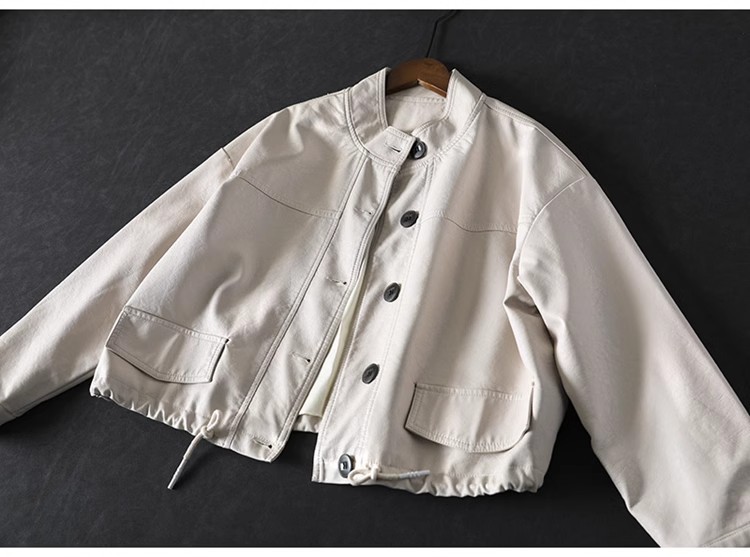 여성용 밑단 드로스트링 스탠드 칼라 PU 가죽 자켓, 짧고 루즈한 디자인, 봄, 가을 캐주얼하고 멋진 오토바이 자켓스토어 가기