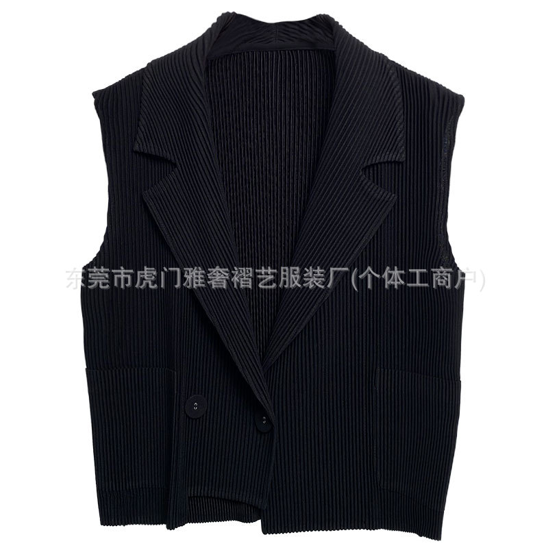 미야케 플리츠 여성용 두꺼운 이쑤시개 플리츠 조끼 패셔너블한 슈트 칼라 버튼 중간 길이의 우아한 아우터웨어 플리츠 아우터