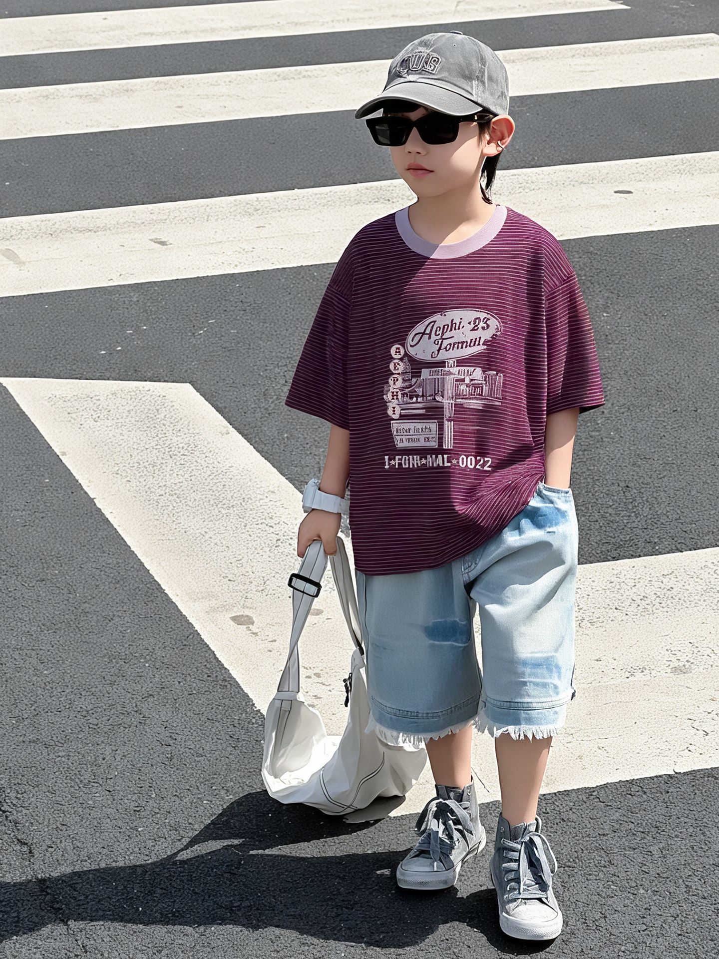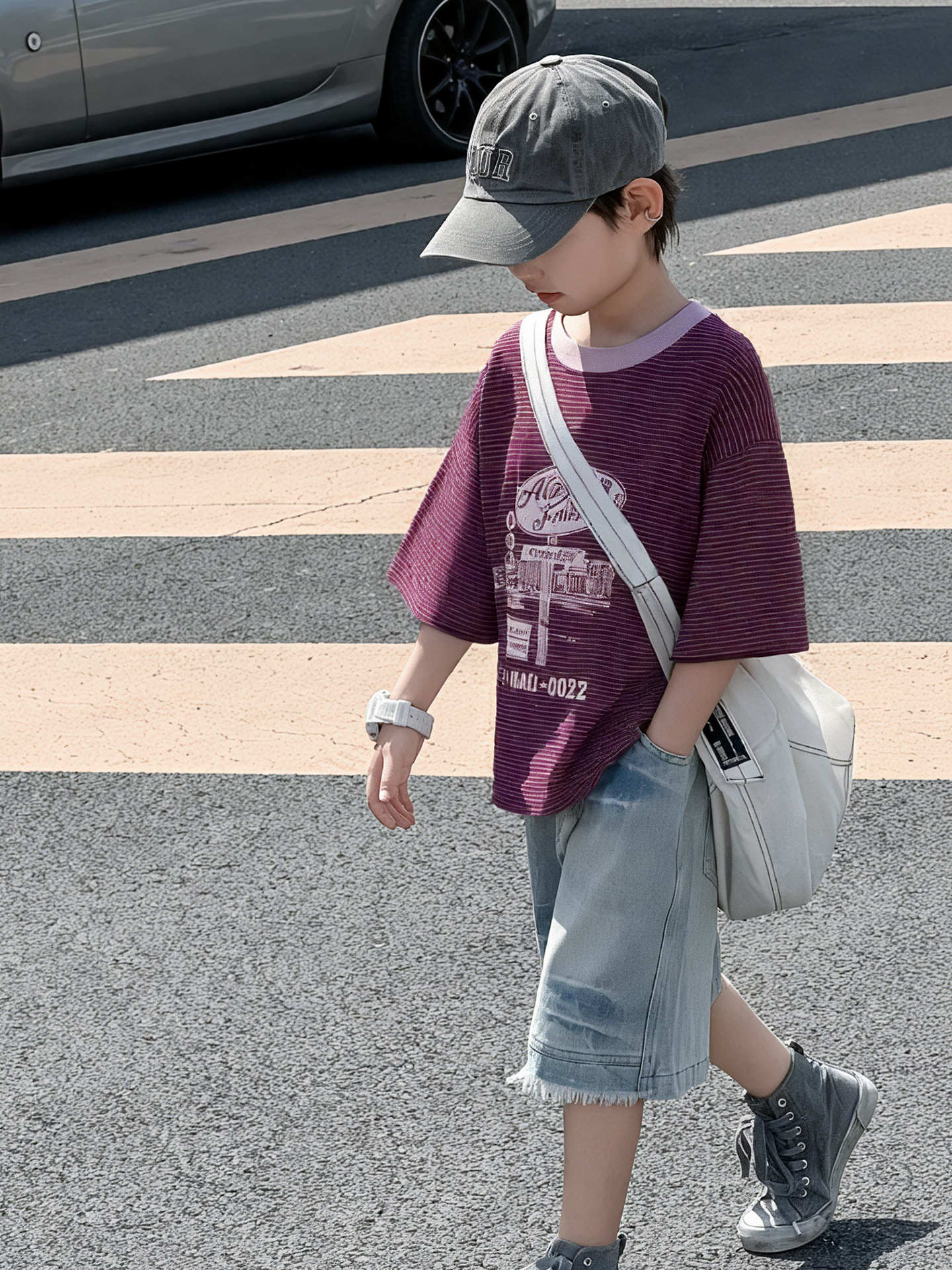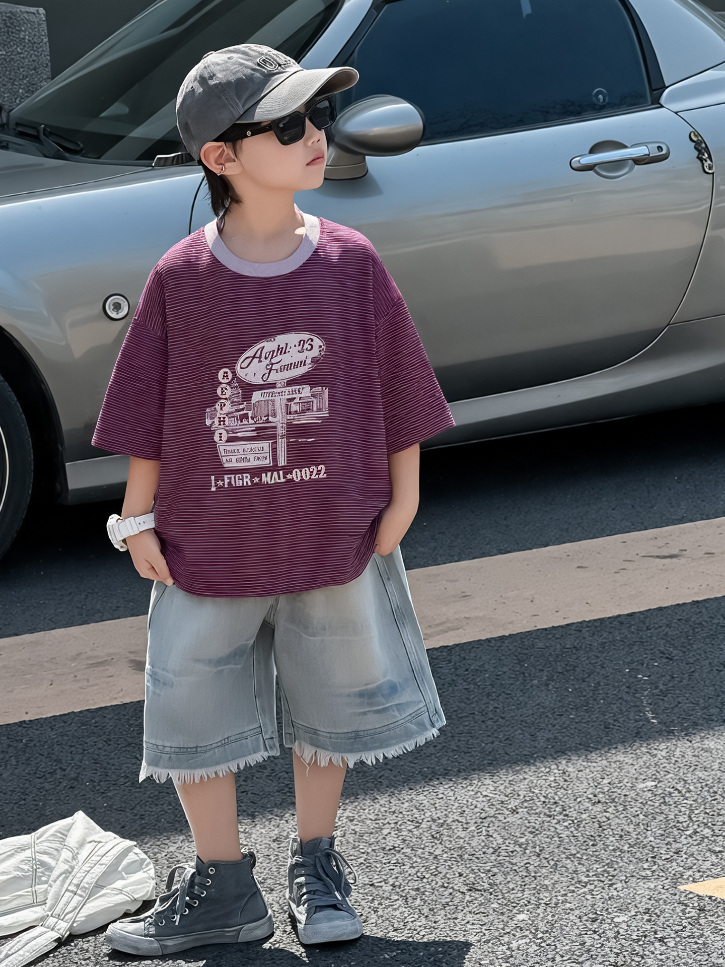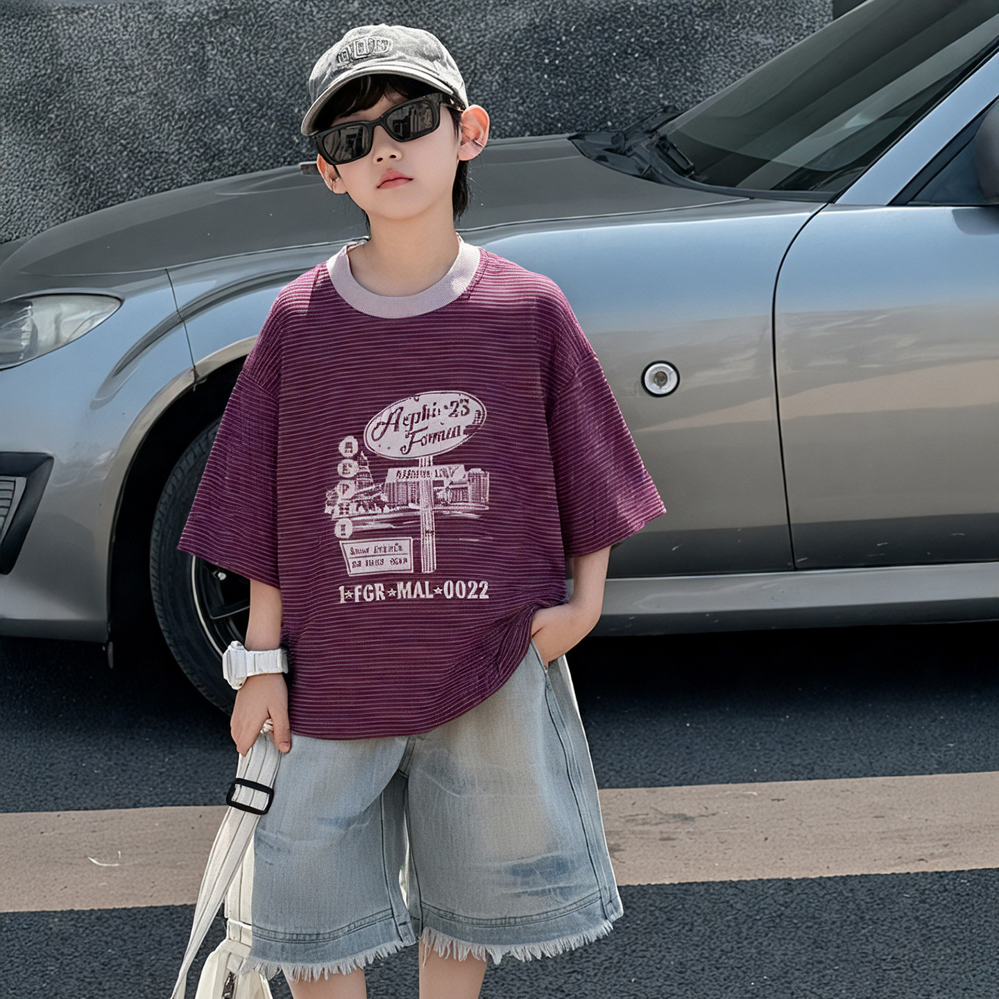 소년 여름 반팔 티셔츠 아동 여름 한국어 버전 2025 새로운 줄무늬 스포츠 유행 아동 의류 미국 스타일 느슨한