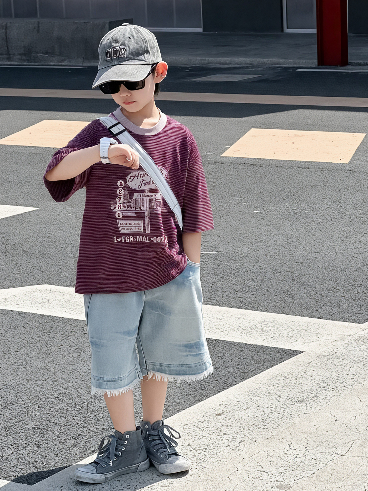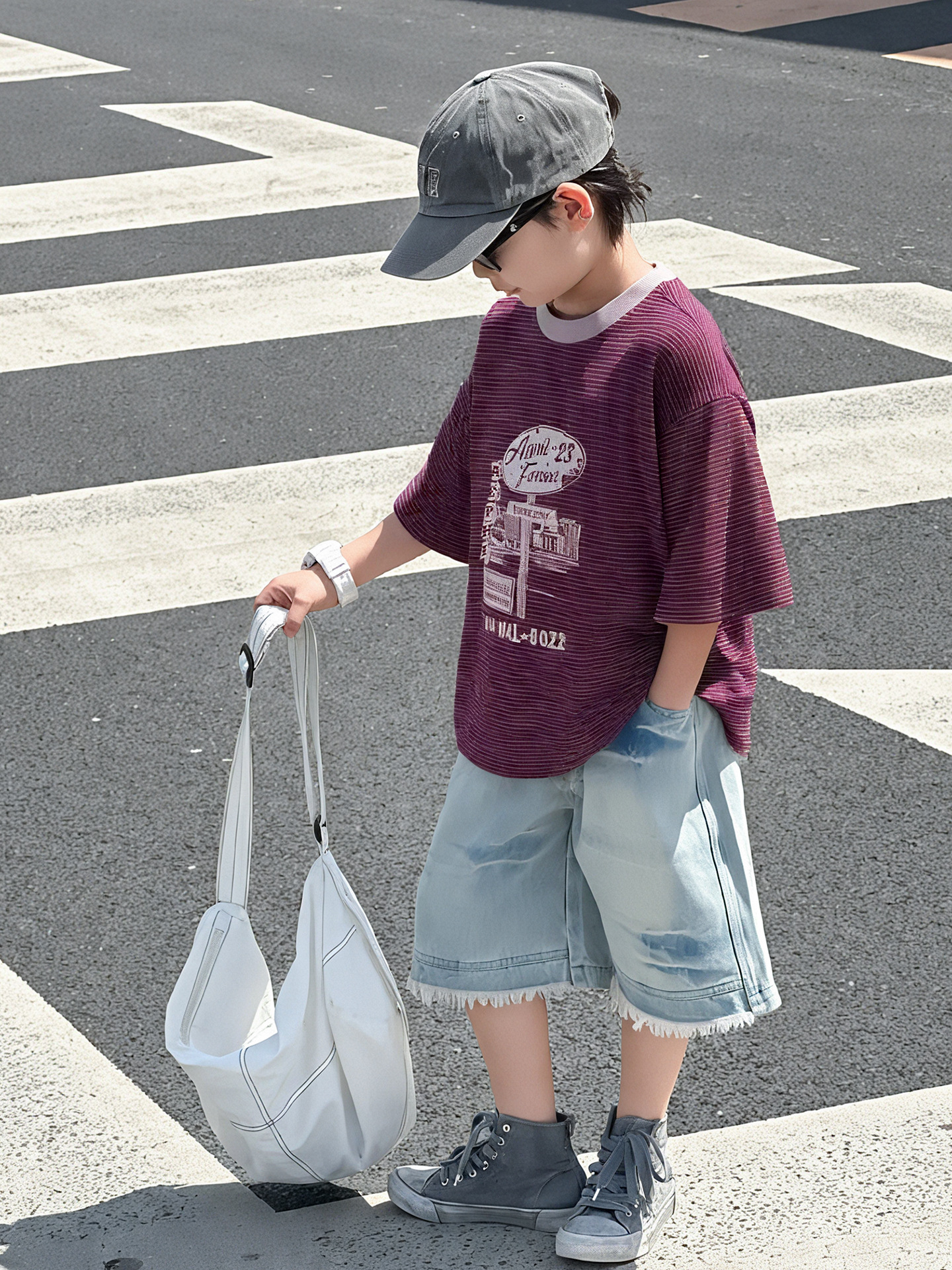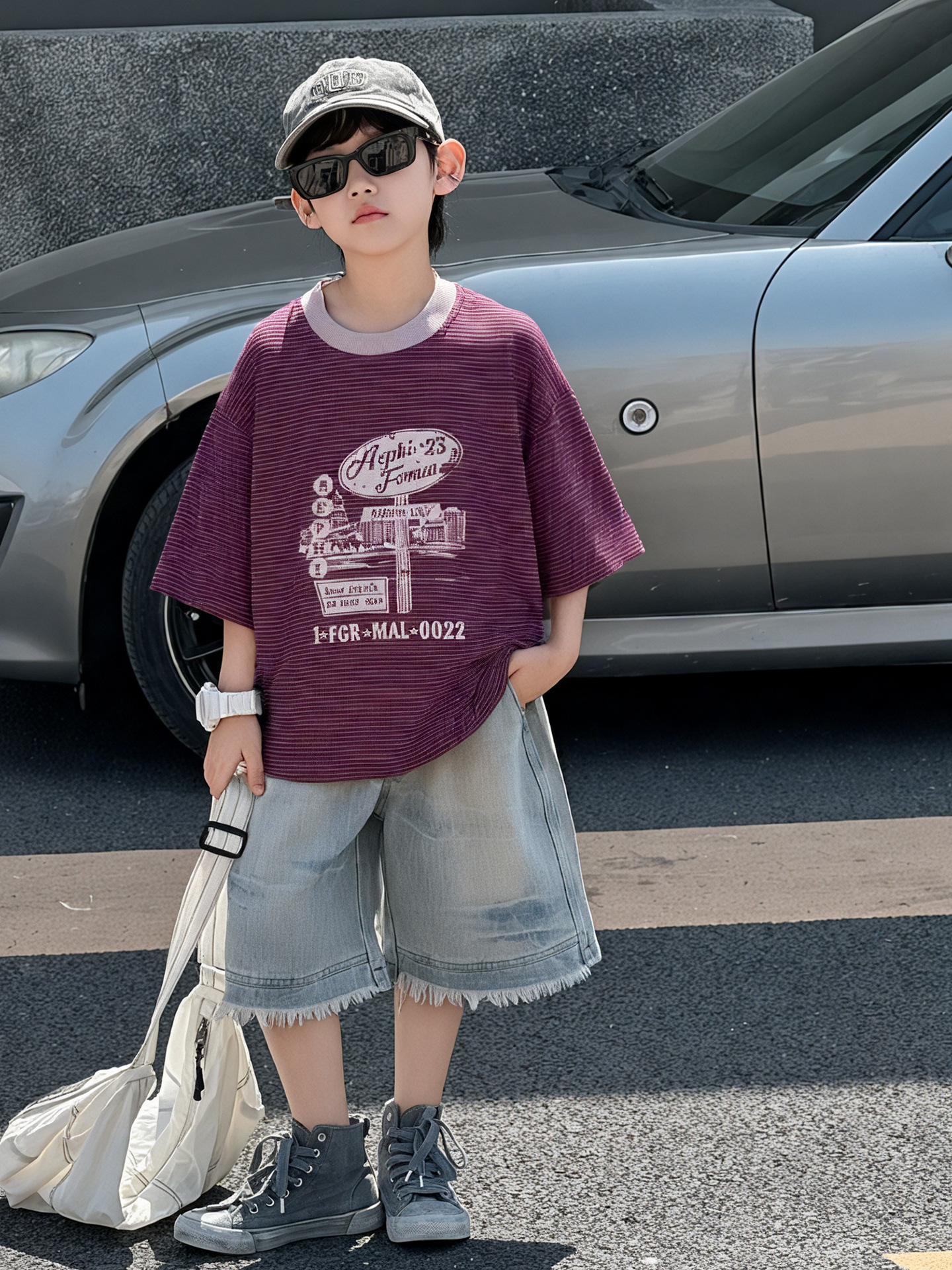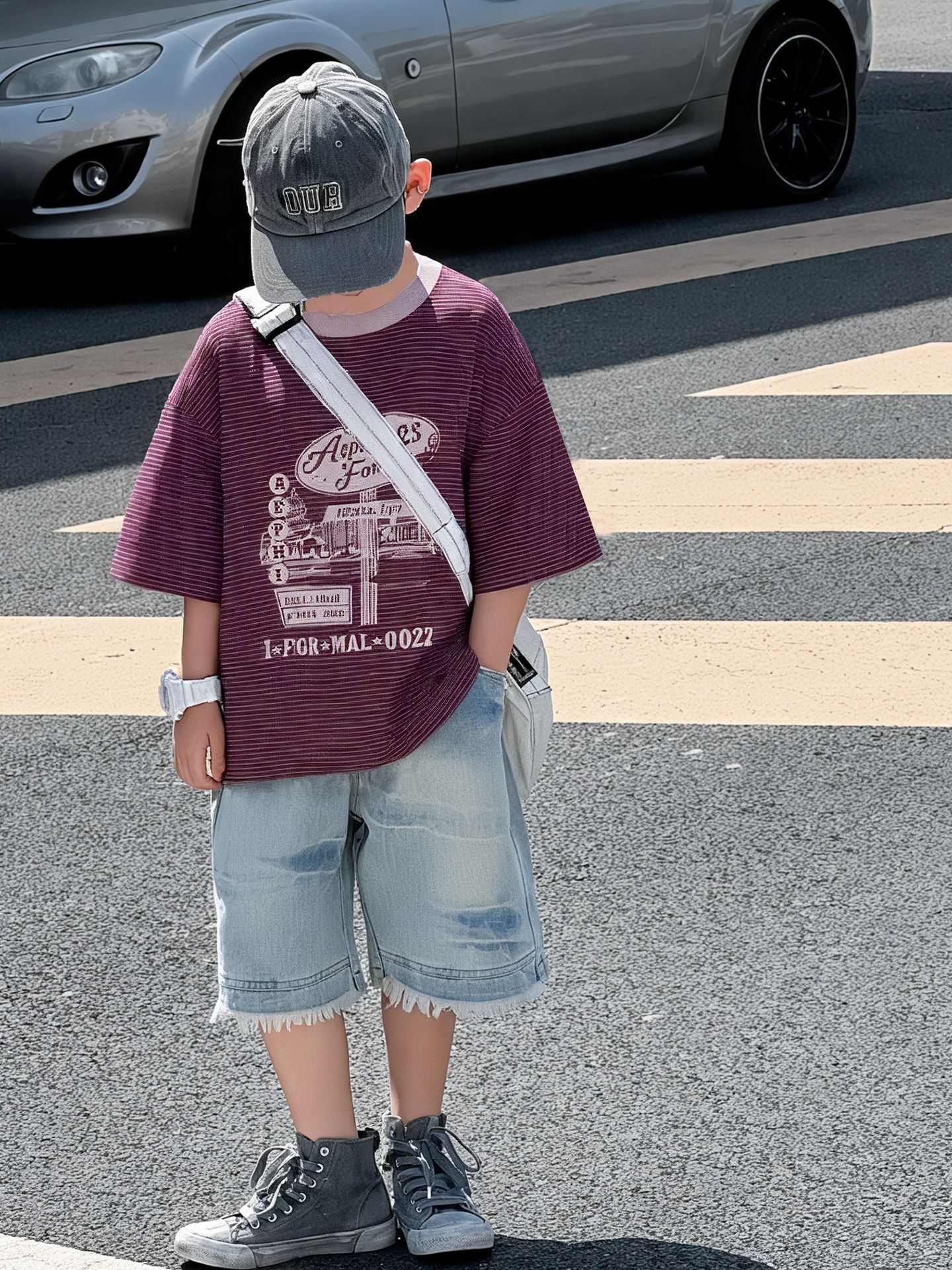 소년 여름 반팔 티셔츠 아동 여름 한국어 버전 2025 새로운 줄무늬 스포츠 유행 아동 의류 미국 스타일 느슨한