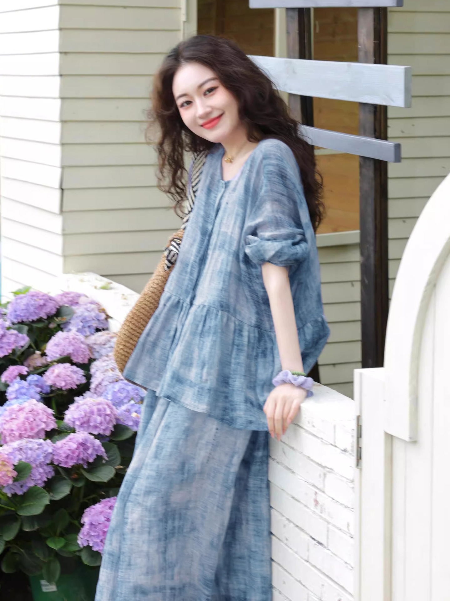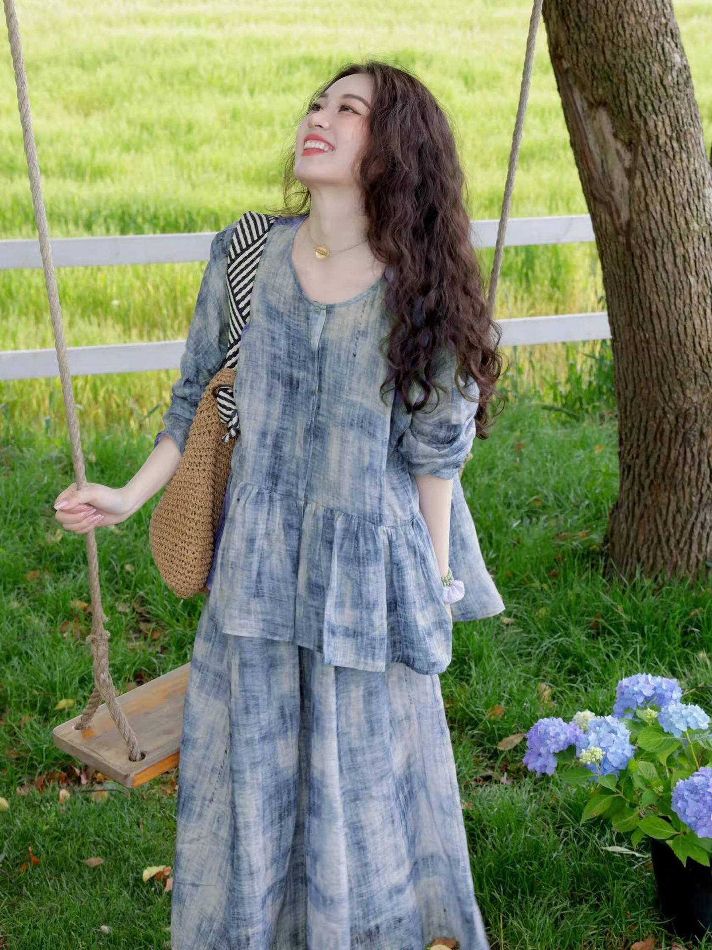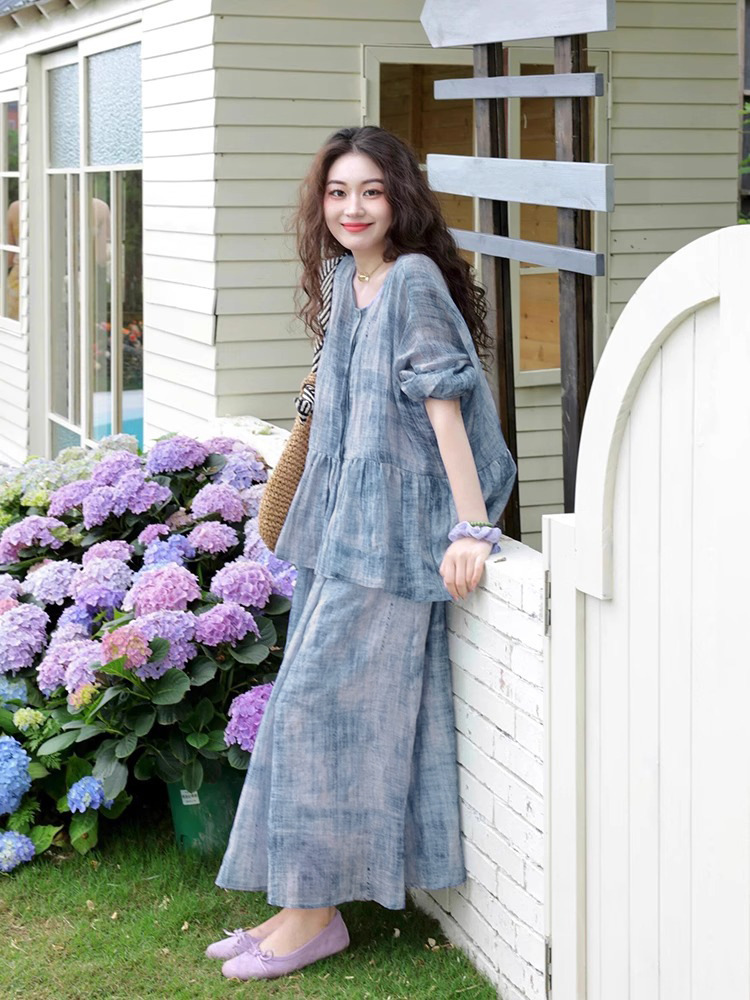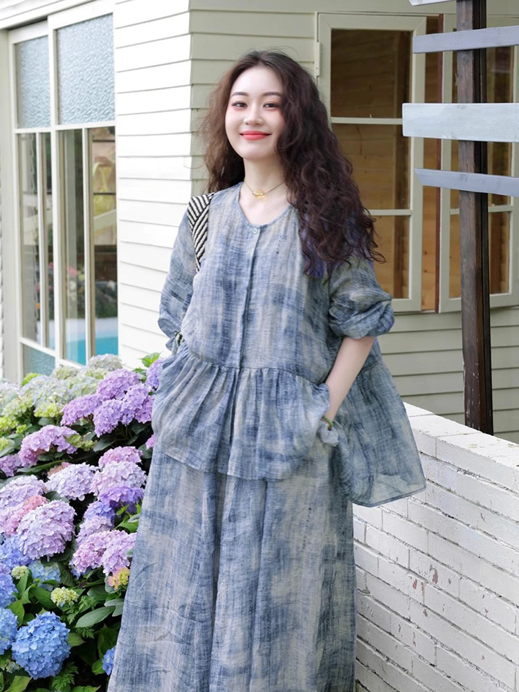 2026 봄/여름 투피스 세트 라미 프린트 셔츠 탑과 멜빵 원피스 B0423 롱 드레스