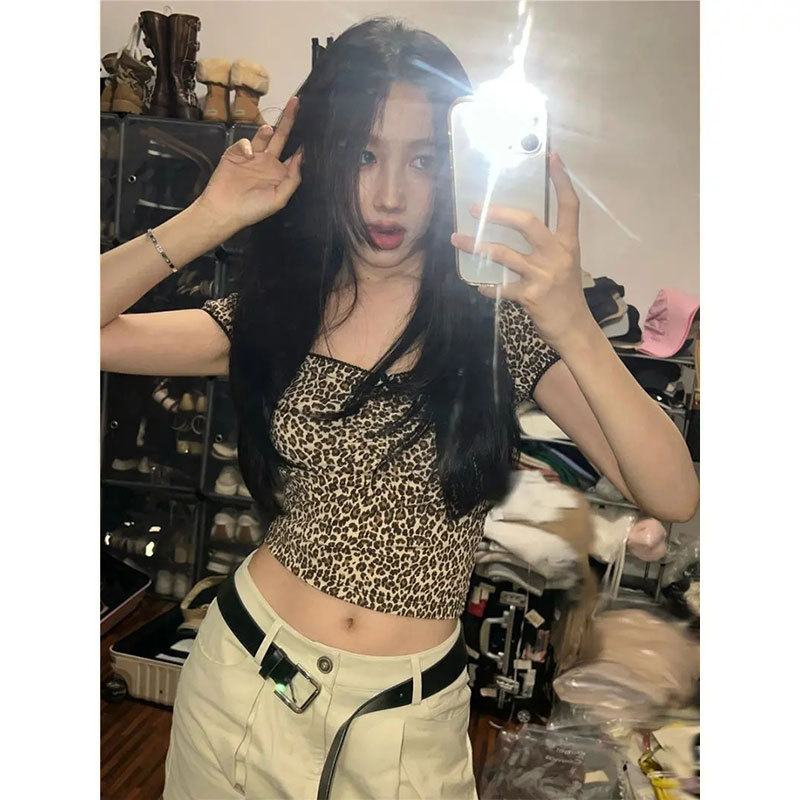 Pure Desire Hot Girl 레오파드 프린트 반팔 티셔츠 여성 여름 짧은 슬림핏 슬리밍 하이 엔드 연예인 스타일 다용도 탑