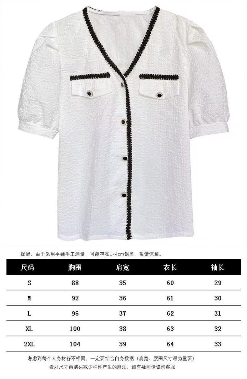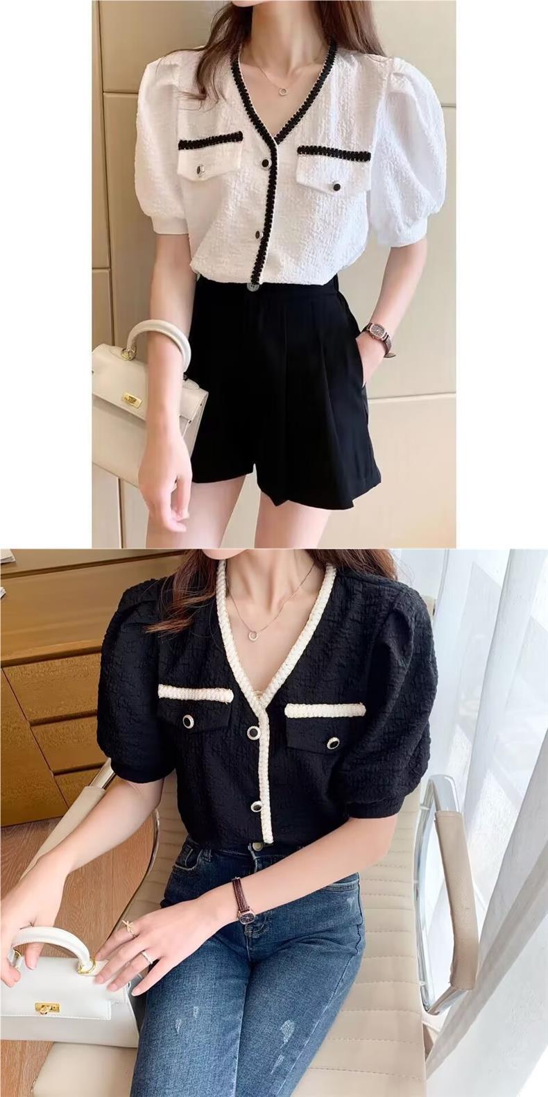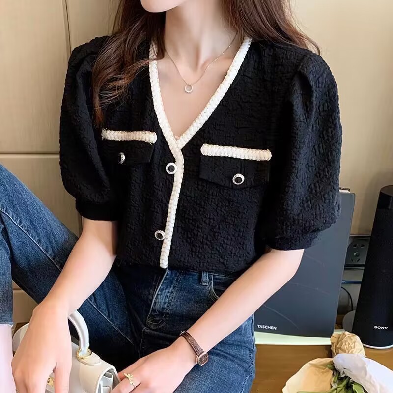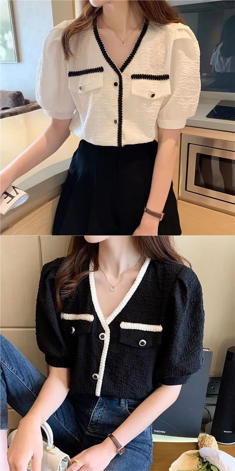 패션 트렌드 2025 여름 프랑스 스타일 샤넬 스타일 쉬폰 셔츠 패션 올 매치 여성 반팔 탑 V 넥 퍼프 슬리브스토어 가기