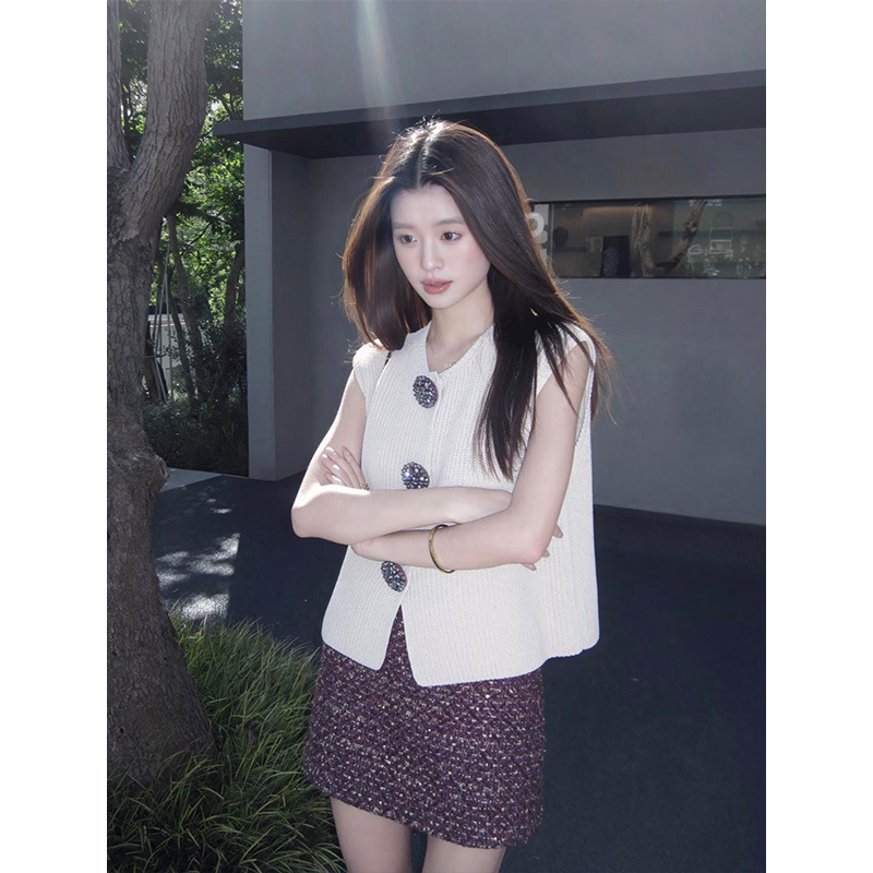 2025 새로운 스타일 Xiaoxiangfeng 중공업 다이아몬드 버튼 민소매 양복 조끼 양복 조끼 트위드 스커트 여성