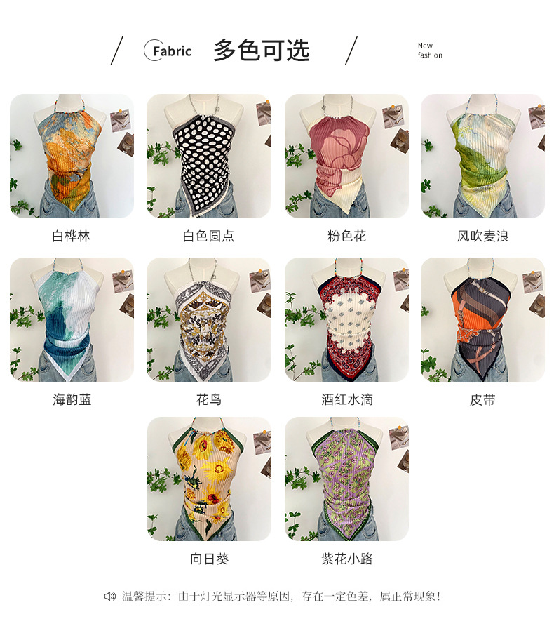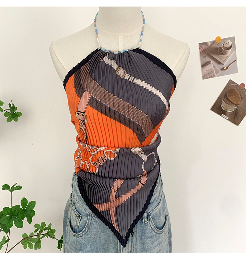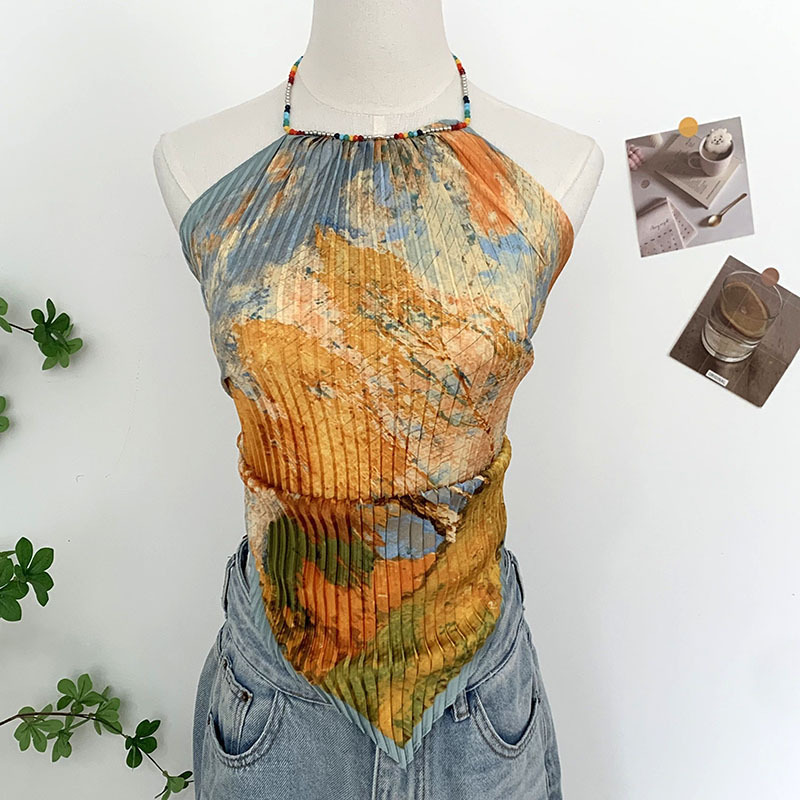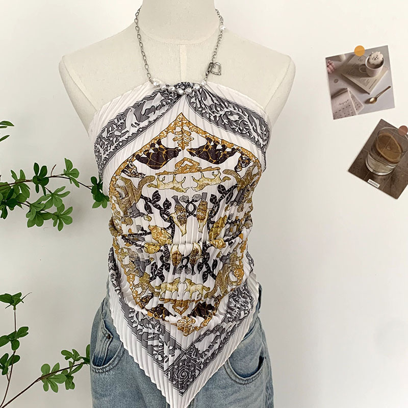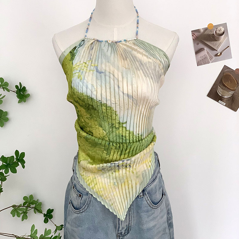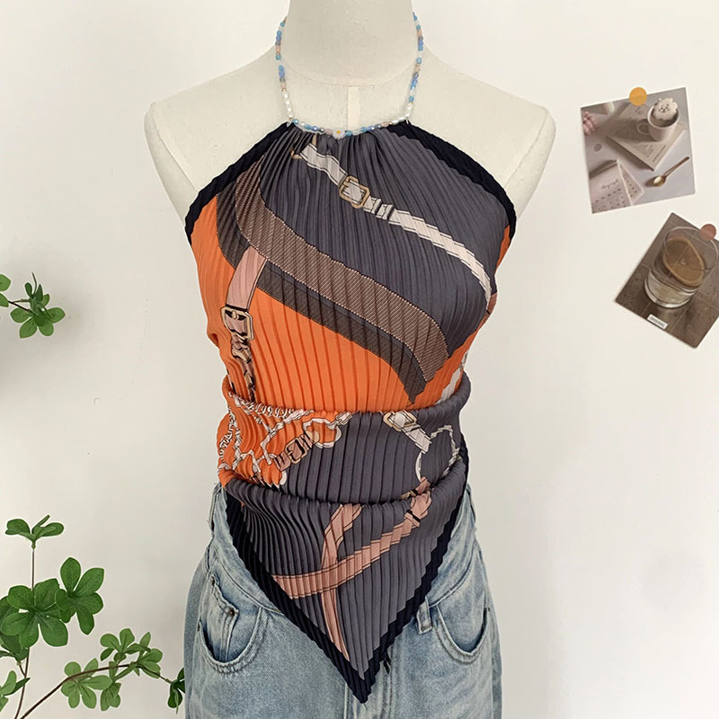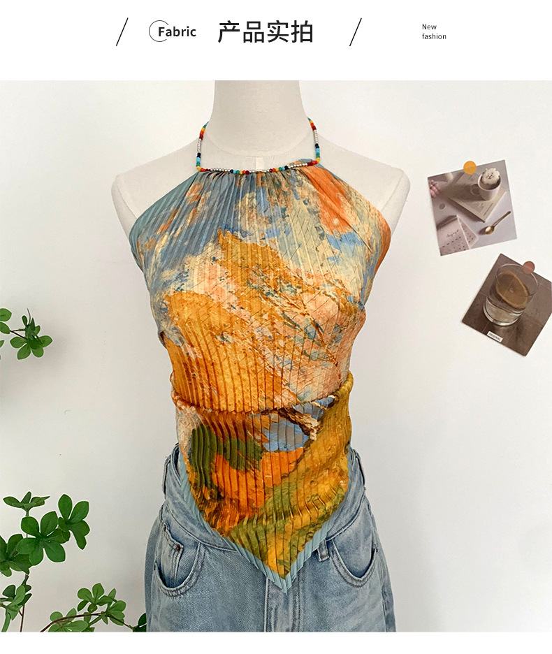 주름 실크 스카프, 고급 여름 의상, 유화 짧은 조끼, 여성 틈새 디자인, 튜브탑, 홀터넥, 작은 멜빵스토어 가기