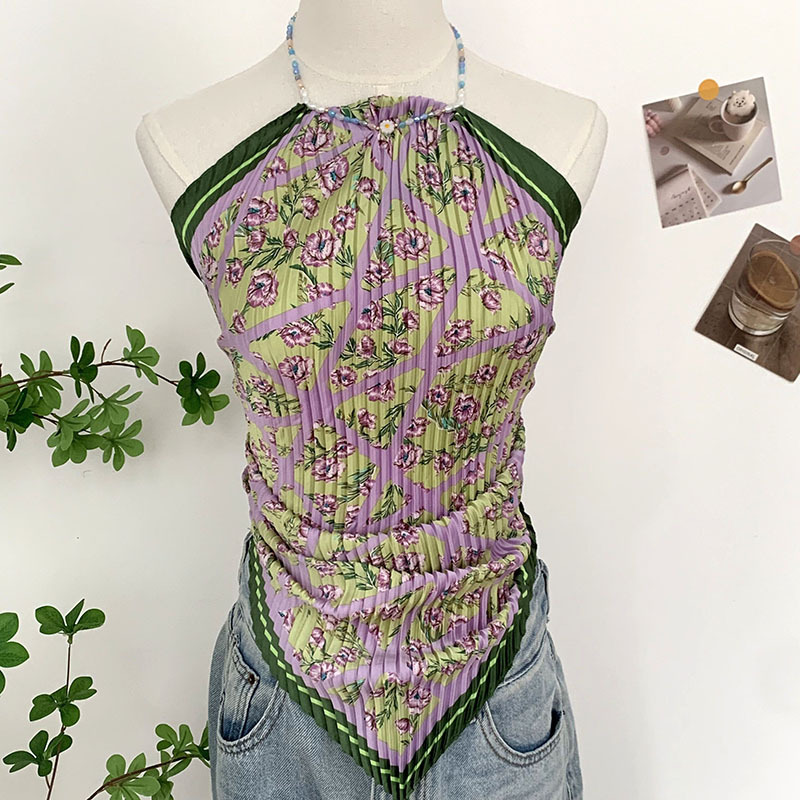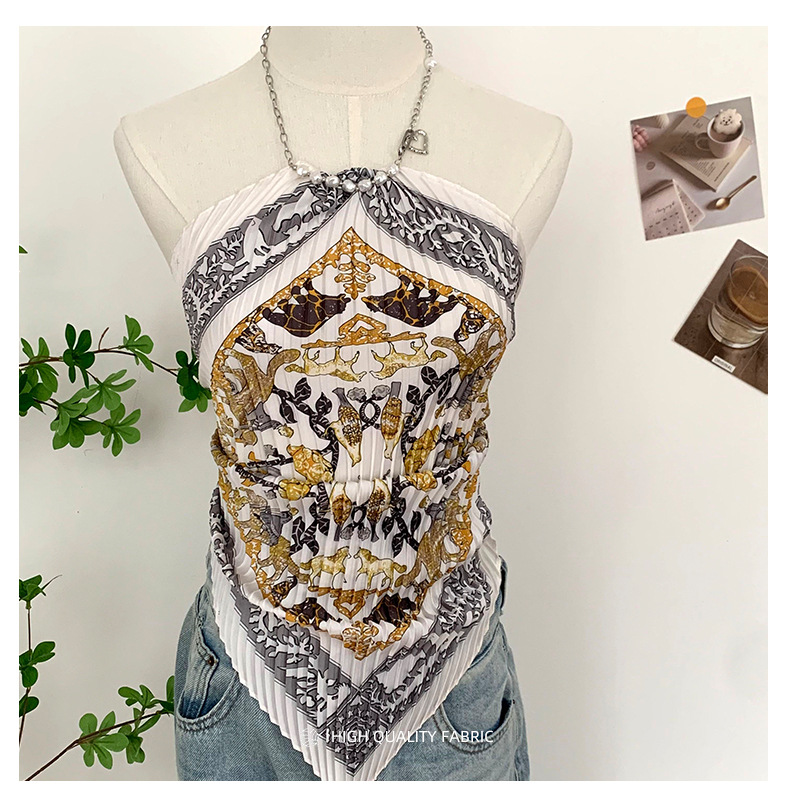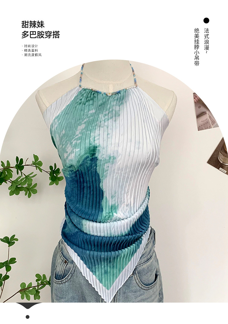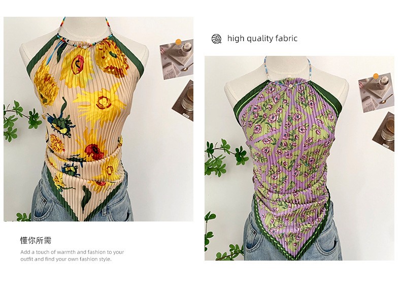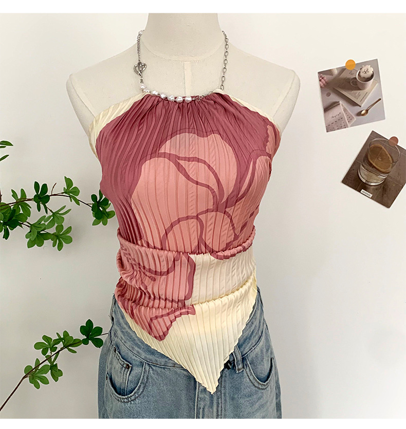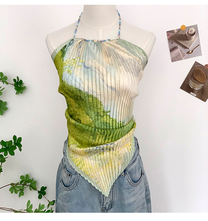 주름 실크 스카프, 고급 여름 의상, 유화 짧은 조끼, 여성 틈새 디자인, 튜브탑, 홀터넥, 작은 멜빵스토어 가기