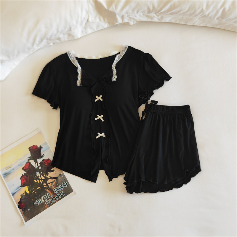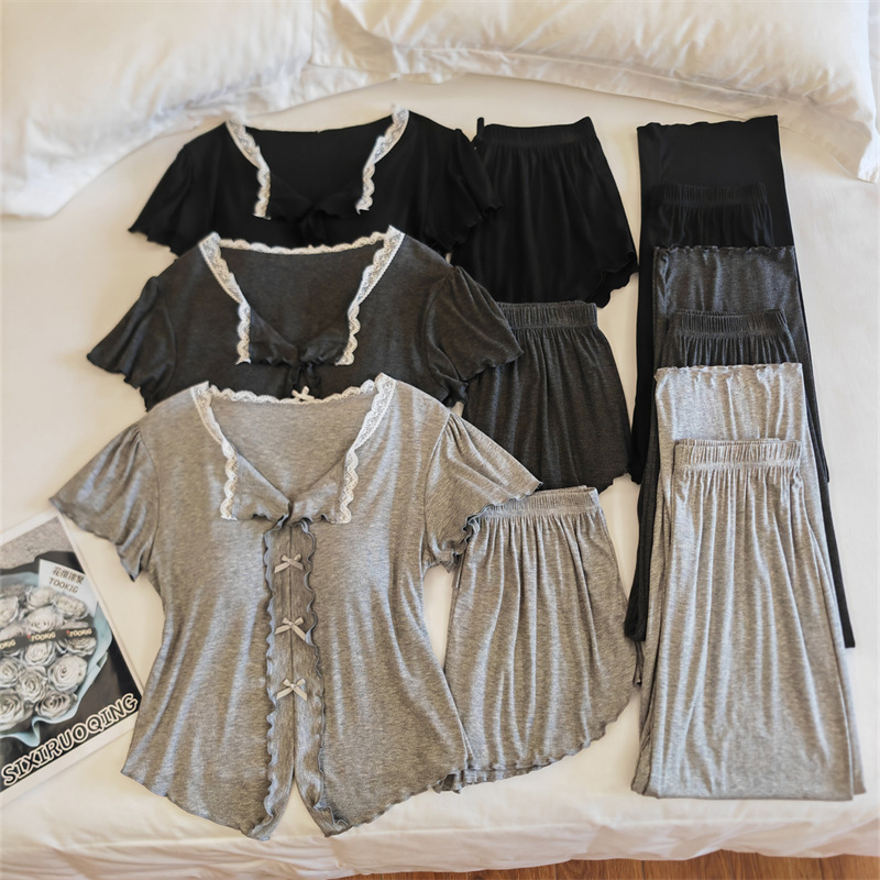 여성용 모달 잠옷 여름 반팔 반바지와 바지 3 피스 얇은 섹시한 순수한 욕망 스타일 가슴 패드 홈웨어스토어 가기