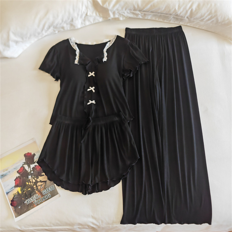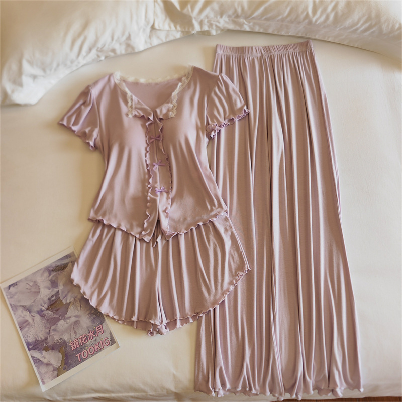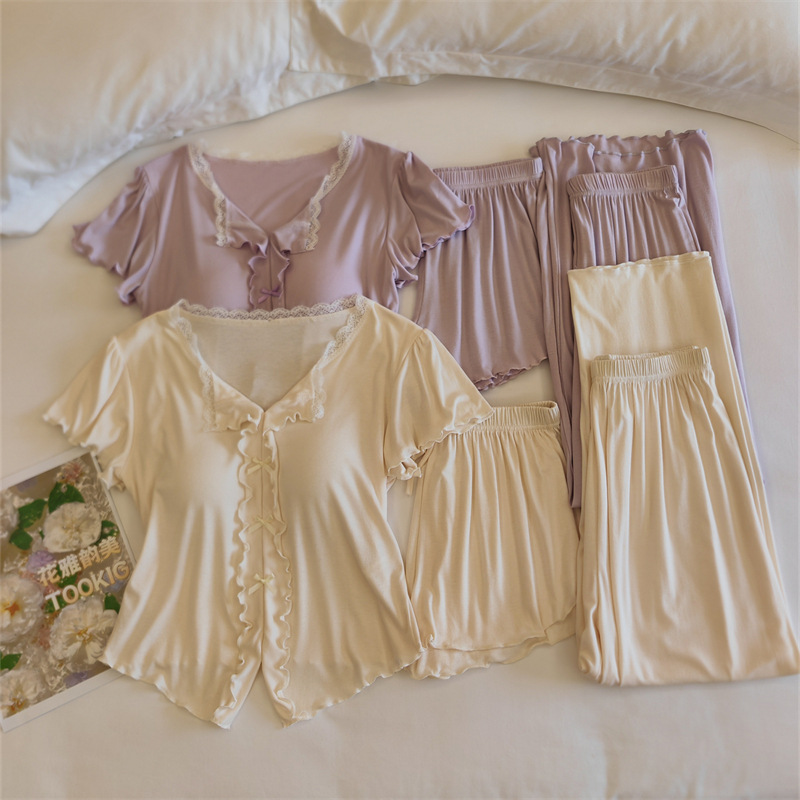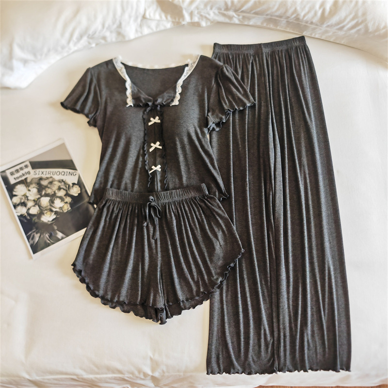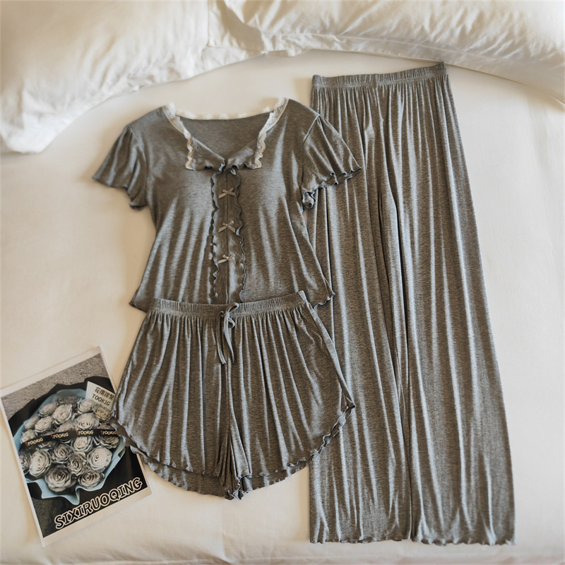 여성용 모달 잠옷 여름 반팔 반바지와 바지 3 피스 얇은 섹시한 순수한 욕망 스타일 가슴 패드 홈웨어