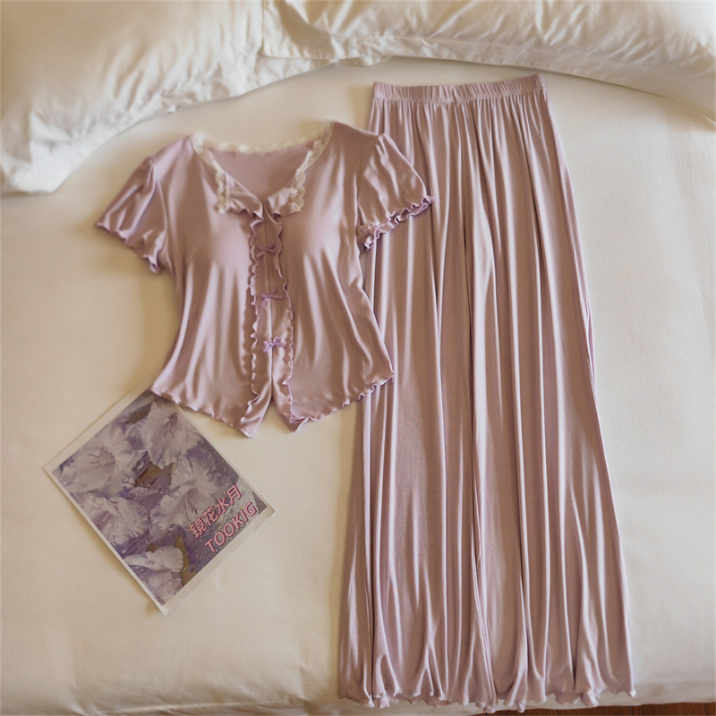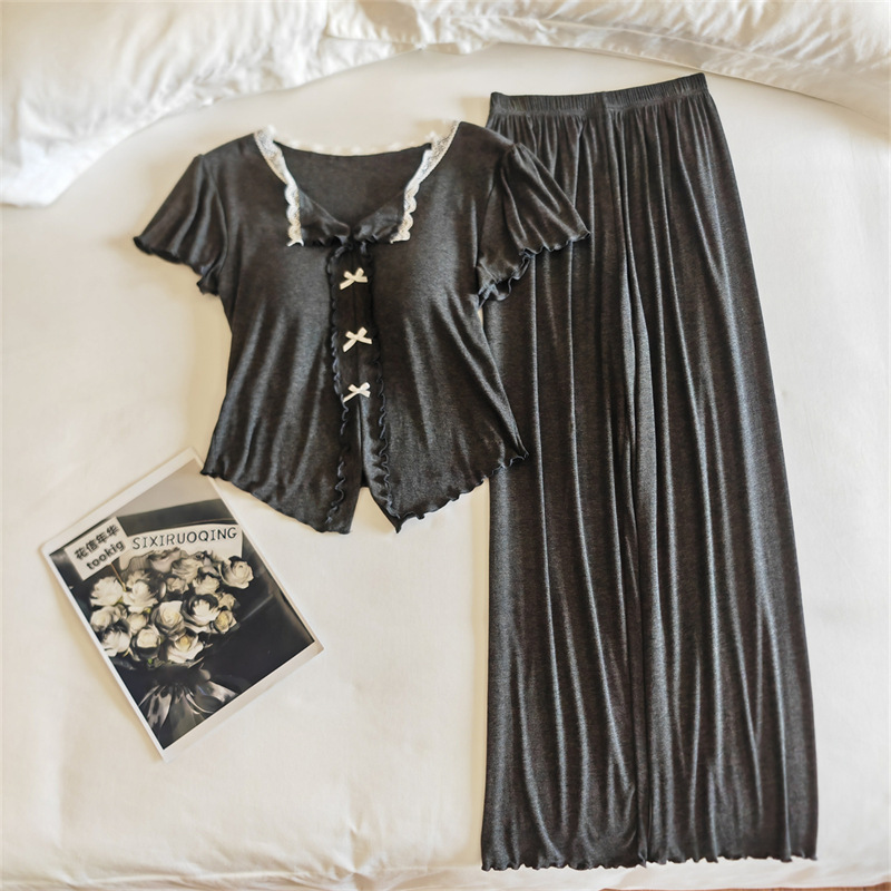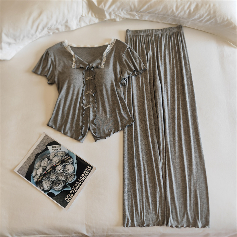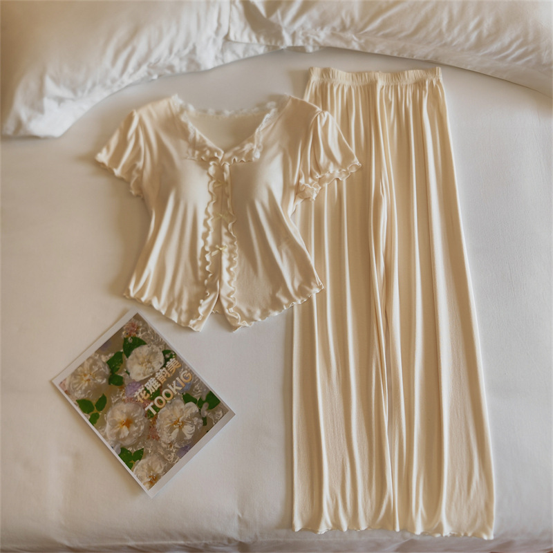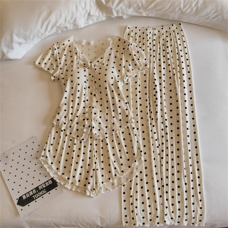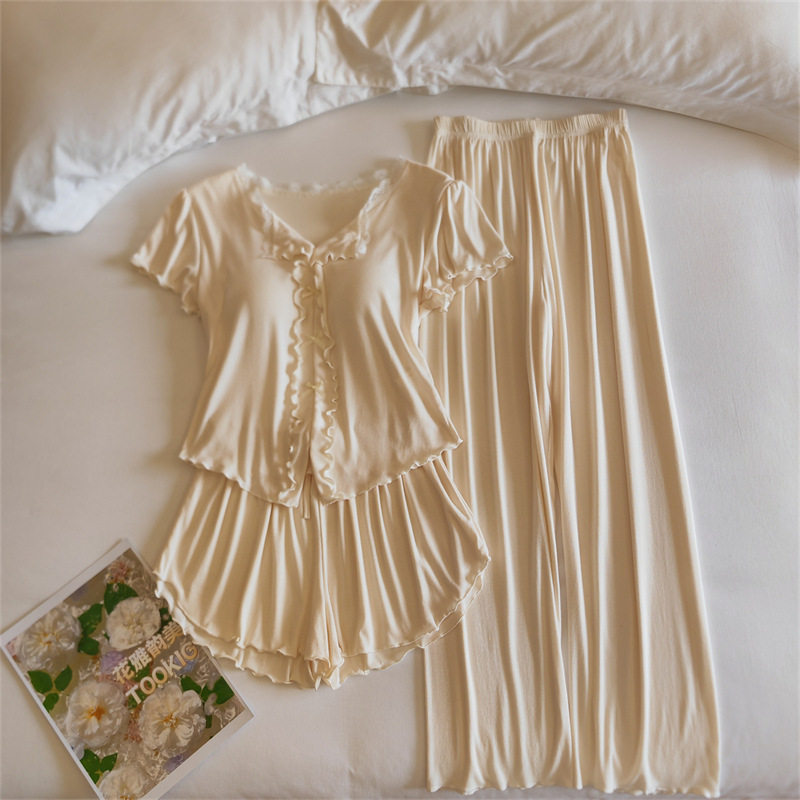 여성용 모달 잠옷 여름 반팔 반바지와 바지 3 피스 얇은 섹시한 순수한 욕망 스타일 가슴 패드 홈웨어