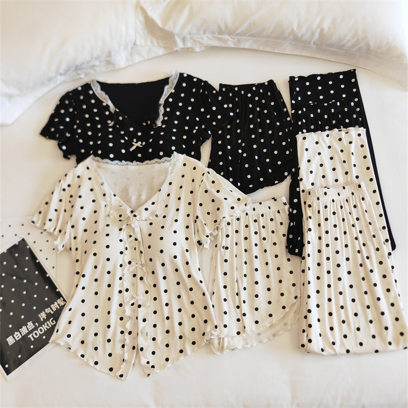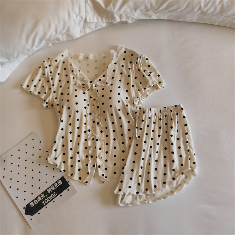 • 33052#폴카 도트 밀크 화이트(고정 가슴 패드 포함) 반팔 + 반바지 + 바지