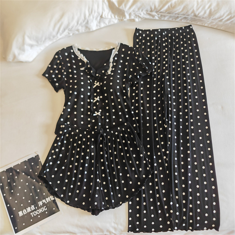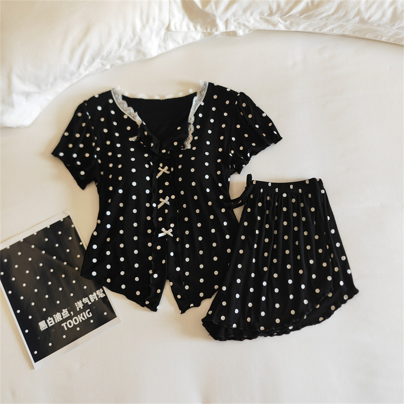 • 33052#폴카 도트 레트로 블랙 (고정 가슴 패드 포함) 반팔 + 반바지 + 바지