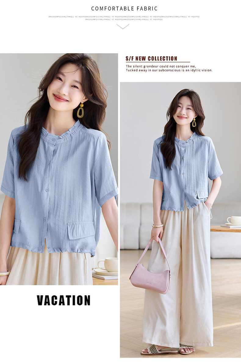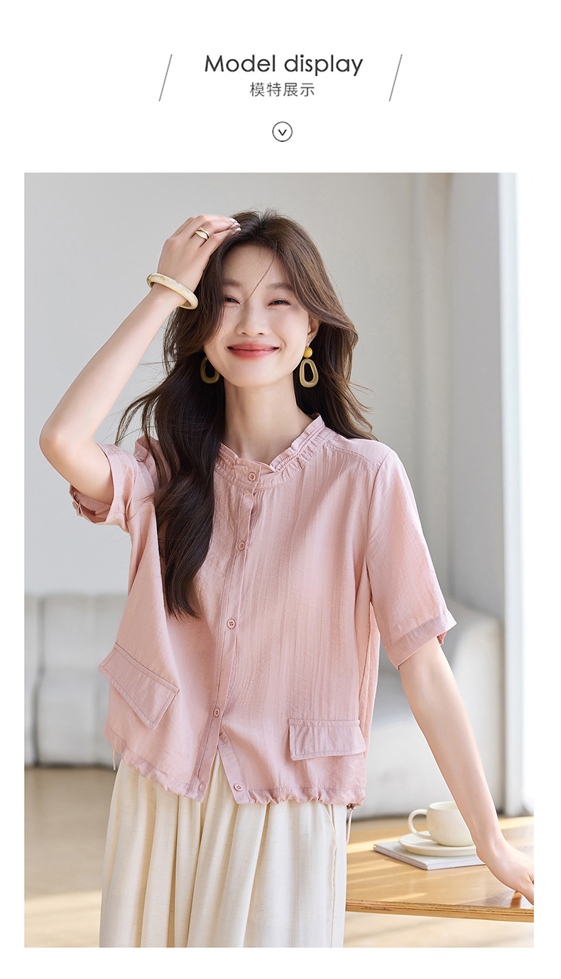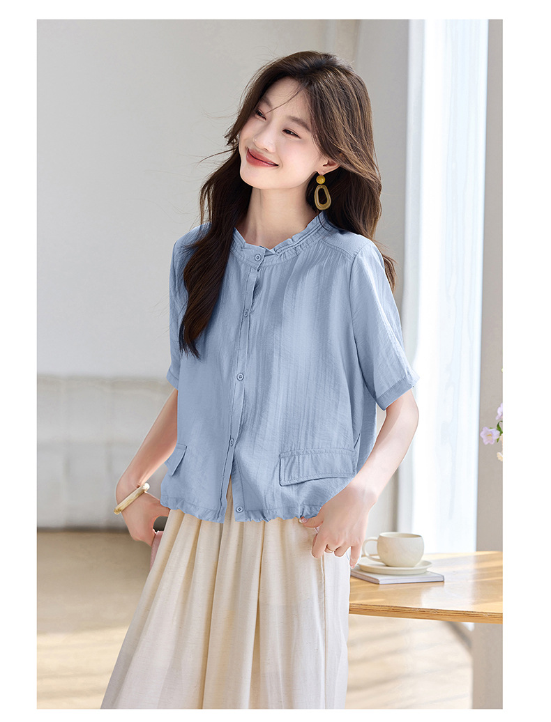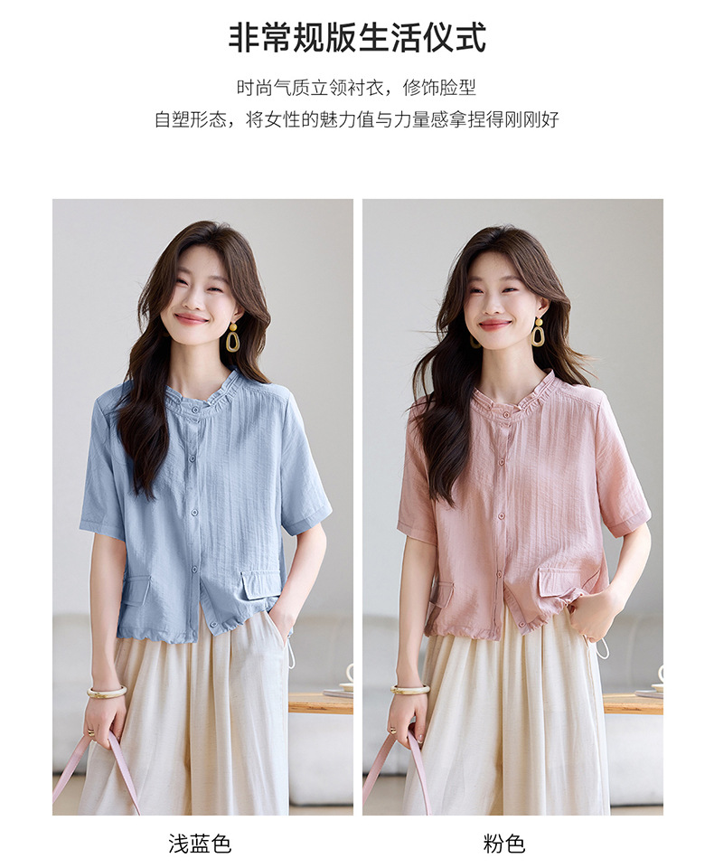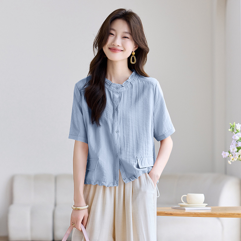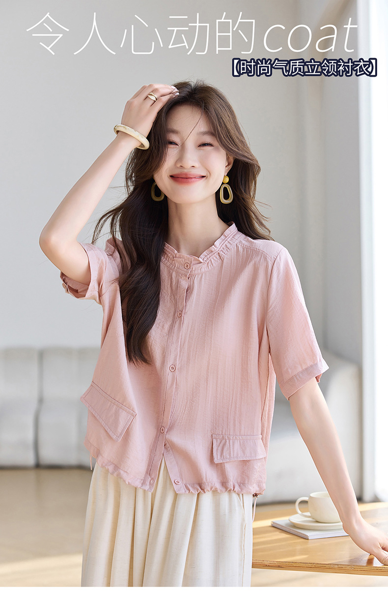 2025년 여름 새로운 스타일 프렌치 텐셀 코튼과 린넨 스탠드 칼라 여성용 반팔 셔츠, 아름다운 셔츠, 가디건 탑스토어 가기