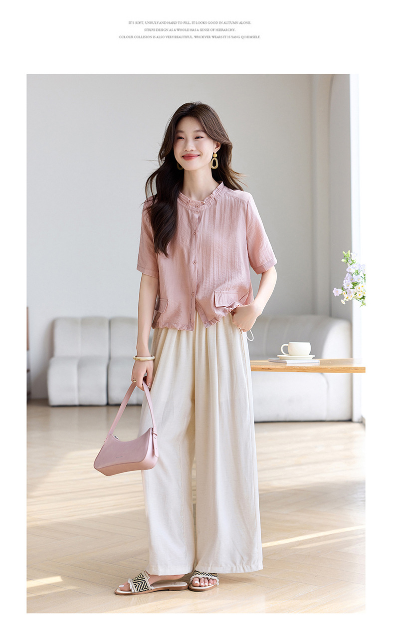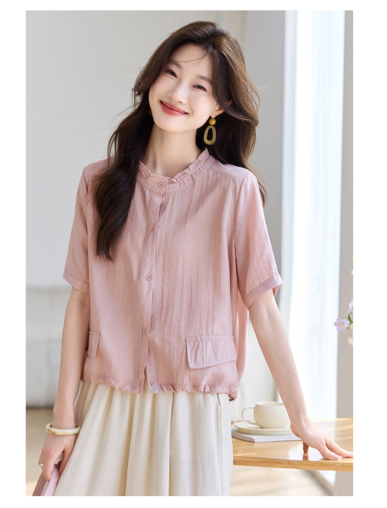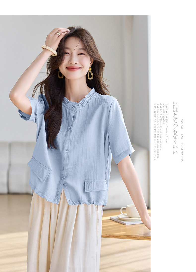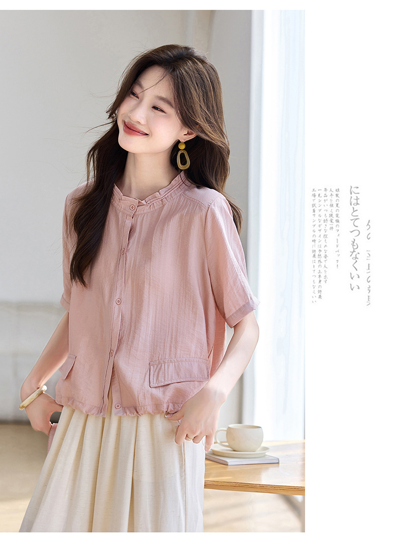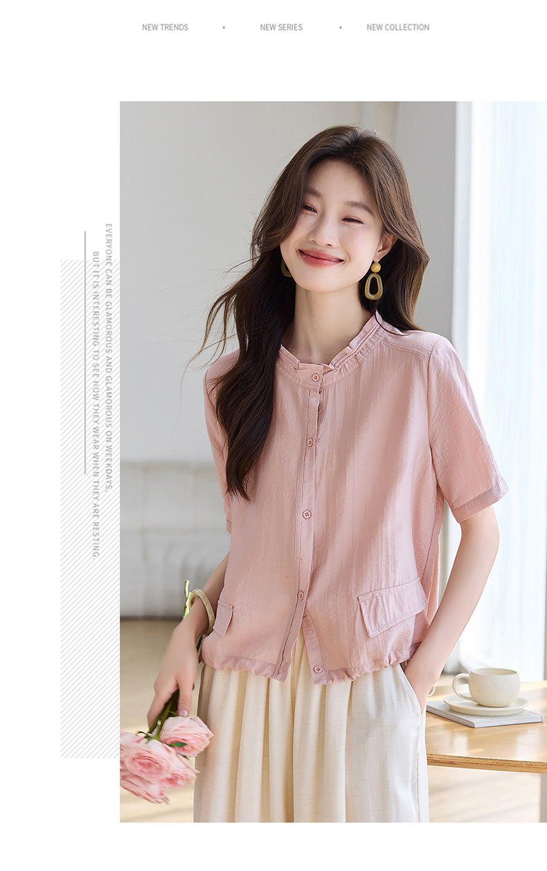 2025년 여름 새로운 스타일 프렌치 텐셀 코튼과 린넨 스탠드 칼라 여성용 반팔 셔츠, 아름다운 셔츠, 가디건 탑스토어 가기