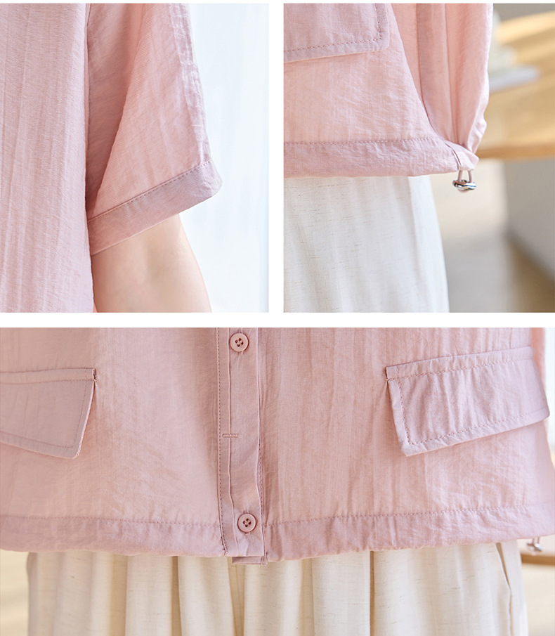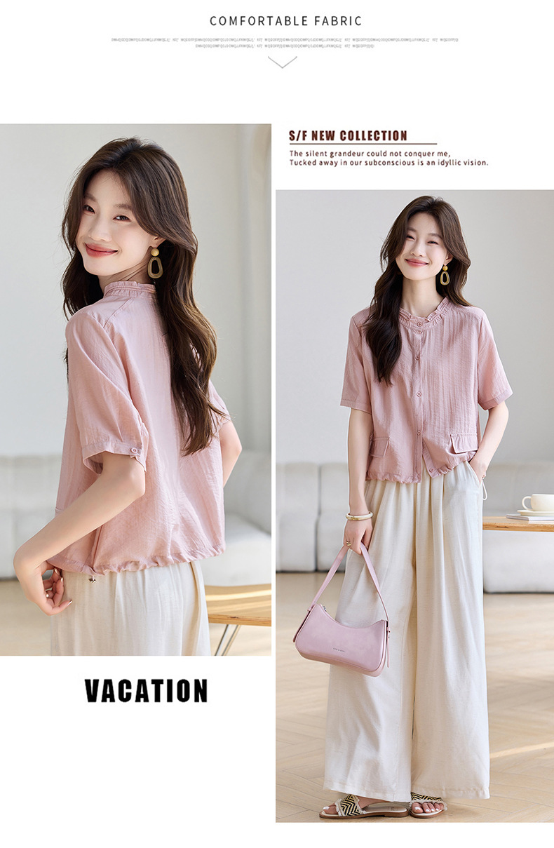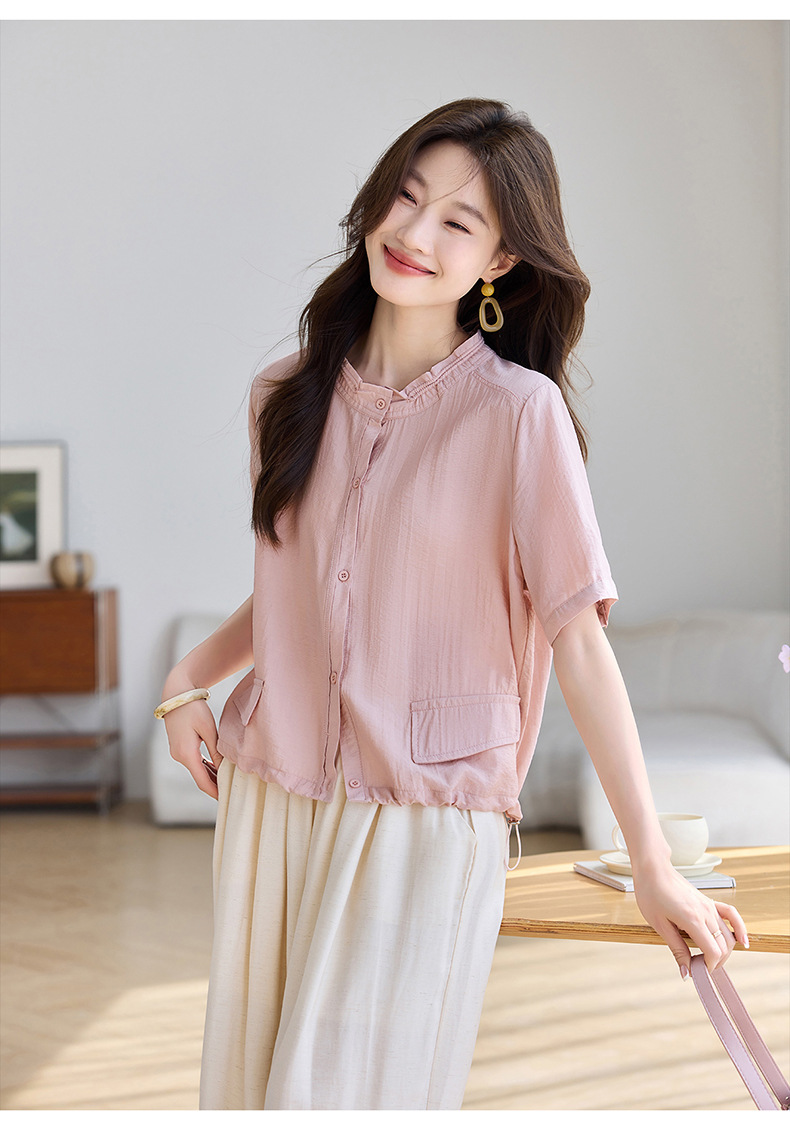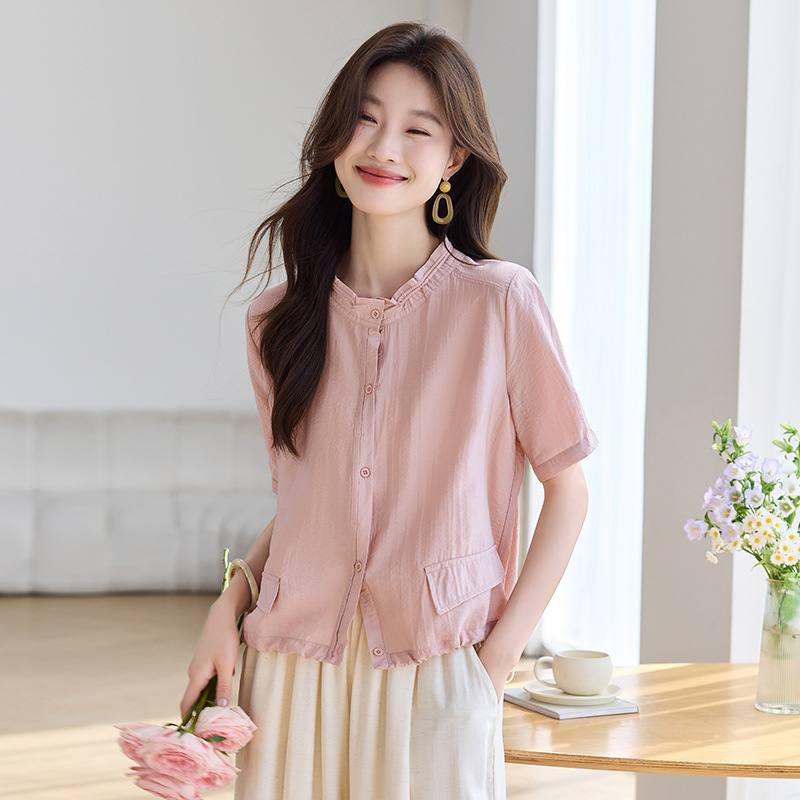 2025년 여름 새로운 스타일 프렌치 텐셀 코튼과 린넨 스탠드 칼라 여성용 반팔 셔츠, 아름다운 셔츠, 가디건 탑