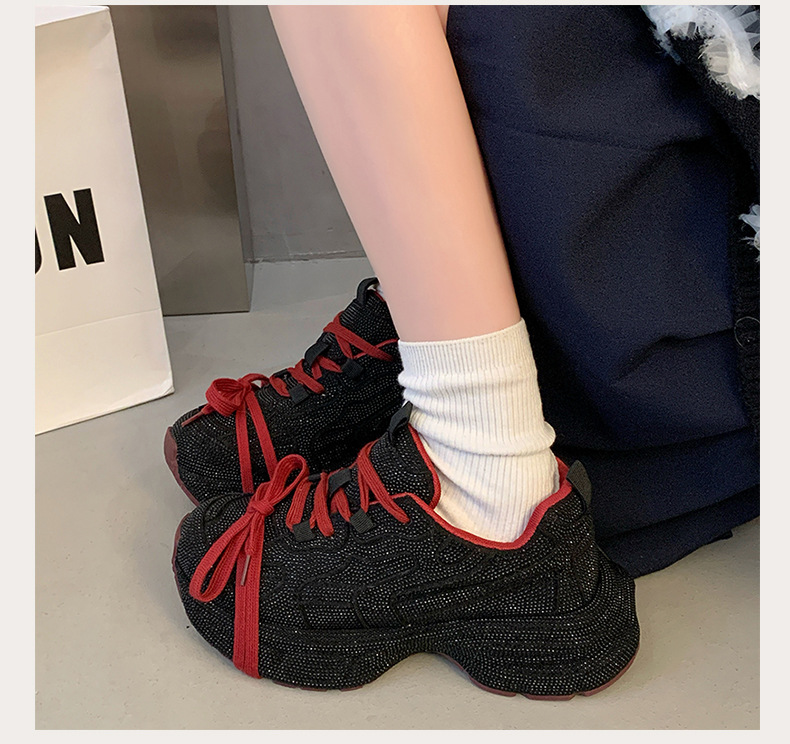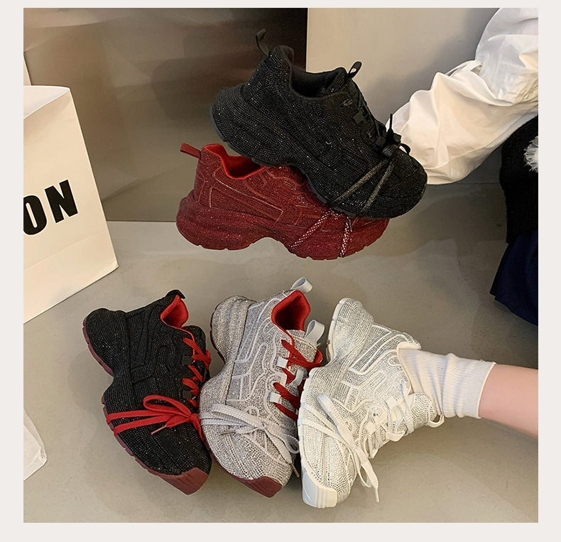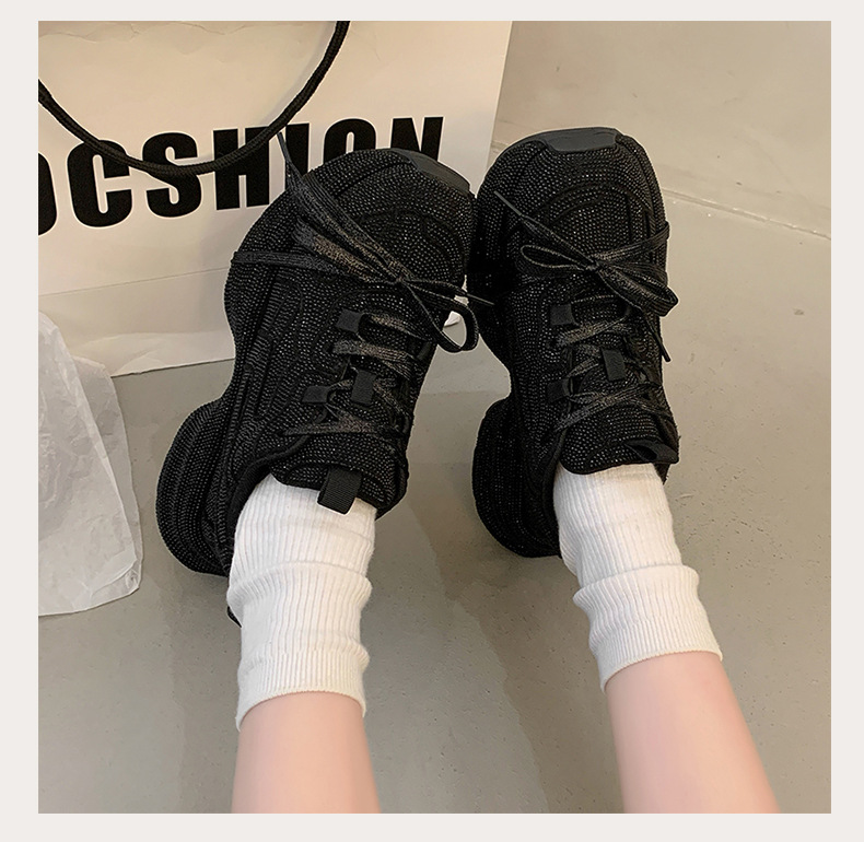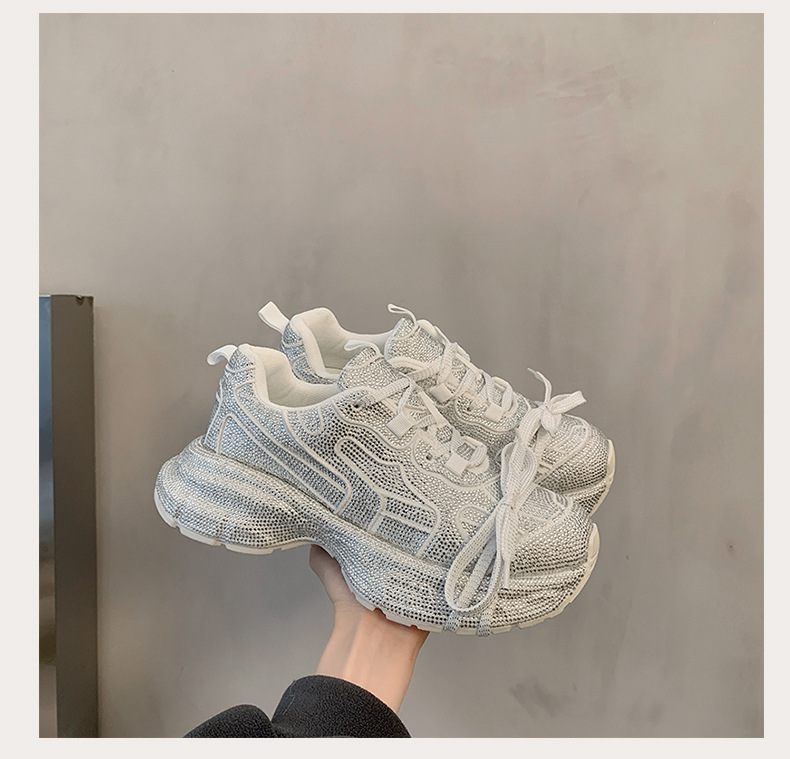 유럽 여성 신발 라인스톤 두꺼운 밑창 아빠 신발 여성 2025 새로운 야외 스포츠 및 레저 신발 전체 다이아몬드 플랫폼 신발스토어 가기