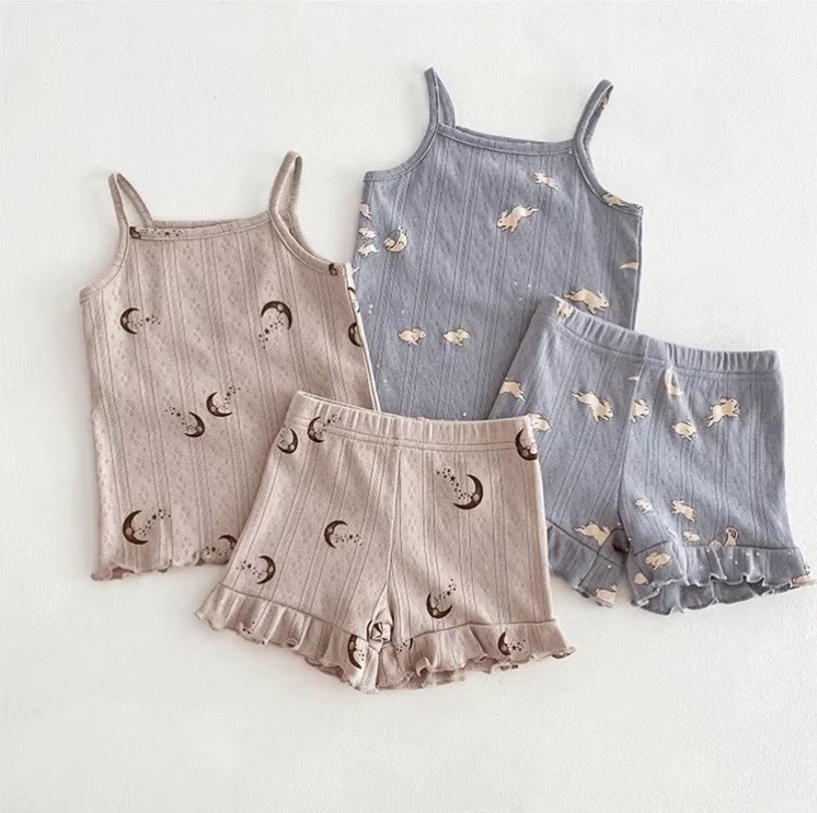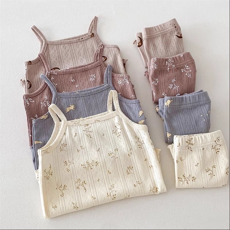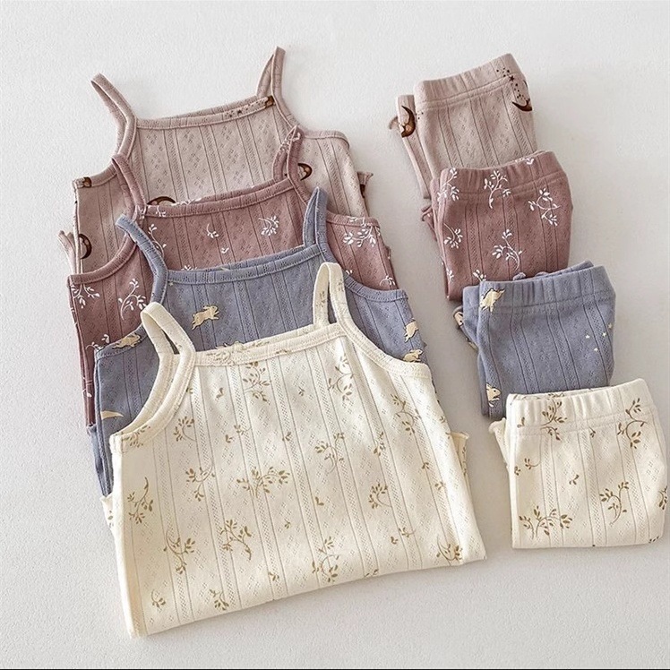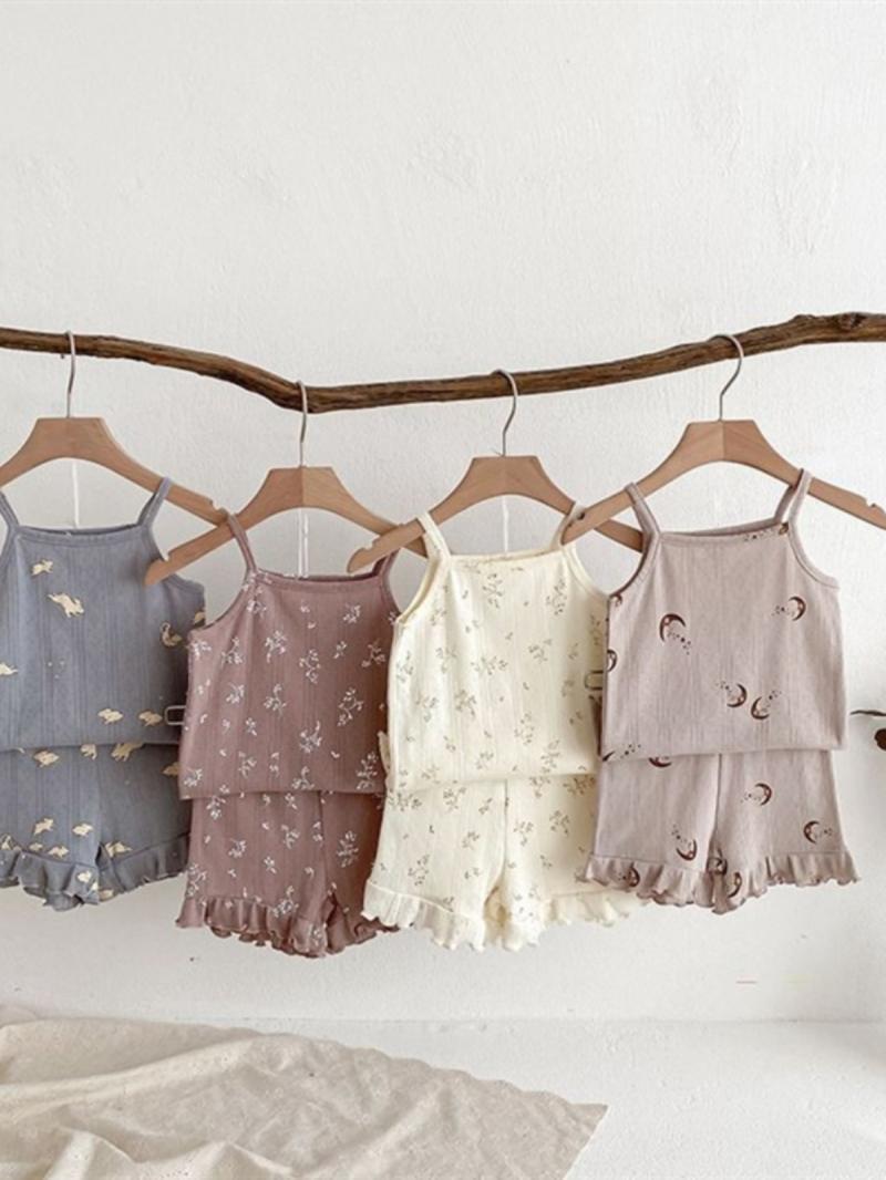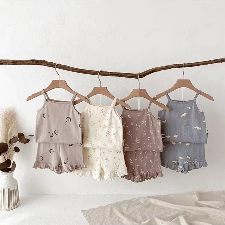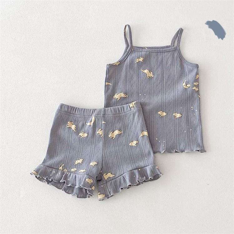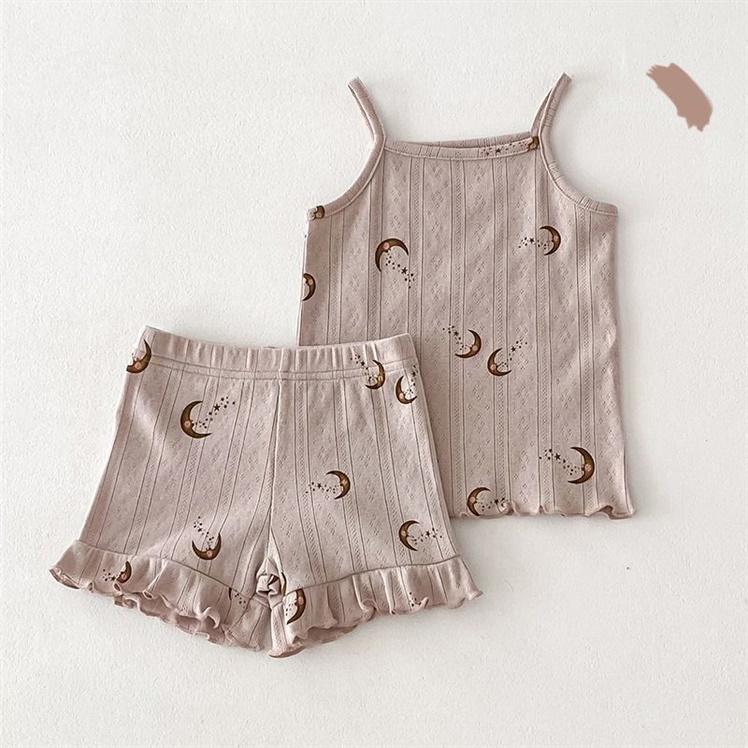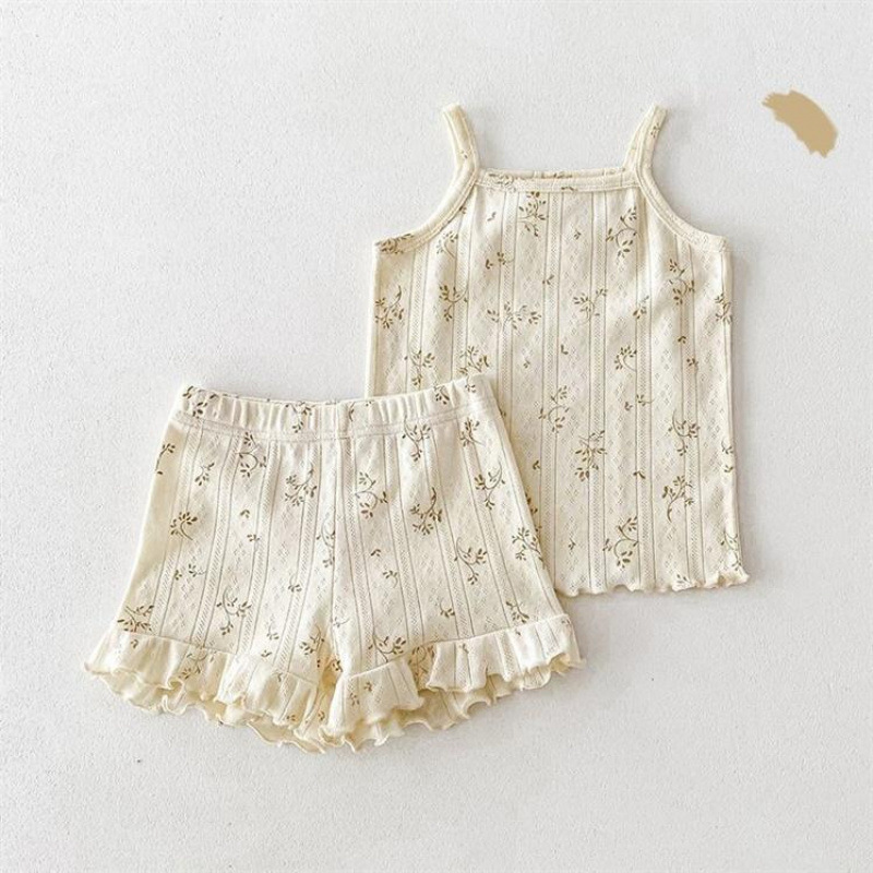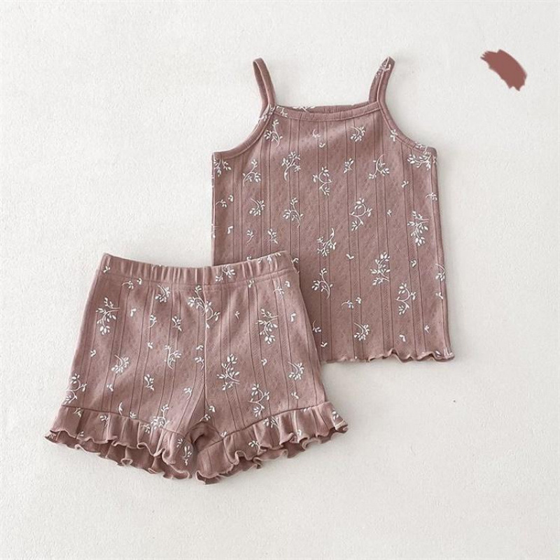 여자 여름 서스펜더 반바지 홈웨어 세트 아기 소녀 꽃 에어컨 옷 어린이 잠옷 투피스 세트 아동복스토어 가기