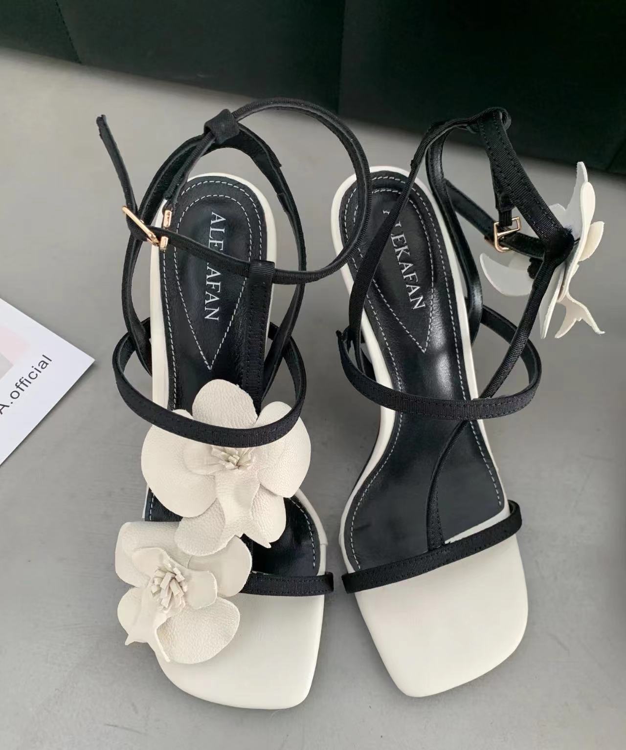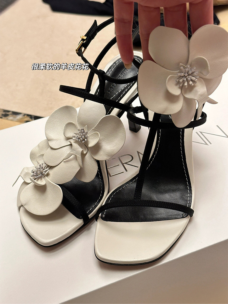 고급 디자인의 흰색 꽃 오픈 토 샌들, 여성용 요정 스타일 원라인 하이힐, 여성용 스틸레토 스퀘어 토 슈즈스토어 가기