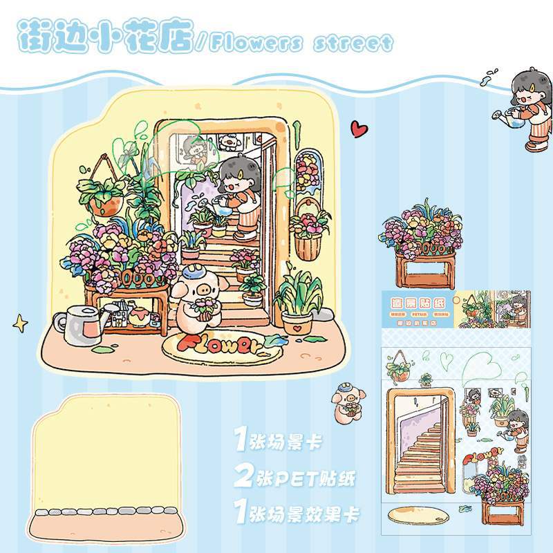 한국 만화 조경 스티커 귀여운 시각적 3D 입체 오두막 작은 빨간 책 감압 조경 장면 핸드북 스티커스토어 가기