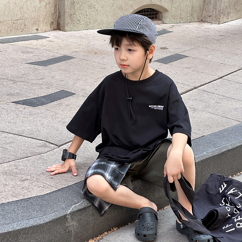 Elmo Beibei 트렌디 키즈 2025 여름 경량 얼음 느낌 코튼 레터 그래피티 티셔츠 소년 소녀 한국 스타일 통기성 탑 트렌디