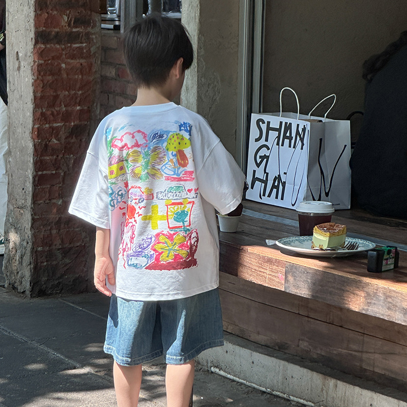 Elmo Beibei 트렌디 키즈 2025 여름 경량 얼음 느낌 코튼 레터 그래피티 티셔츠 소년 소녀 한국 스타일 통기성 탑 트렌디스토어 가기