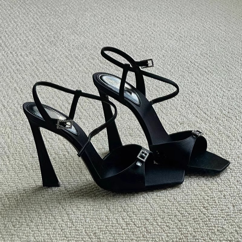 2026년 신상 아름다운 원스트랩 오픈토 하이힐 여성용 프렌치 스타일 블랙 고급스러운 스틸레토 힐 라인스톤 샌들 여성 여름용스토어 가기