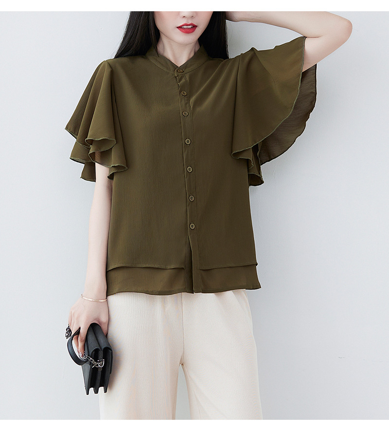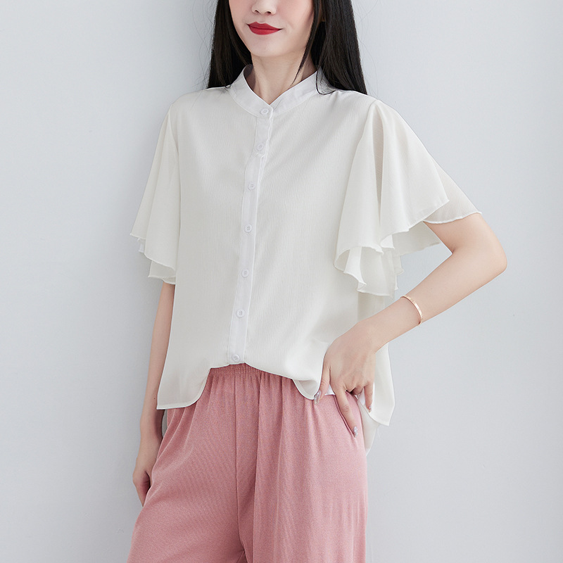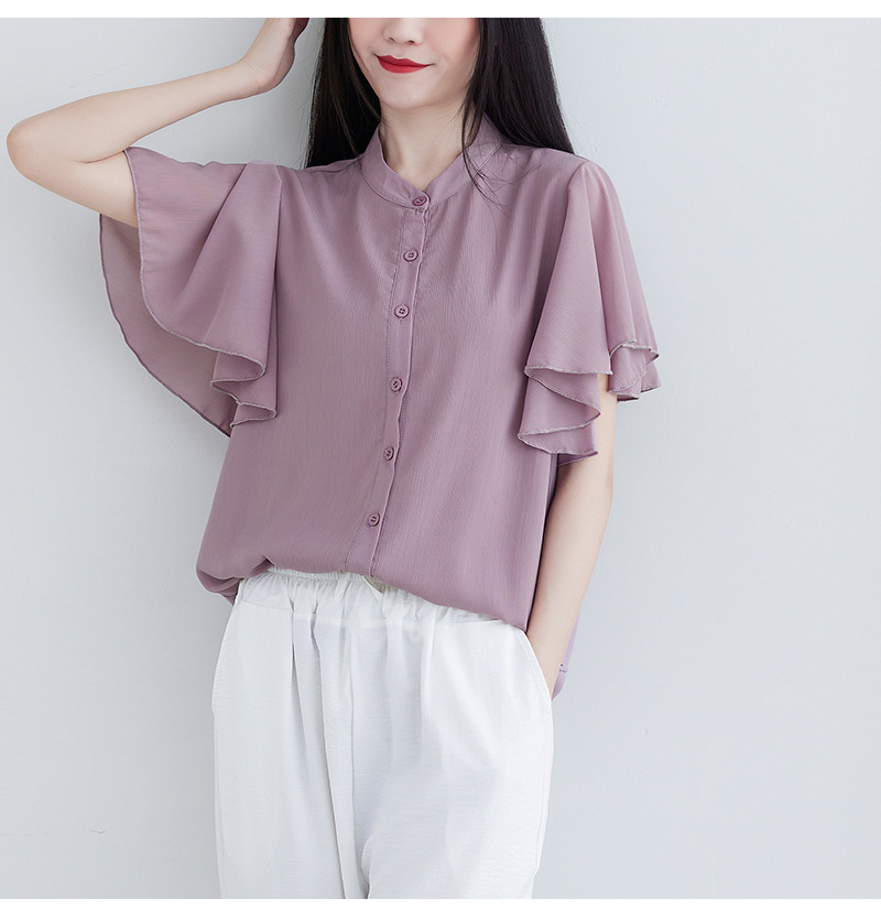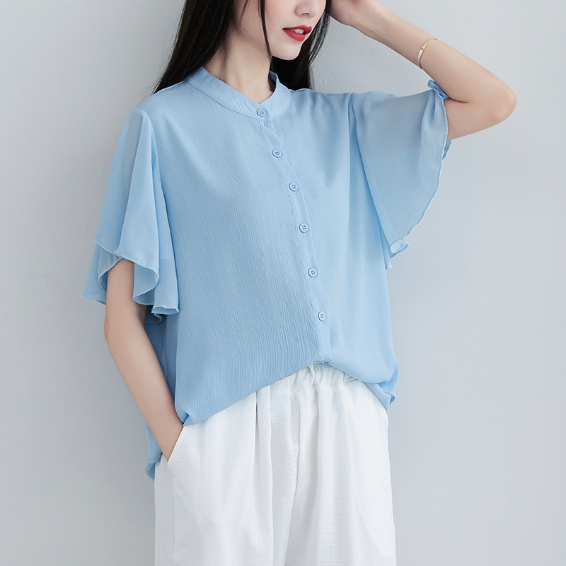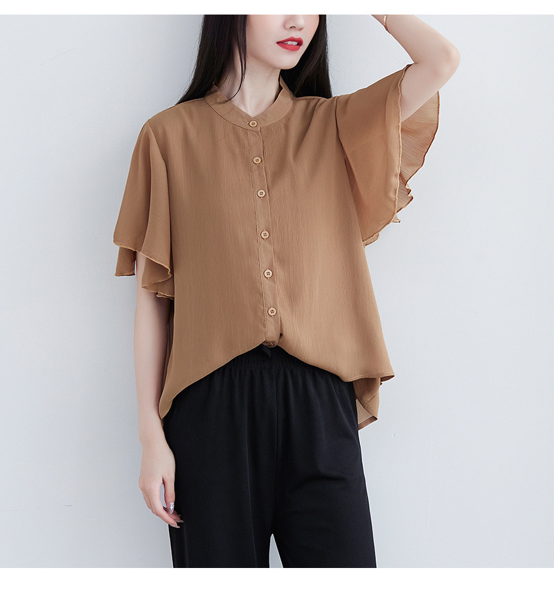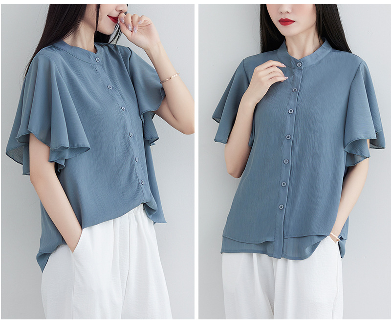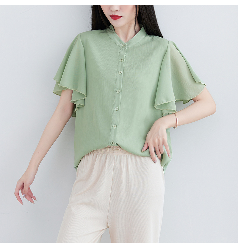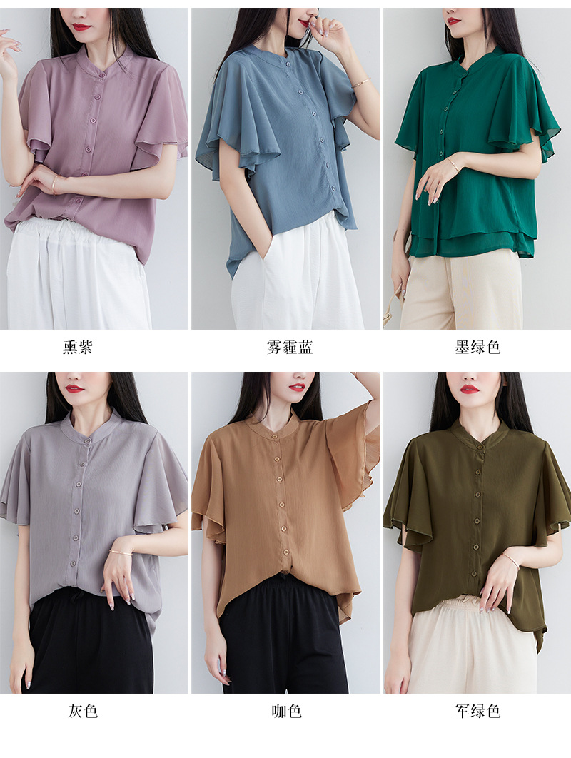 11가지 색상! 2022 여름 새로운 느슨한 스탠드 칼라 프릴 반팔 셔츠 여성 쉬폰 탑 크로스 보더 여성 의류스토어 가기