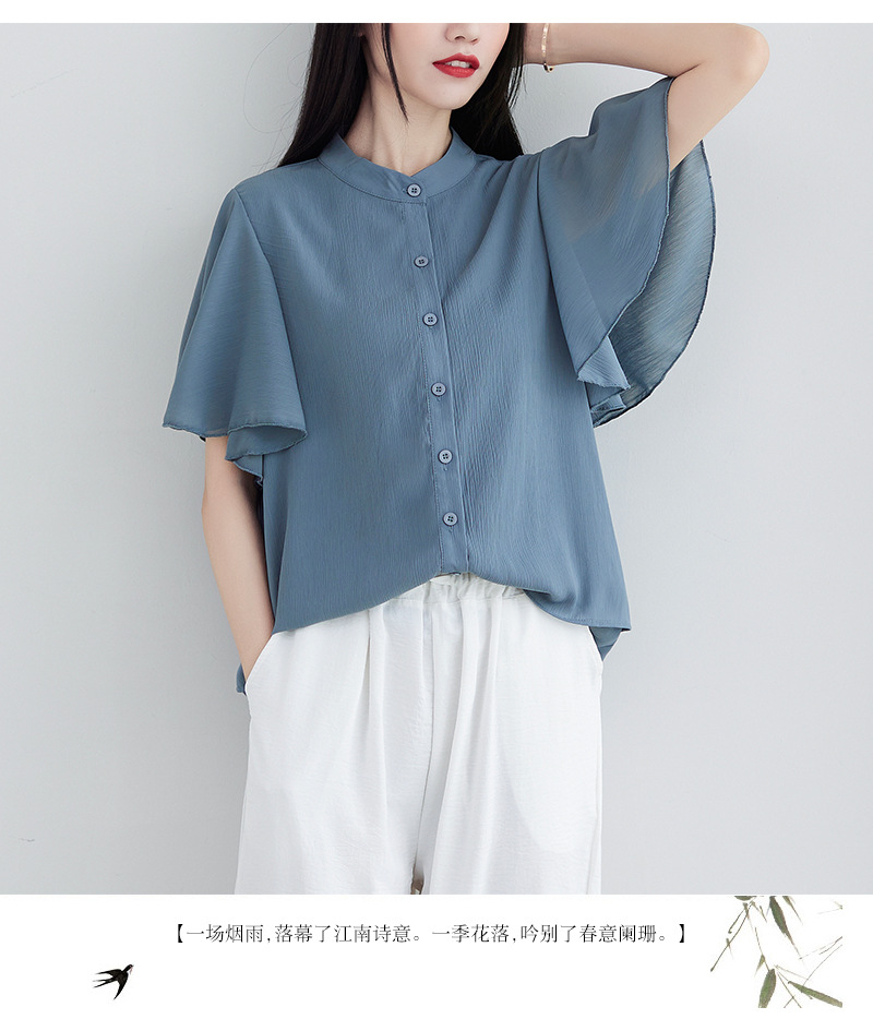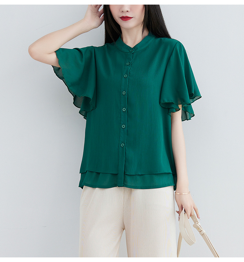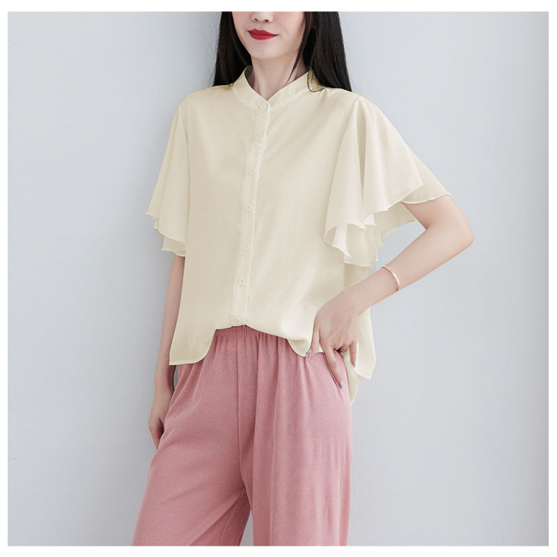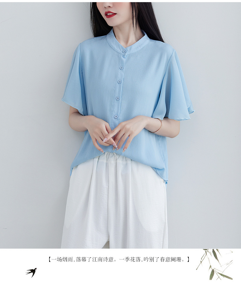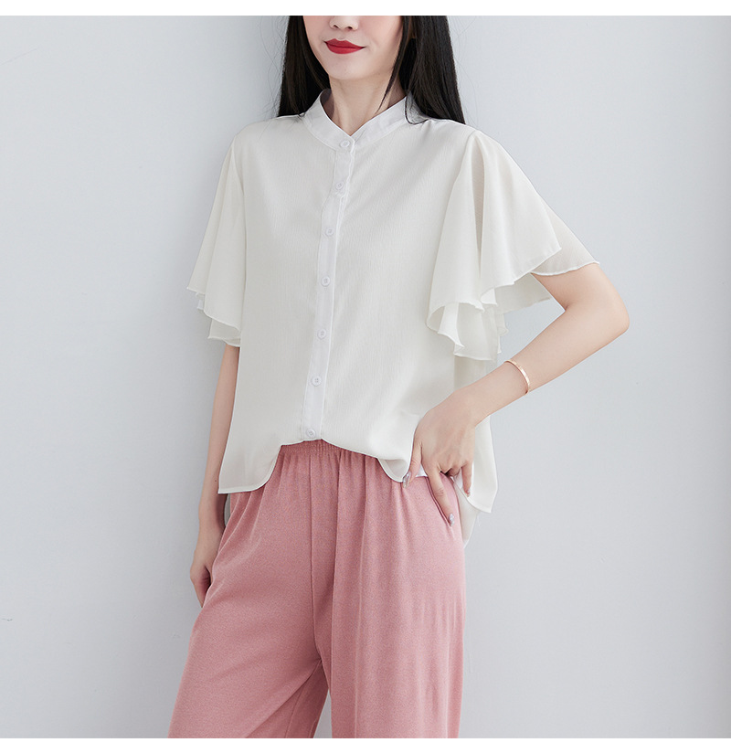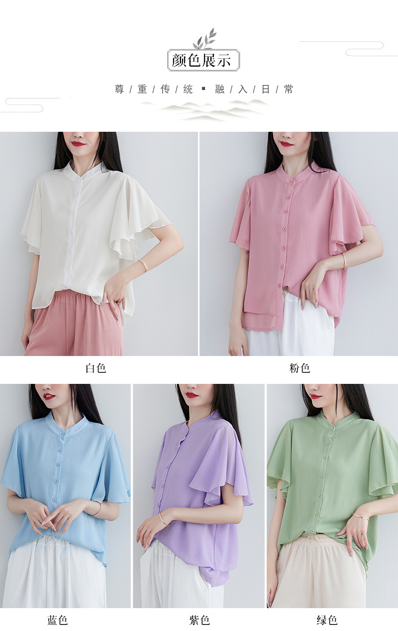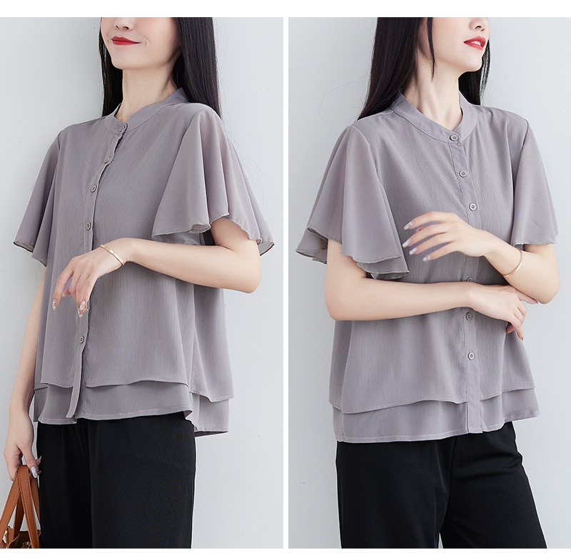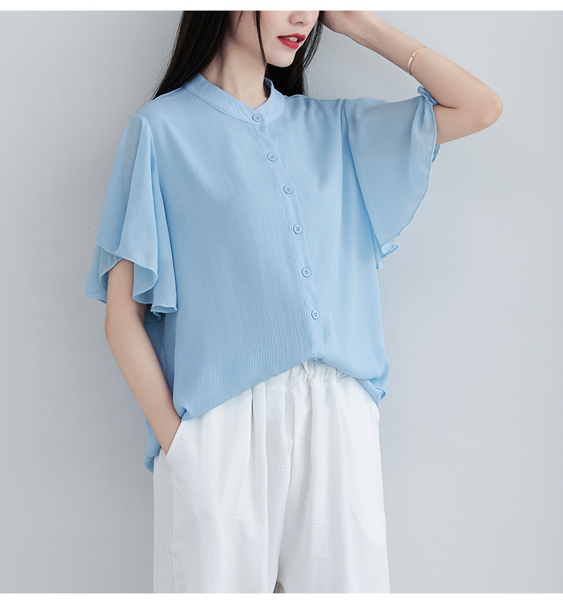 11가지 색상! 2022 여름 새로운 느슨한 스탠드 칼라 프릴 반팔 셔츠 여성 쉬폰 탑 크로스 보더 여성 의류스토어 가기