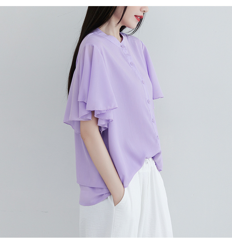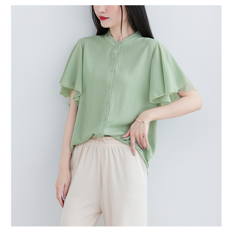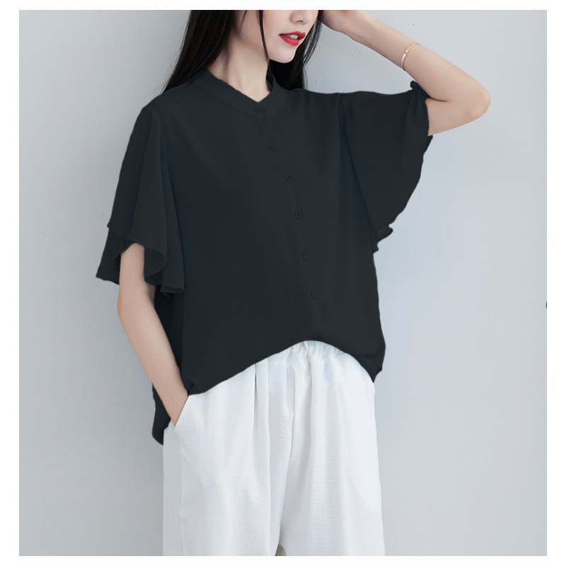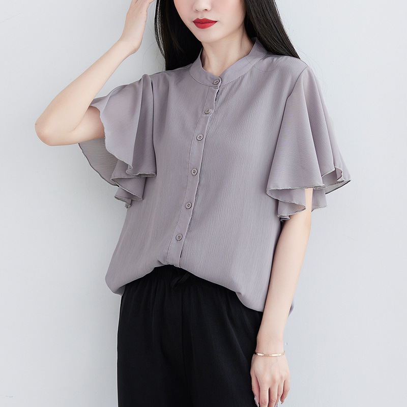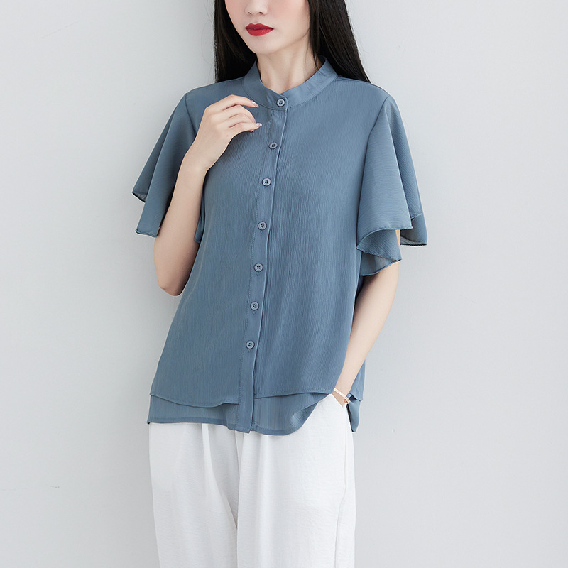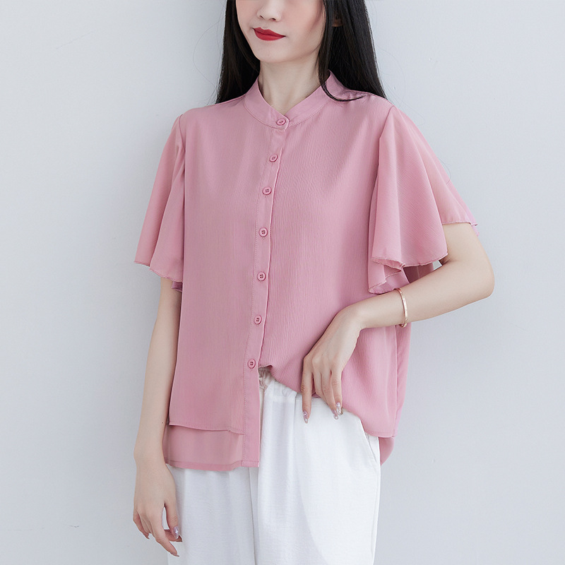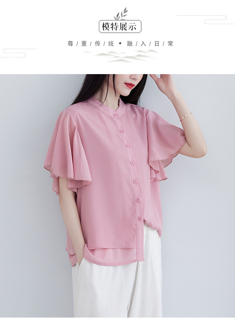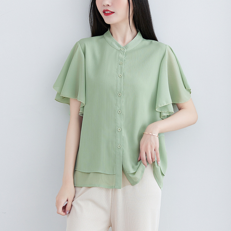 11가지 색상! 2022 여름 새로운 느슨한 스탠드 칼라 프릴 반팔 셔츠 여성 쉬폰 탑 크로스 보더 여성 의류스토어 가기