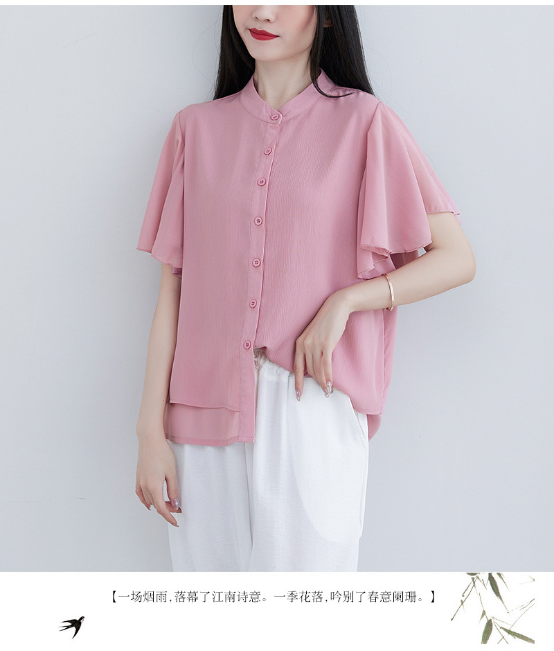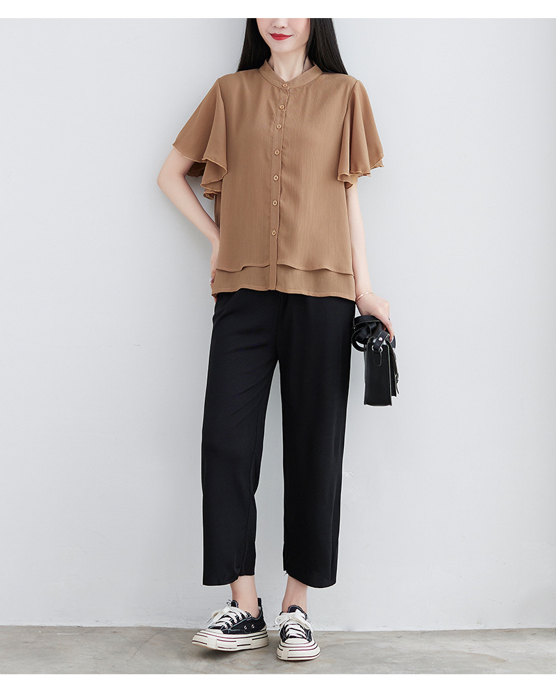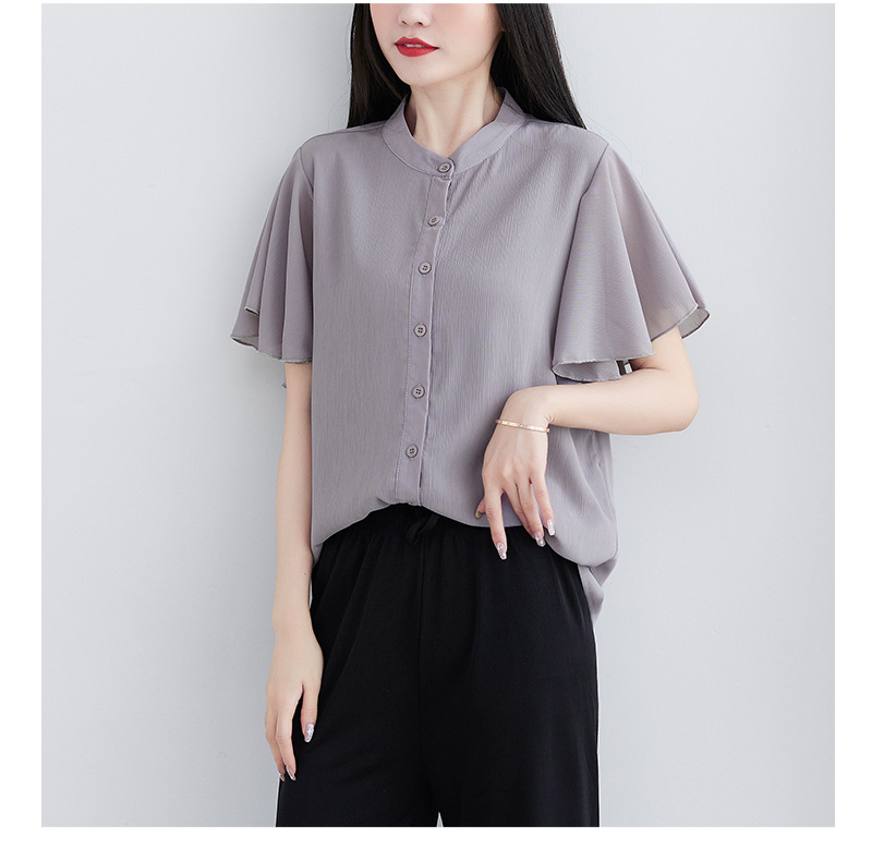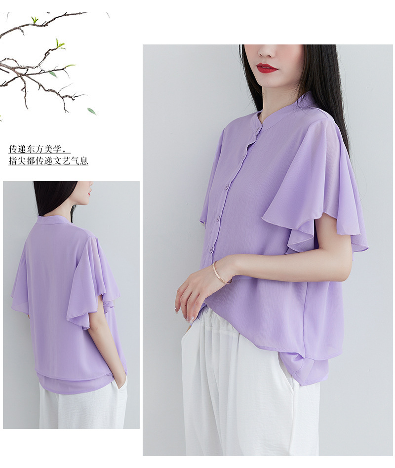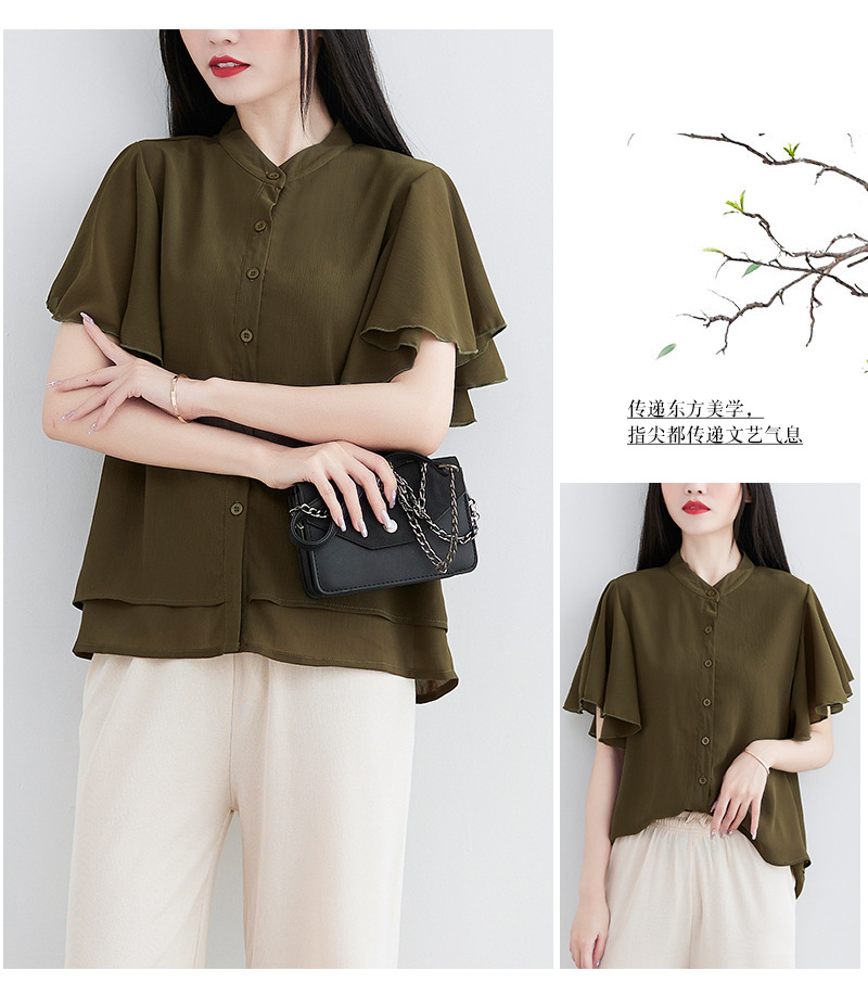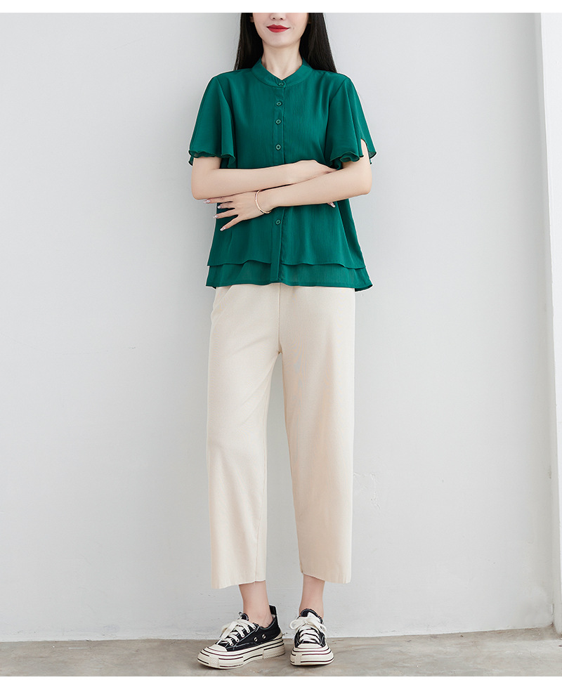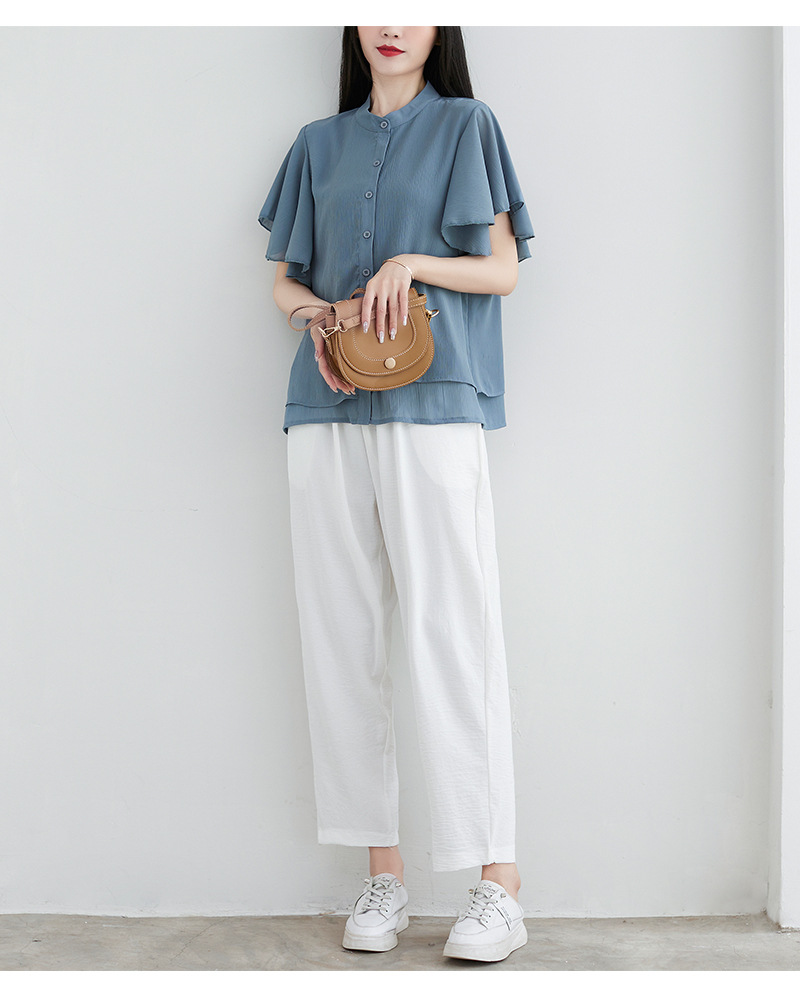 11가지 색상! 2022 여름 새로운 느슨한 스탠드 칼라 프릴 반팔 셔츠 여성 쉬폰 탑 크로스 보더 여성 의류스토어 가기