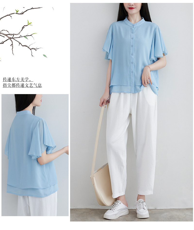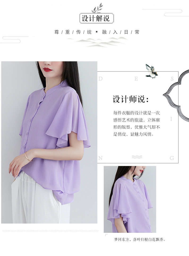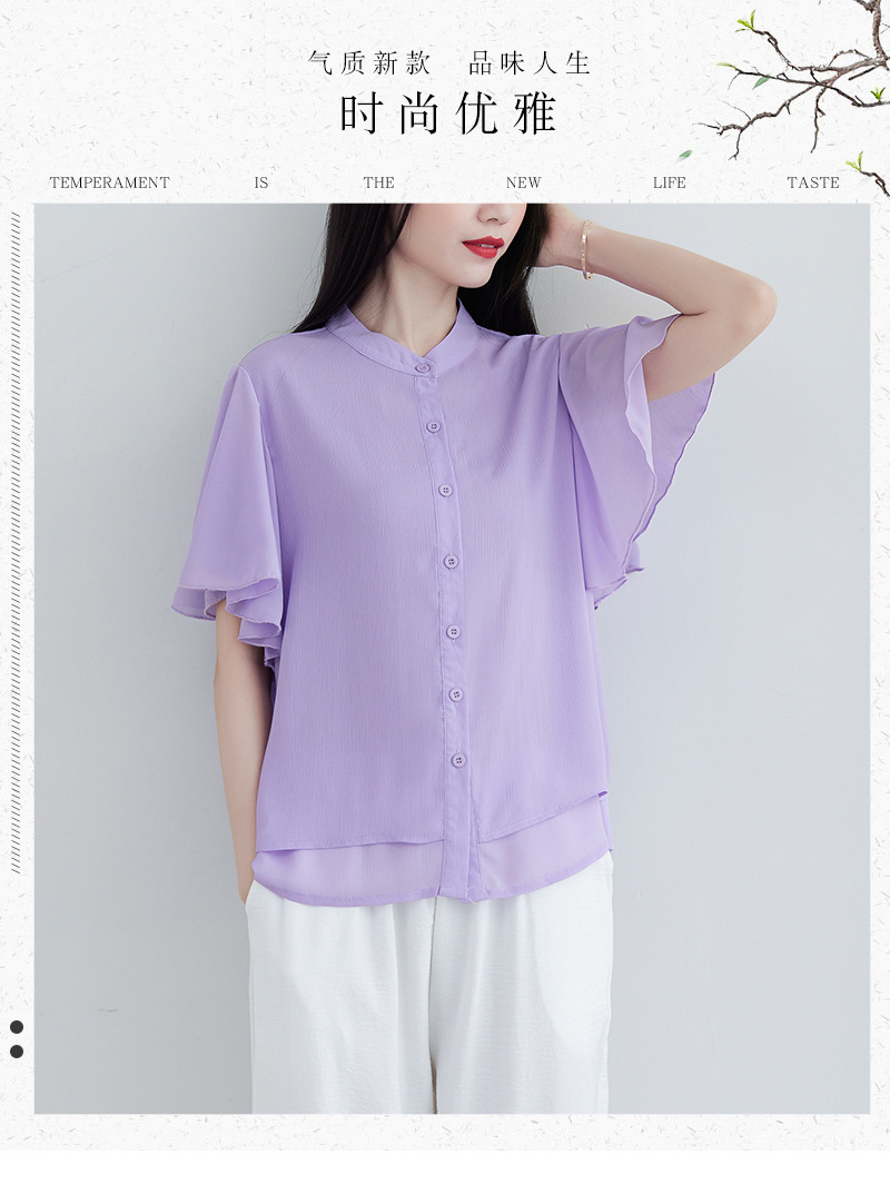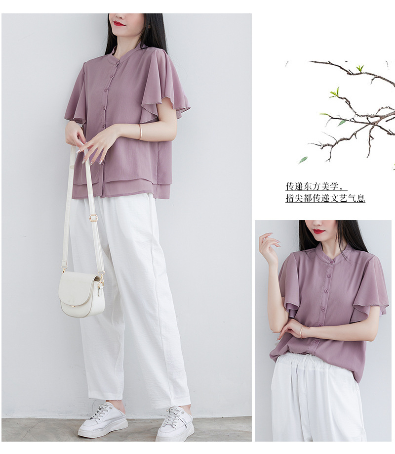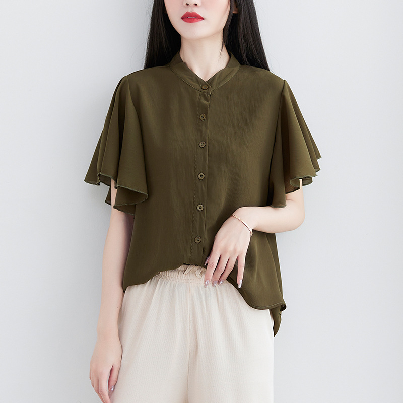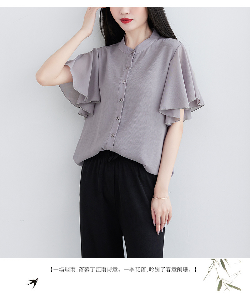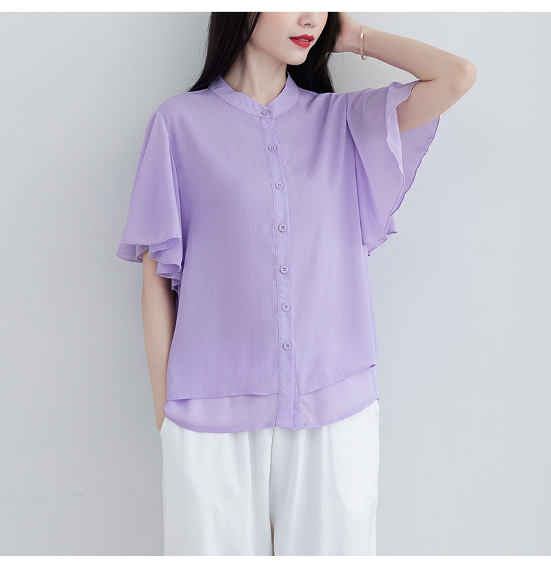 11가지 색상! 2022 여름 새로운 느슨한 스탠드 칼라 프릴 반팔 셔츠 여성 쉬폰 탑 크로스 보더 여성 의류스토어 가기