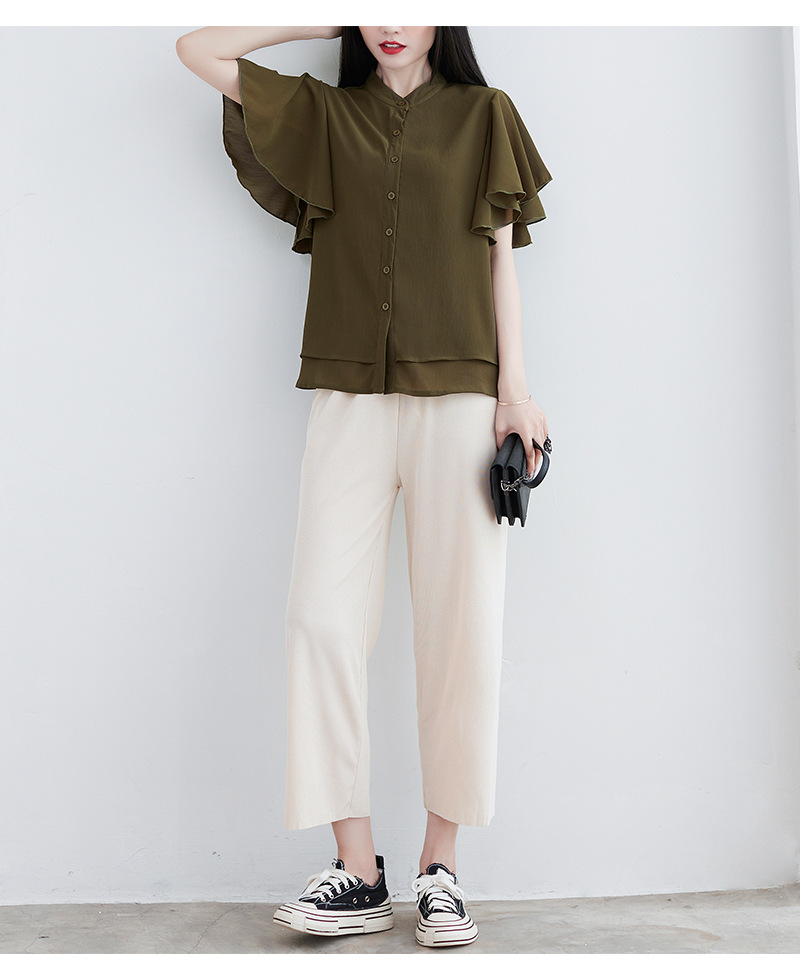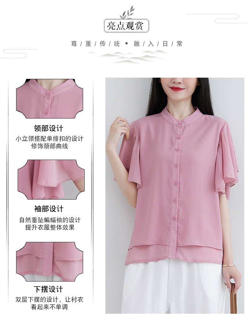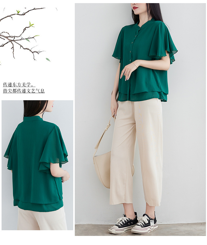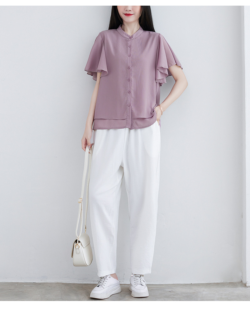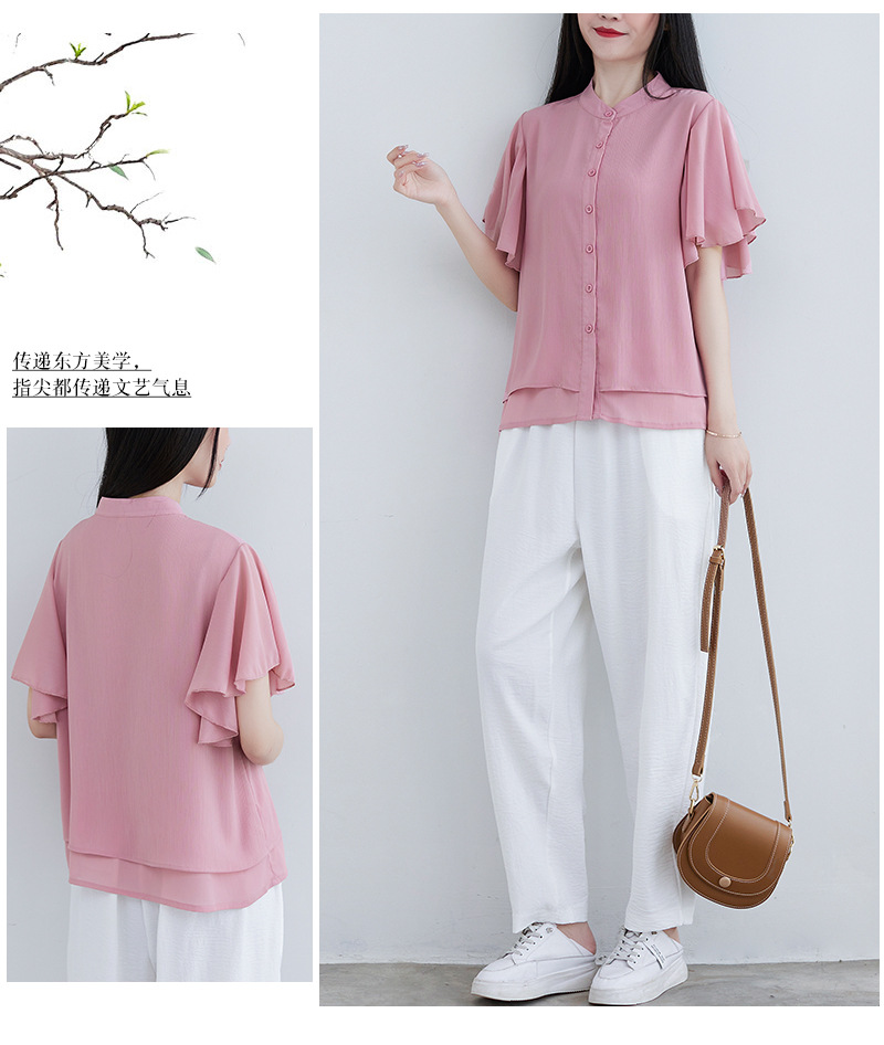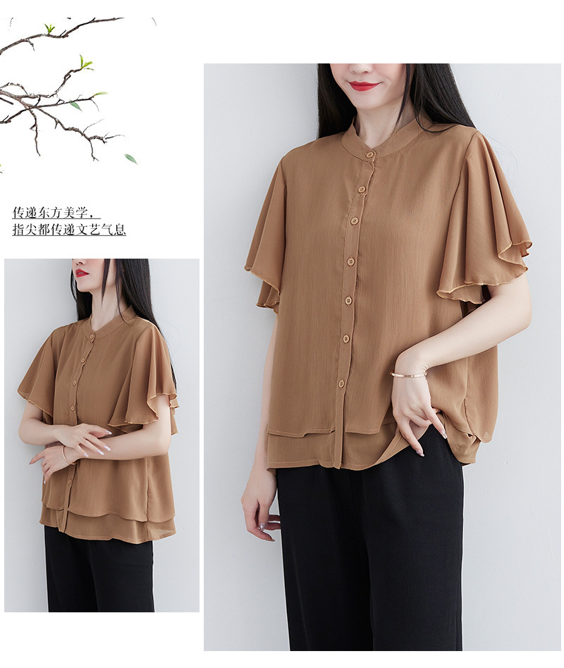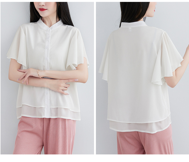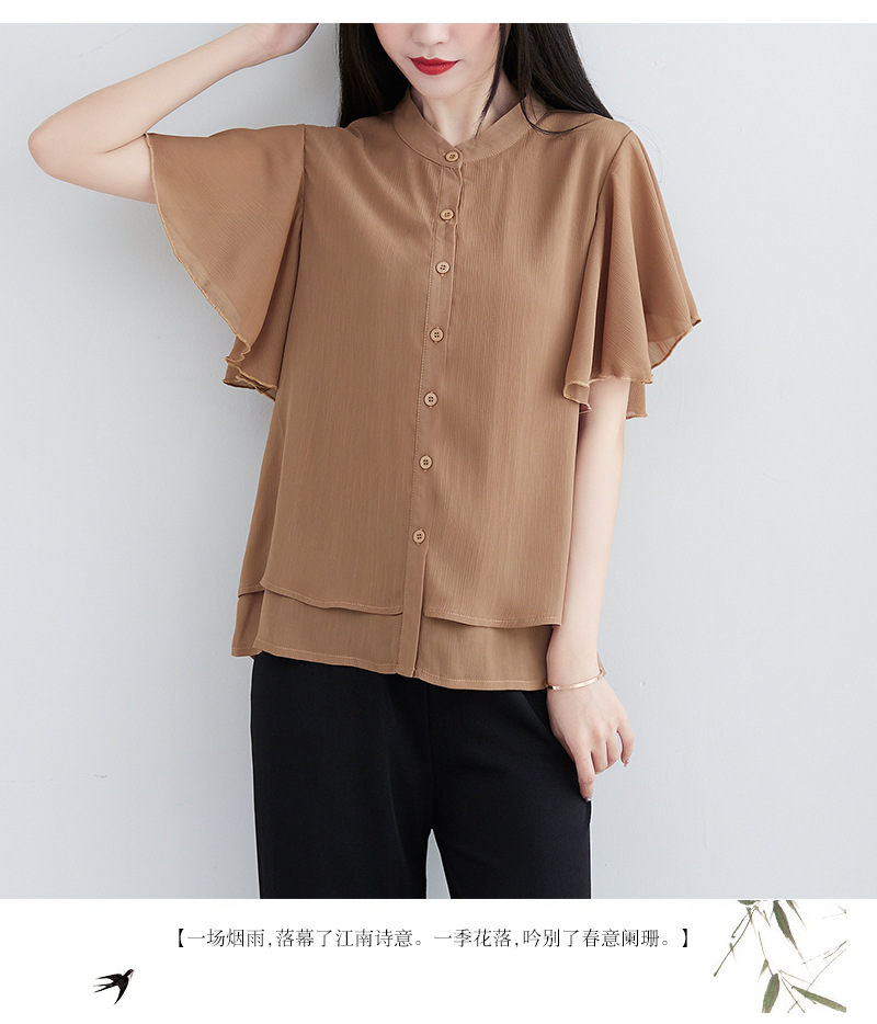 11가지 색상! 2022 여름 새로운 느슨한 스탠드 칼라 프릴 반팔 셔츠 여성 쉬폰 탑 크로스 보더 여성 의류스토어 가기