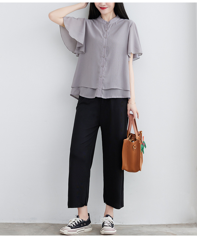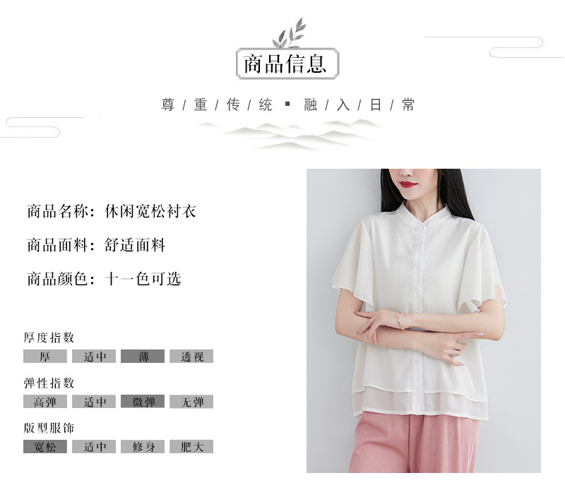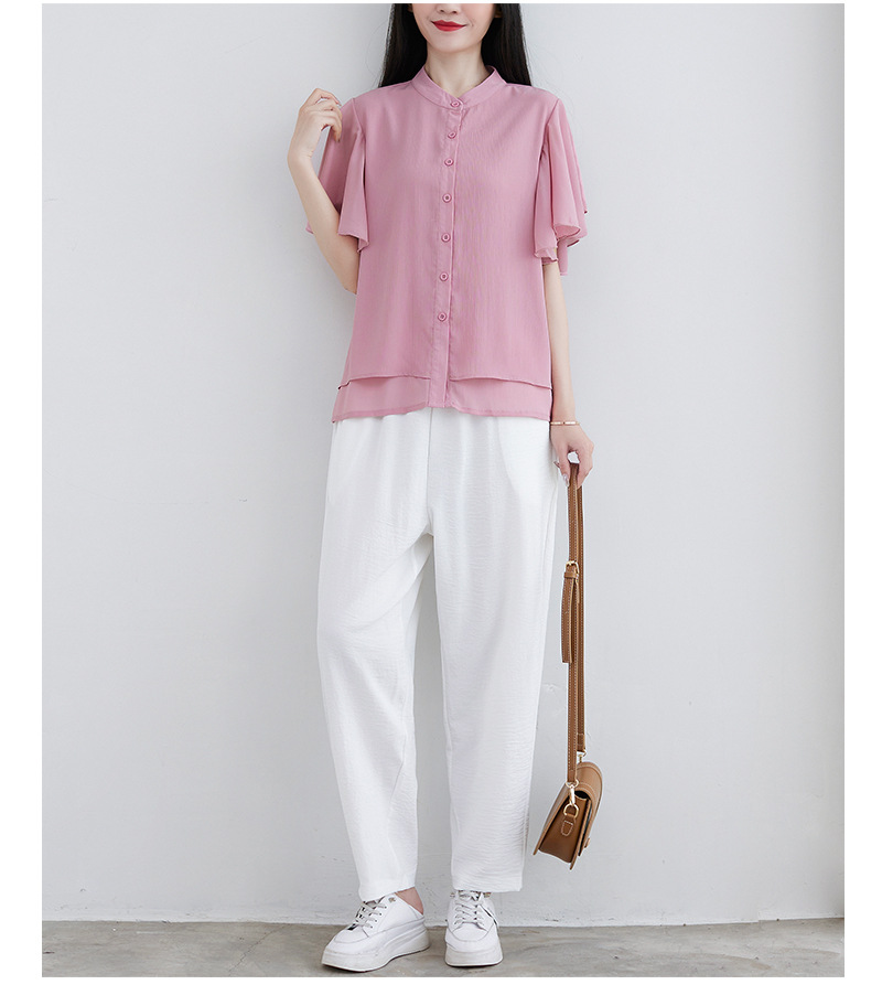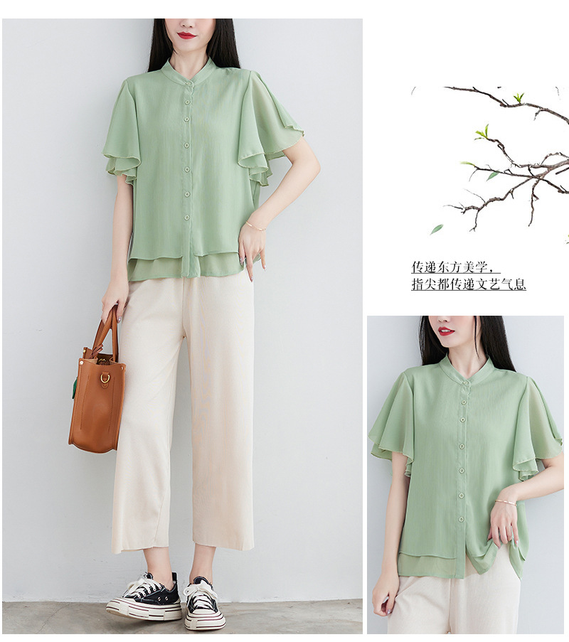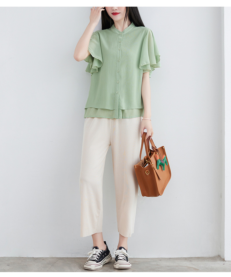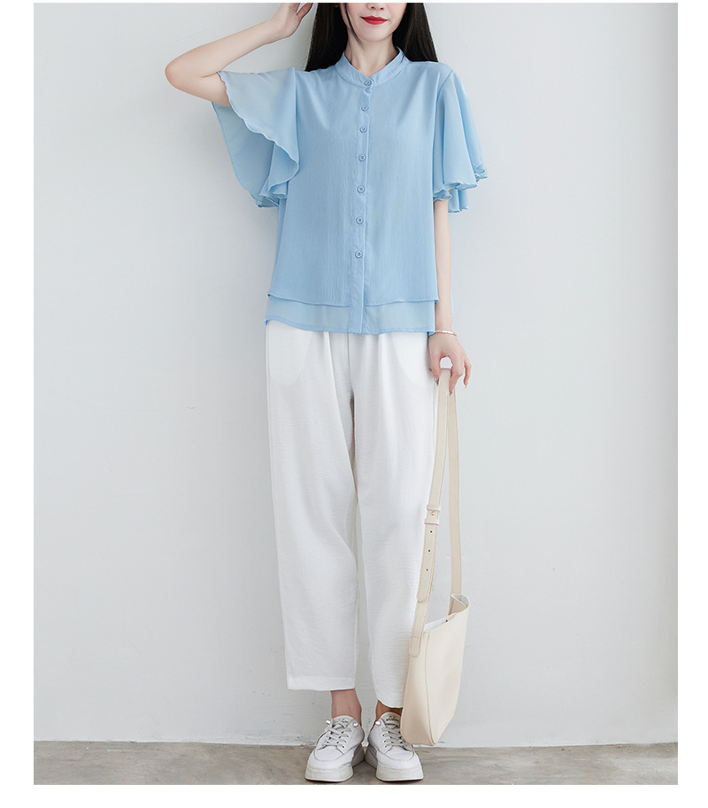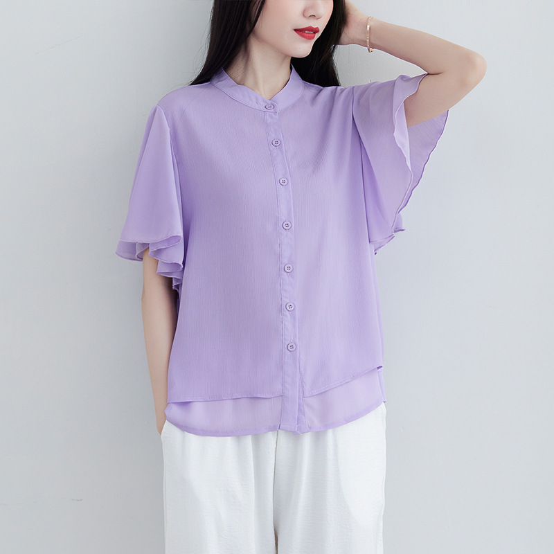 11가지 색상! 2022 여름 새로운 느슨한 스탠드 칼라 프릴 반팔 셔츠 여성 쉬폰 탑 크로스 보더 여성 의류스토어 가기
