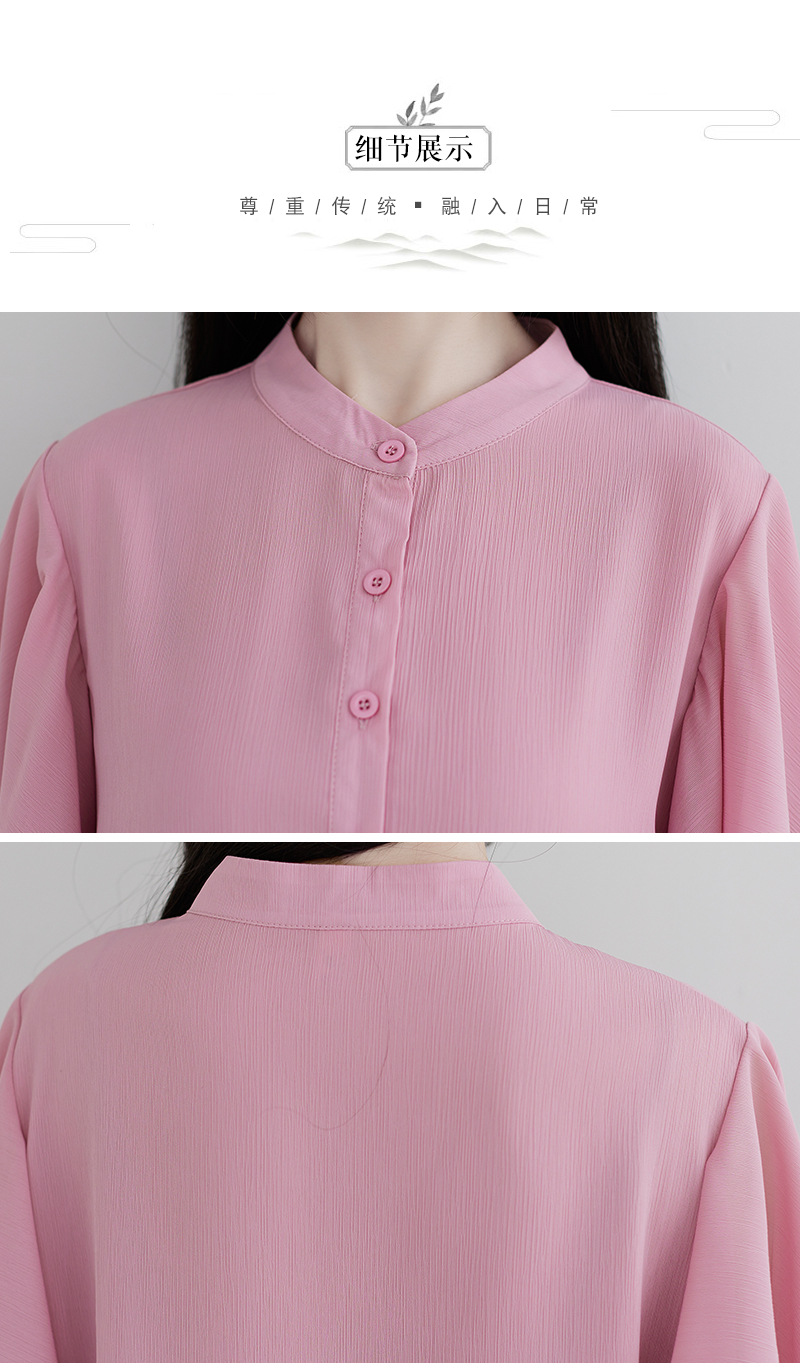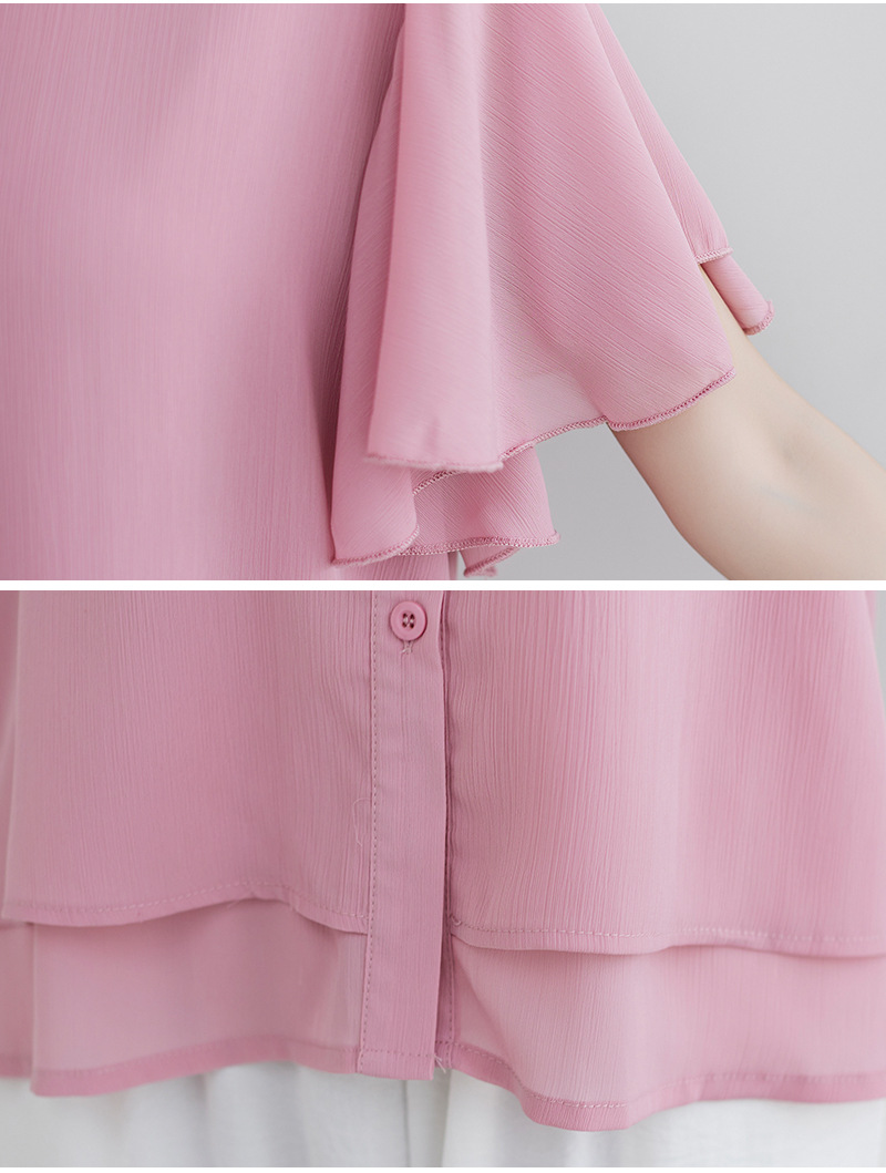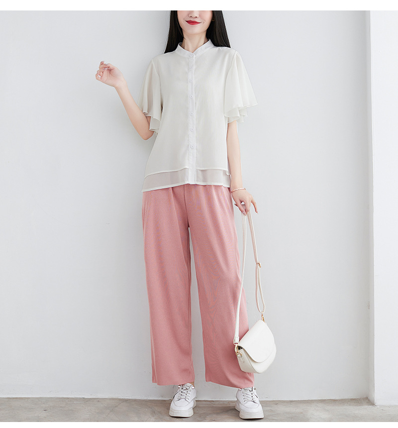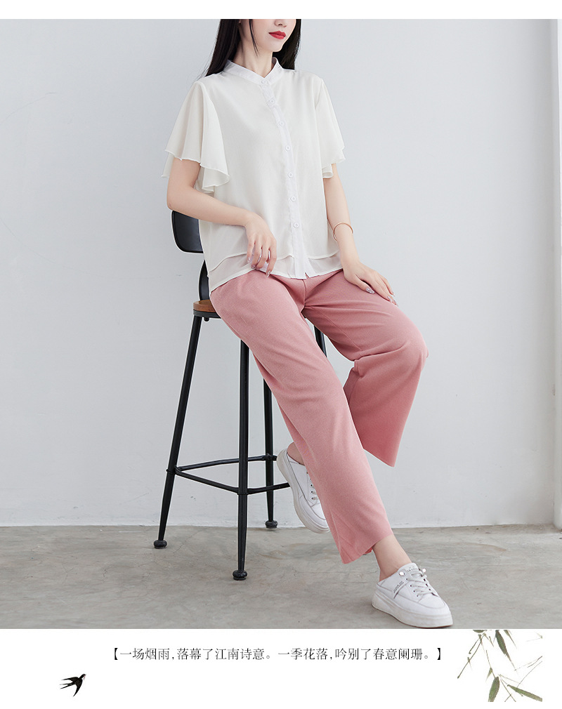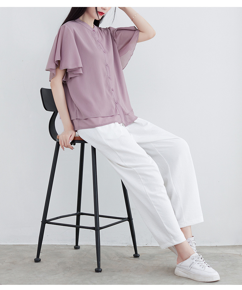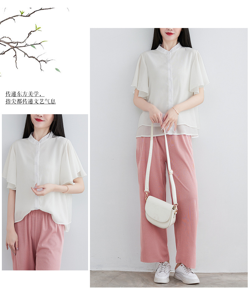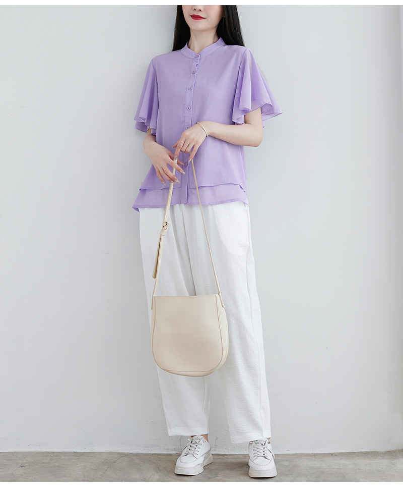 11가지 색상! 2022 여름 새로운 느슨한 스탠드 칼라 프릴 반팔 셔츠 여성 쉬폰 탑 크로스 보더 여성 의류스토어 가기