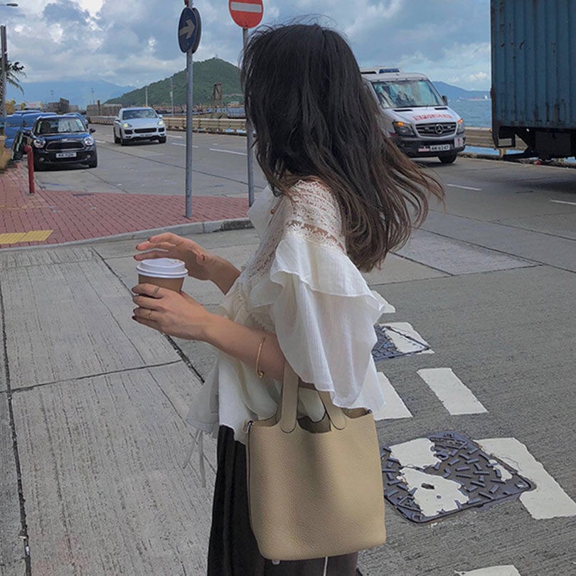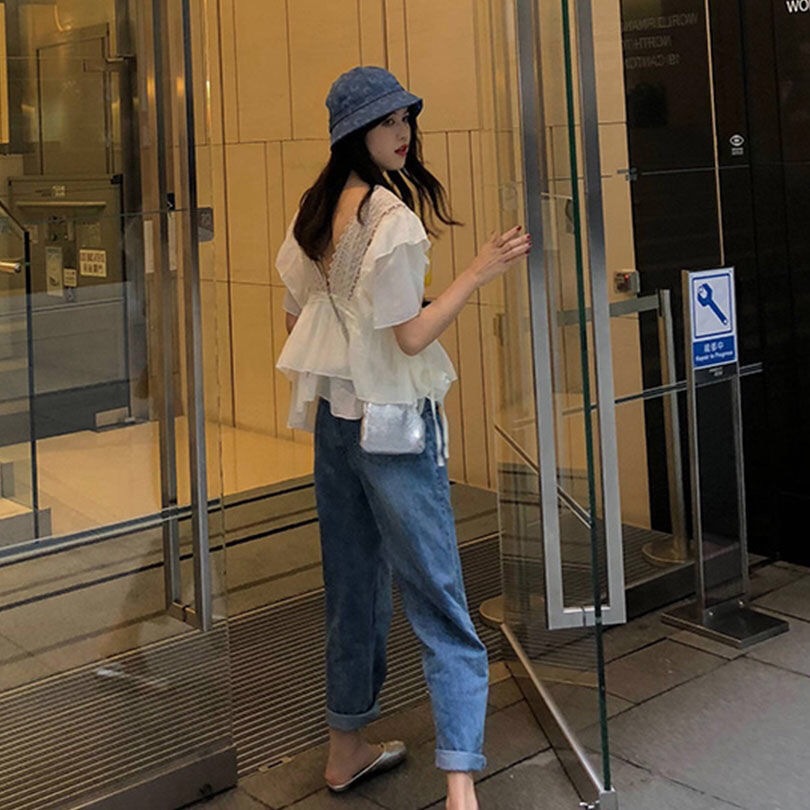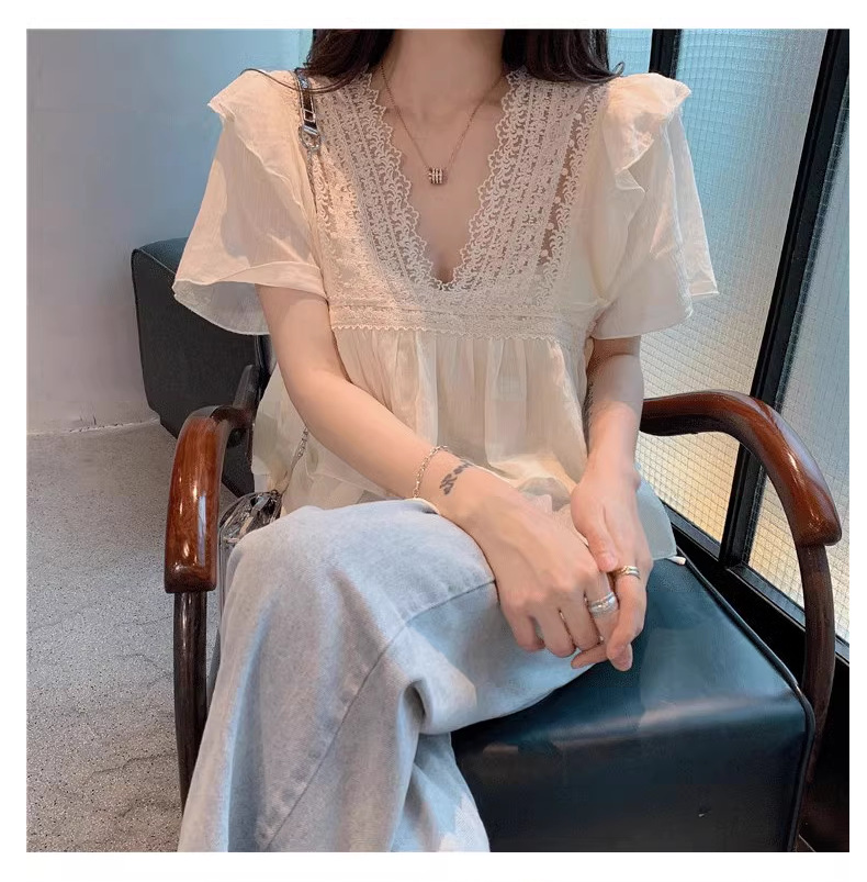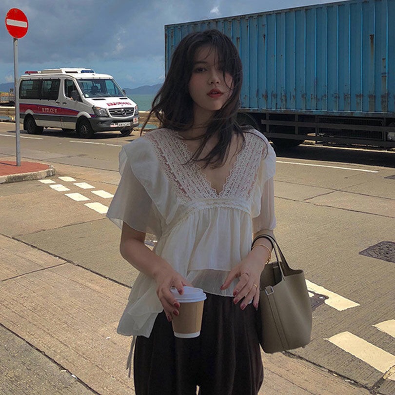 한국식 여름 새 달콤한 반팔 하이 엔드 쉬폰 셔츠 스타일리쉬 연령 감소 탑 러플베이스 셔츠스토어 가기