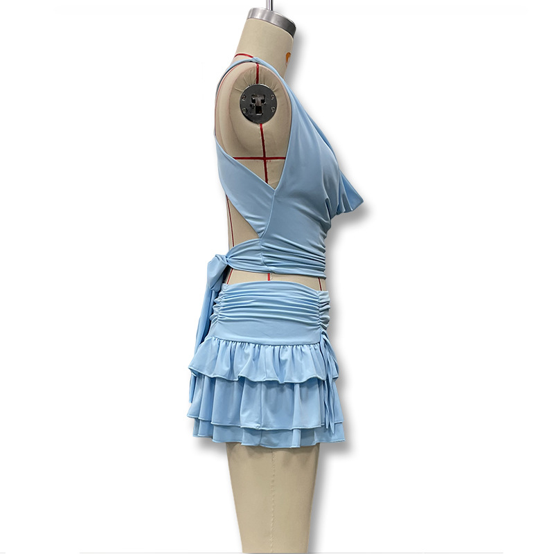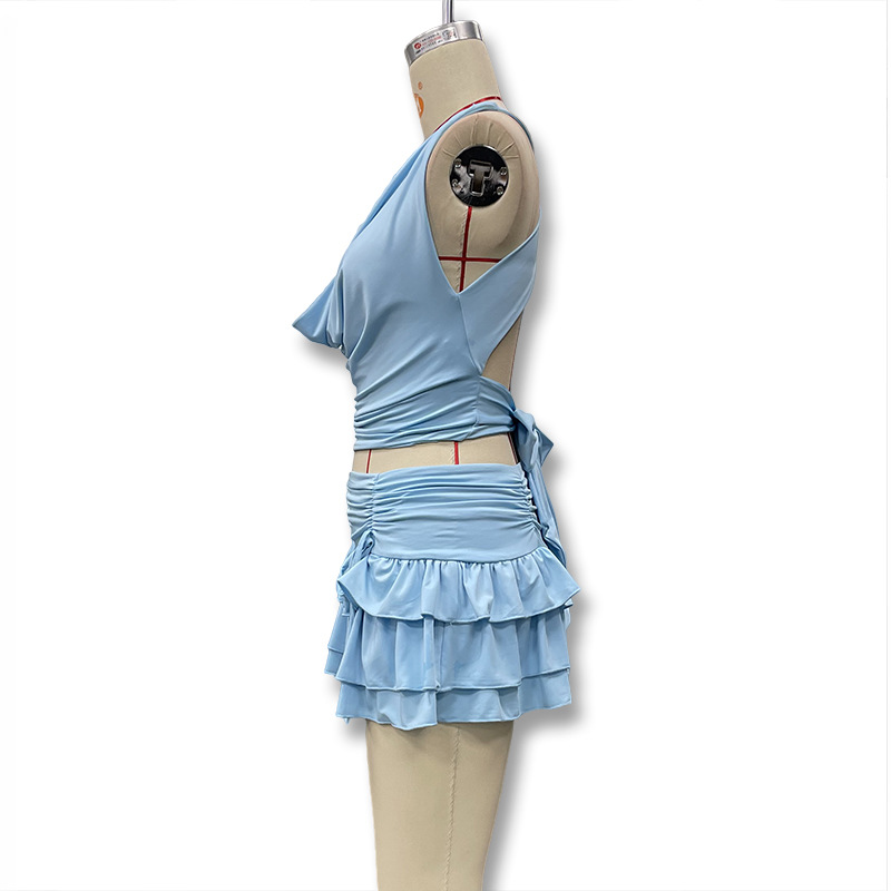 국경을 넘나드는 새로운 유럽과 미국 의류, 섹시한 중공 스윙 칼라, 등이 없는 스트랩 탑, 여성용 하이 웨이스트 케이크 스커트 투피스 세트